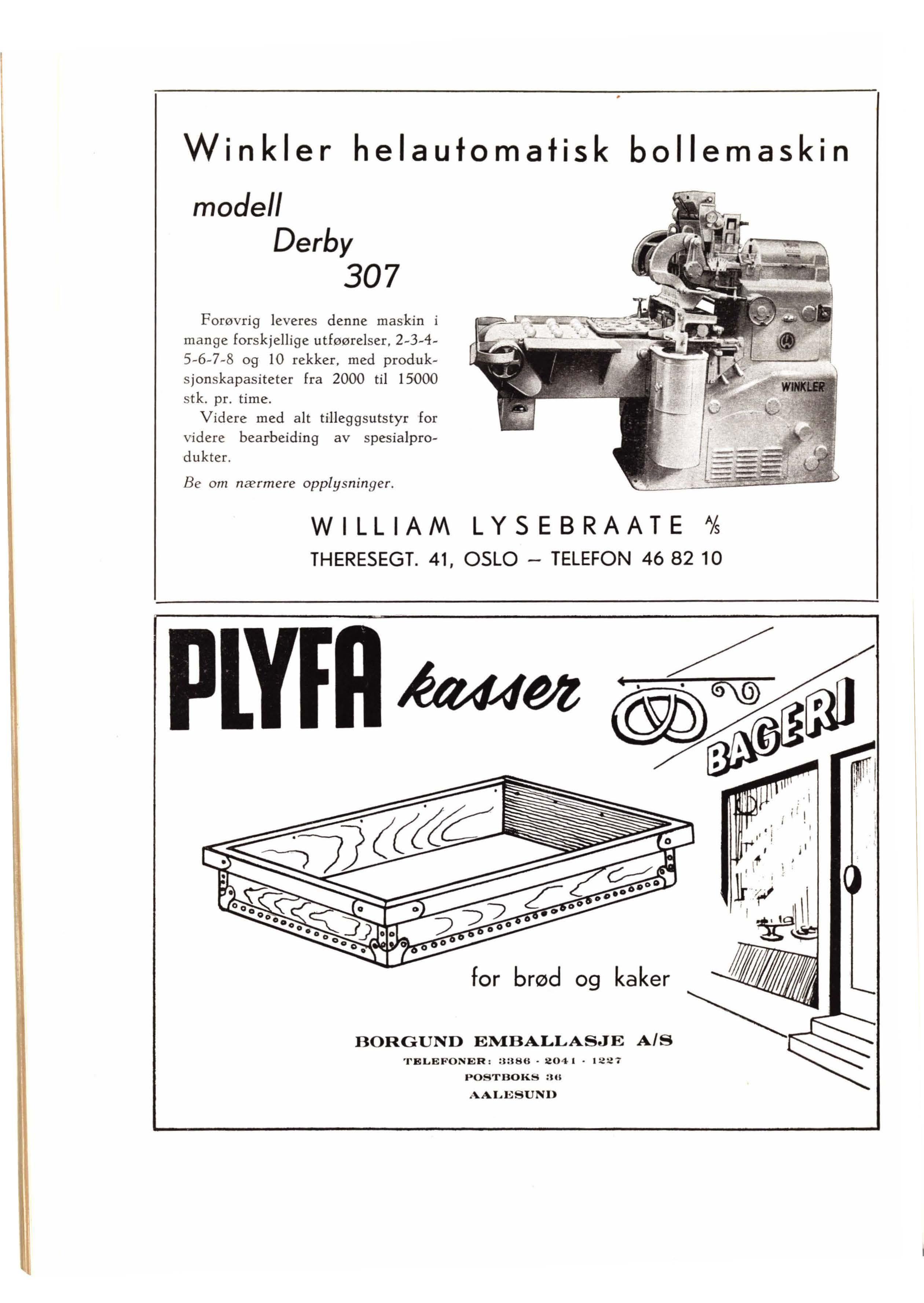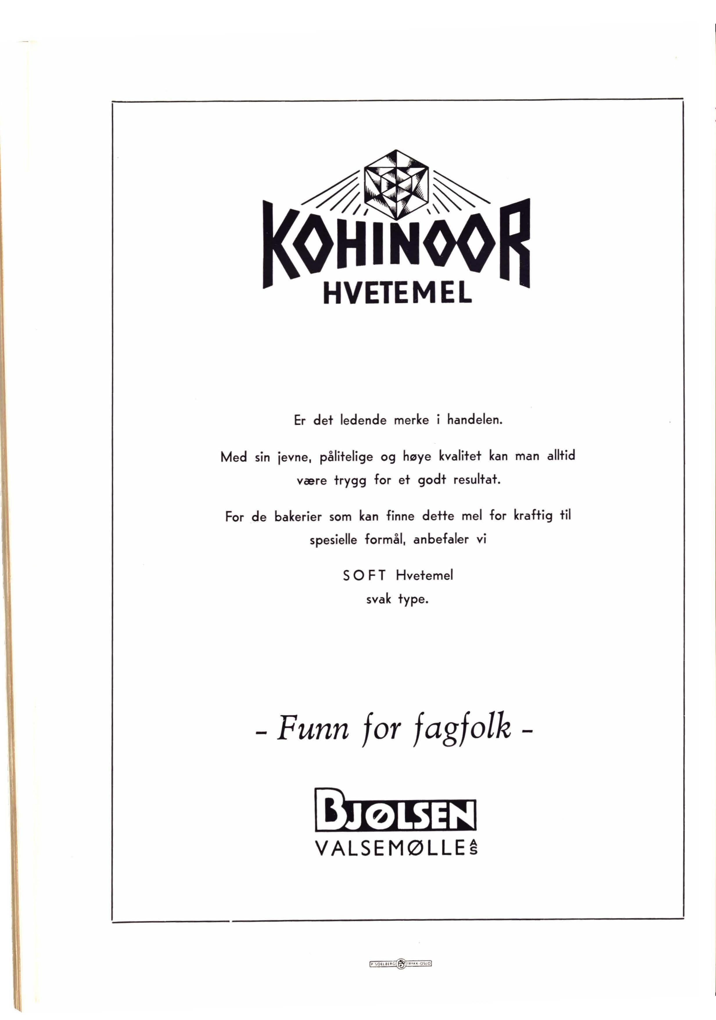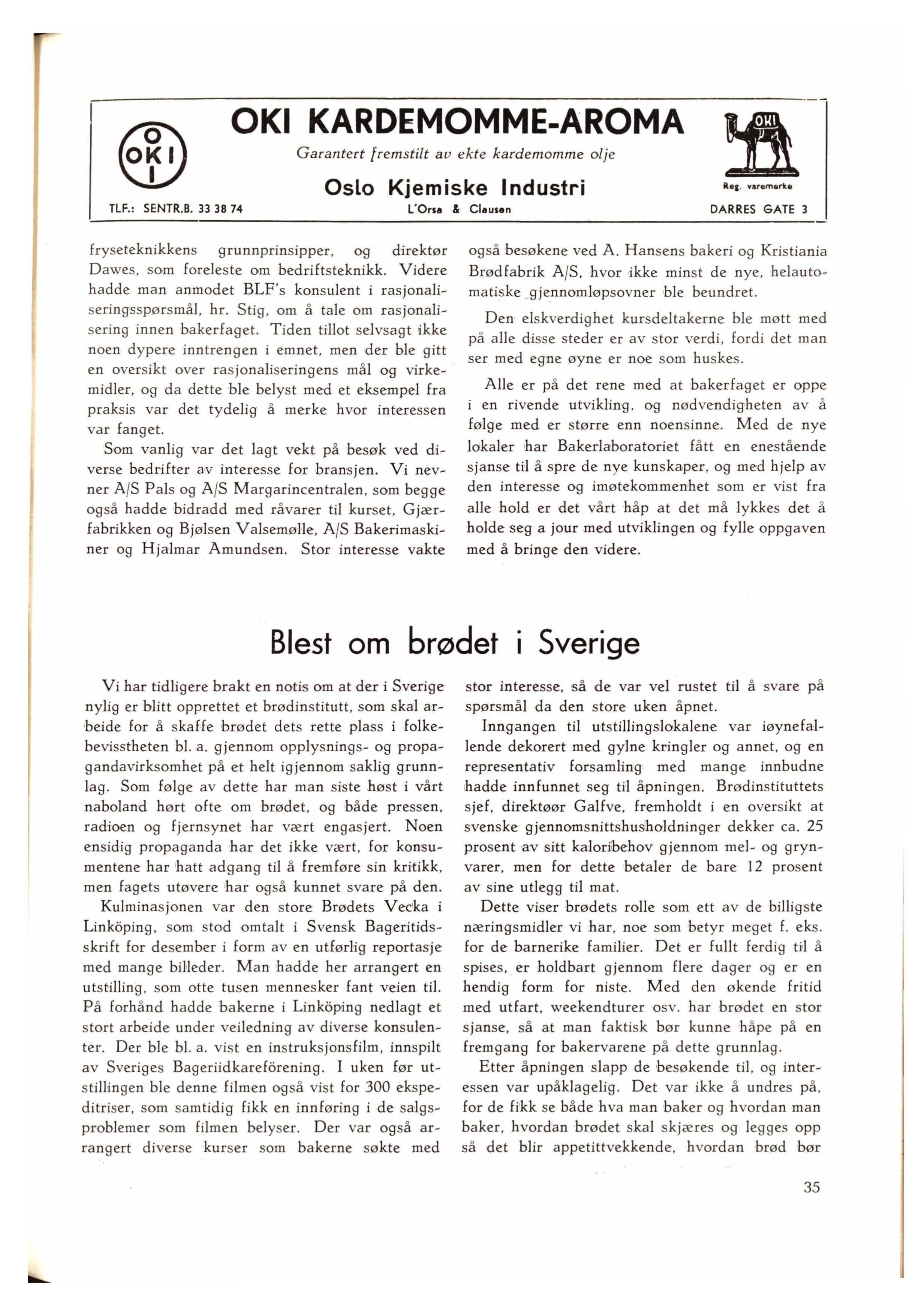 Vi har tidligere brakt en notis om at der i Sverige nylig er blitt opprettet et brødinstitutt , som skal arbeide for å s kaf,fe brødet dets rette plass i folkebevisstheten bl. a. gjennom opplysnings- og propagandavirksomhet på et helt igjennom sa klig grunnlag Som følge av dette har man siste høst i vårt naboland hørt ofte om brødet, og både pressen , radioen og fjernsynet har vært engasjert. Noen ensidig propaganda har det ikke vært, for konsumentene har hatt adgang til å fremføre sin kritikk , men fagets utøvere har også kunnet svare på den . Kulmina s jonen var den s tore Br ødets Vec1ka i Linkoping, so m stod omtalt i Svensk Bageritidsskrift for desem ber i form av en utførlig reportasje med mange billeder Man hadde her arrangert en utstilling , som otte tu se n menne s ker fant veien til. P å forhånd h a dde bakerne i Linkoping nedlagt et st ort ar beide under ve iledning av diverse konsulenter Der ble bl.a. vist en instruksjonsfilm, innspilt av Sverige s Bageriidkareforening I uken før utst illingen ble denne filmen og så vist for 300 ekspeditri s er, som samti dig fikk en innføring i de salgsproblemer som filmen bel yser. Der va r også arrangert di verse kur ser som bakerne søkte med