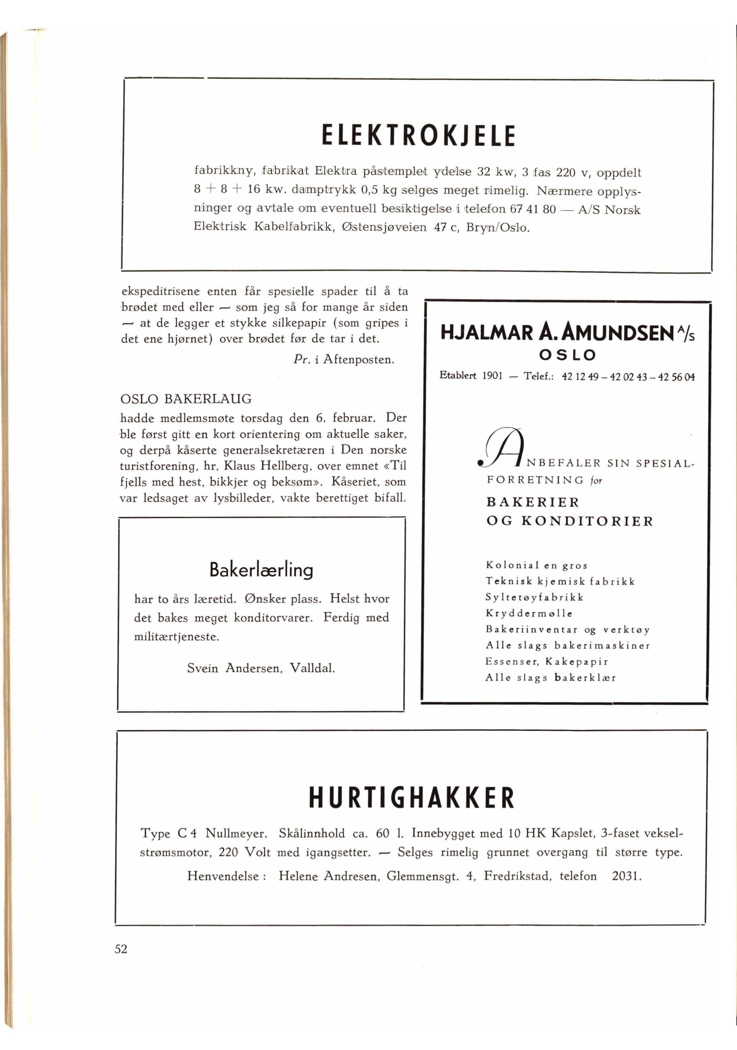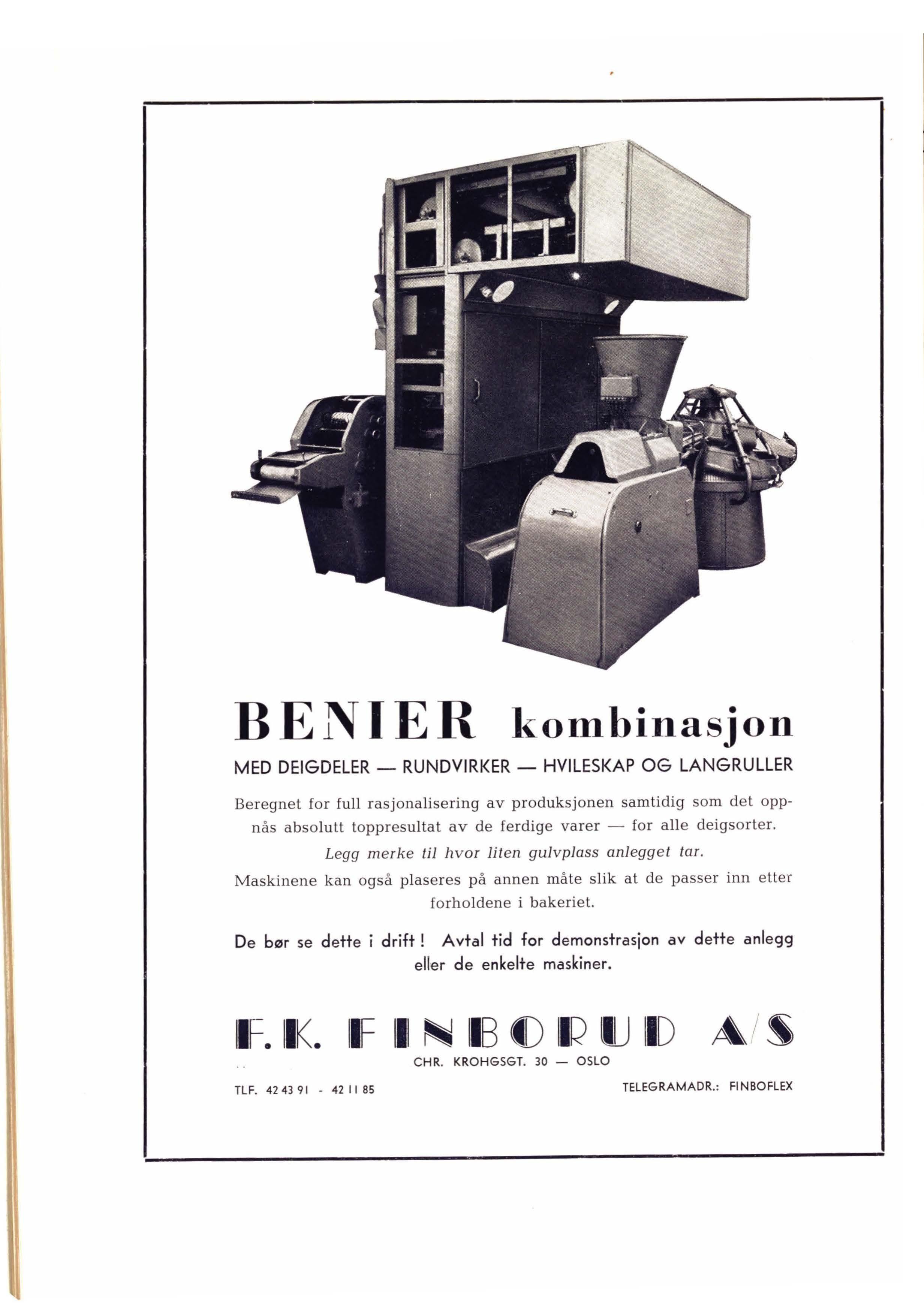 De kom. Fra Hjalmar Amundsen , A /S Bakerimaskiner og F. K. Finborud var der brakt opp eltemaskin, deigdeler, bollemaskin , smultkoker, si'ktemaskiner , male- og rivemaskiner, motordrevet deigvalsemaskin og fløtepiskere, som alle sammen ble prøvet og studert i drift av kursdeltakerne. Hva det betyr for disse å ha anledning til i ro og mak å studere de forskjellige typer kan ikke vurderes høyt nok, og det er vårt håp, selv om et s'1ikt tiltak er en økonomisk belastning for leverandørene, at ordningen også vil vise seg å være av verdi for disse, slik som den er i Amerika.