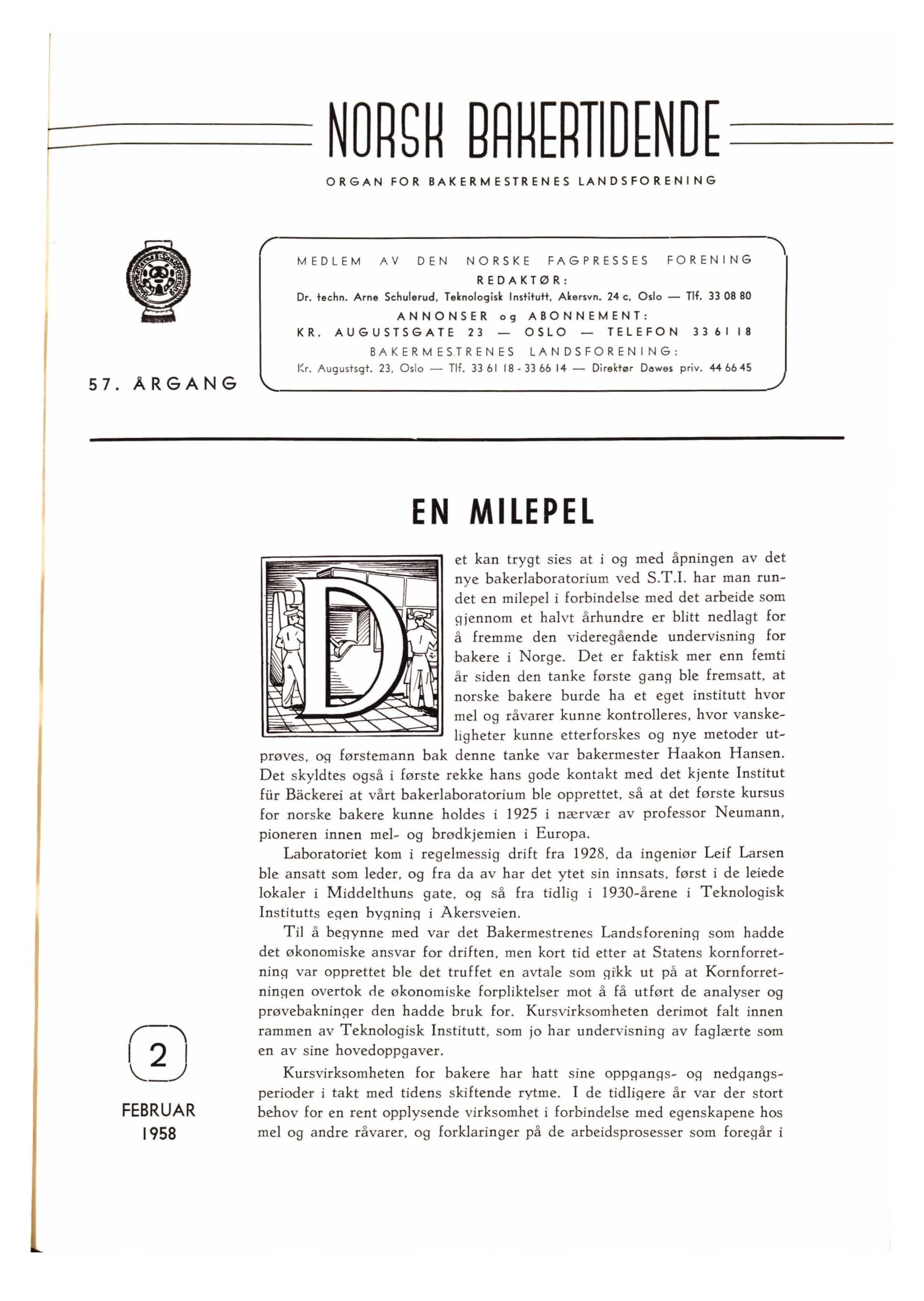et kan trygt sies at i og med åpningen av det nye bakerlaboratorium ved S.T.I. har man rundet en milepel i forbindelse med det arbeide som gjennom et halvt århundre er blitt nedlagt for å fremme den videregående undervisning for bakere i Norge. Det er faktisk mer enn femti å r siden den tanke første gang ble fremsatt , at norske bakere burde ha et eget institutt hvor mel og råvarer kunne kontrolleres, hvor vanskeligheter kunne etterforskes og nye metoder utprøves. og førstemann bak denne tanke var bakermester Haakon Hansen. Det skyldtes også i første rekke hans gode kontakt med det kjente Institut fiir Backerei at vårt bakerlaboratorium ble opprettet , så at det første kursus for norske bakere kunne holde s i 1925 i nærvær av professor Neumann, pioneren innen mel- og brødkjemien i Europa