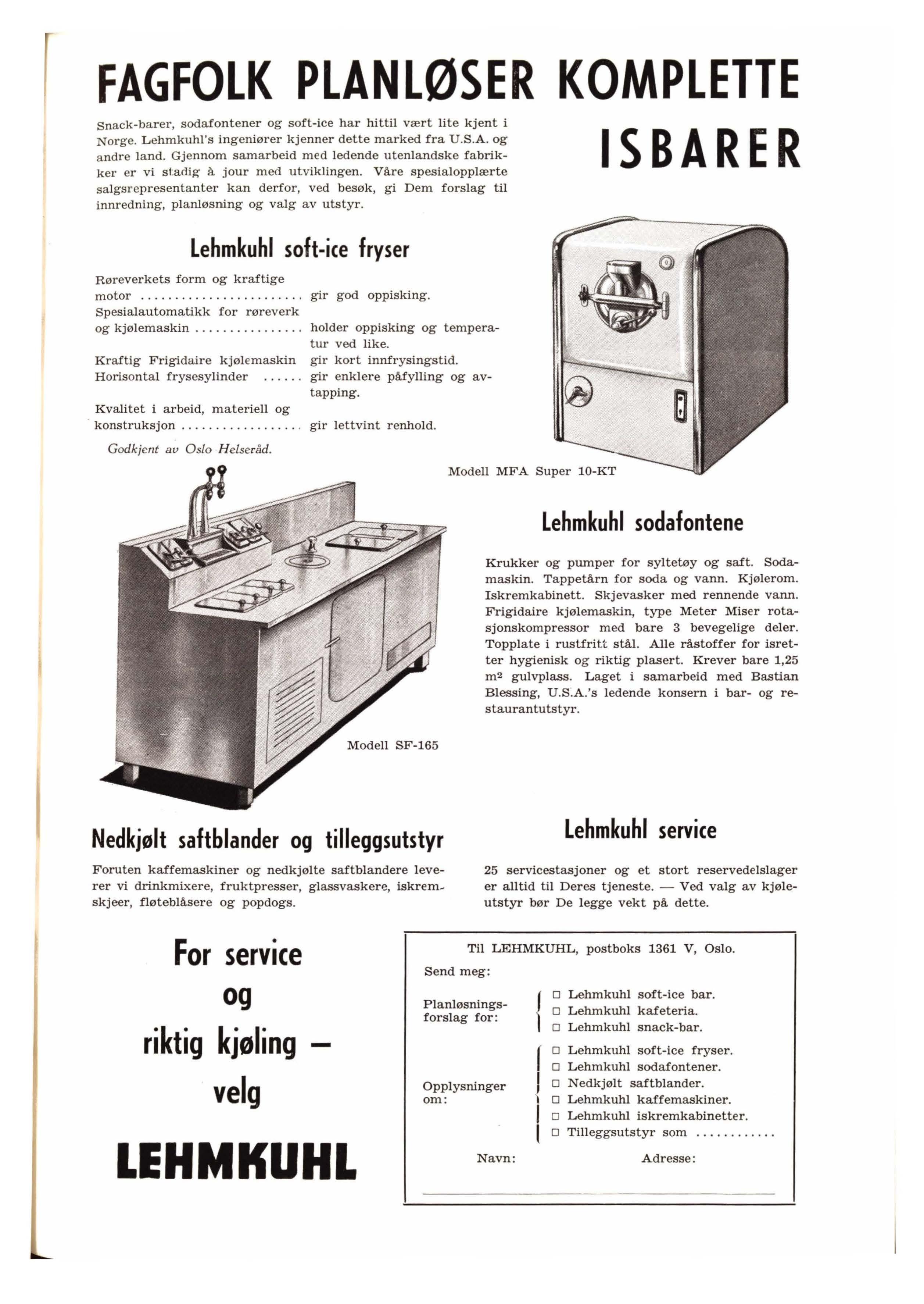 snack-barer, sodafontener og soft-ice har hittil vært lit e kjent i Norge L ehmkuhl's ing en iører kj enner dette marked fra U.S.A. og andre l and. Gjennom samarbeid med ledende ut e nlandske fabrikker er vi starl.ig a jour med utviklingen. Våre spesialopplærte salgsrepresentanter kan derfor , ved besøk, gi D em forslag til innredning, planløsning og valg av utstyr.