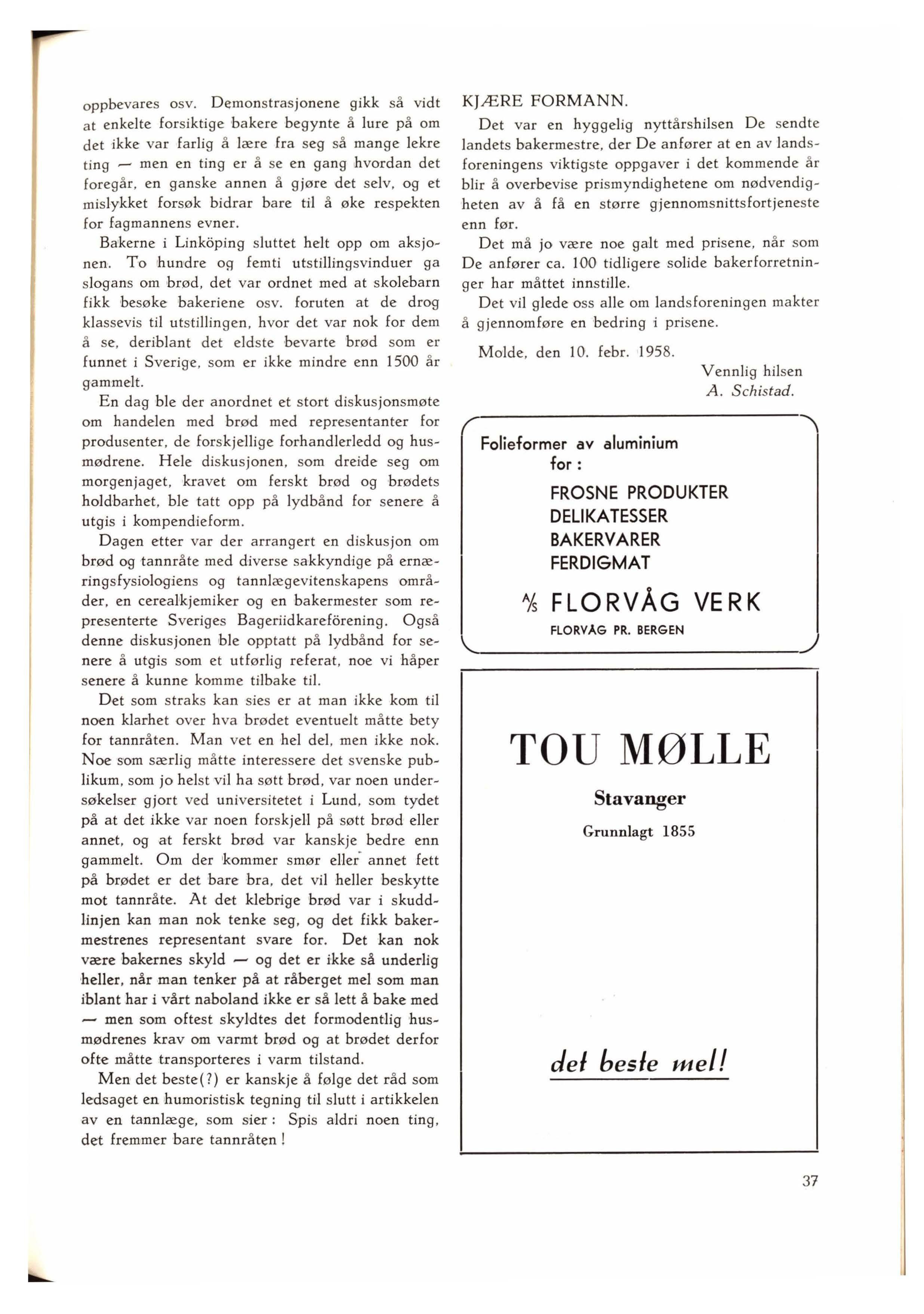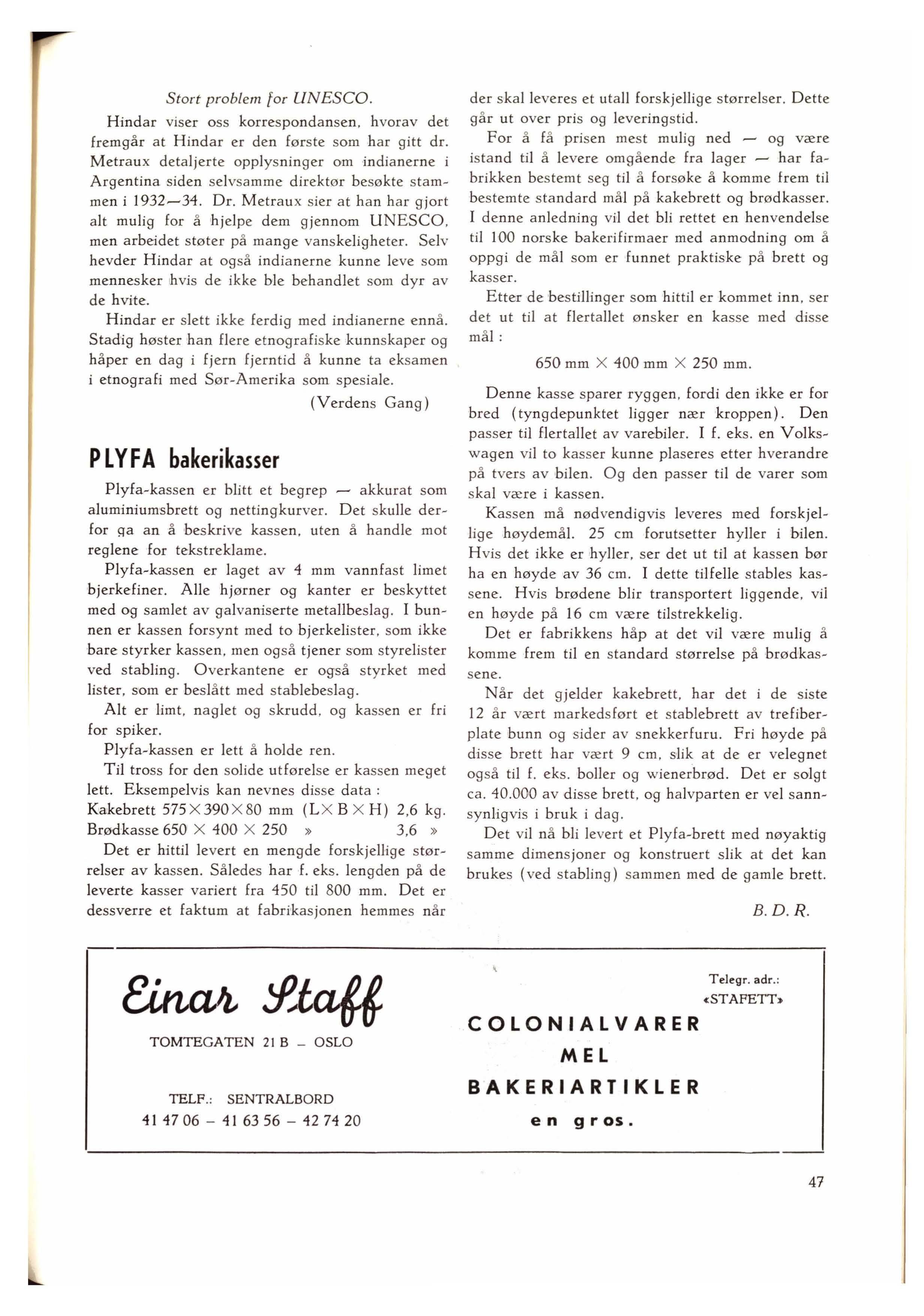 Dette viser brødets rolle s om ett av de billigste næringsmidler vi har , noe som bet y r meget f. eks for de barnerike familier. Det er fullt ferdig tH å spises, er holdbart gjennom flere dager og er en hendig form for niste . Med den ø kende fritid med utfart, weekendturer o sv har brødet en stor sjanse, så a t man fakti s k b ør kunne h å pe på en fremgang for bakervarene p å dette grunnlag.