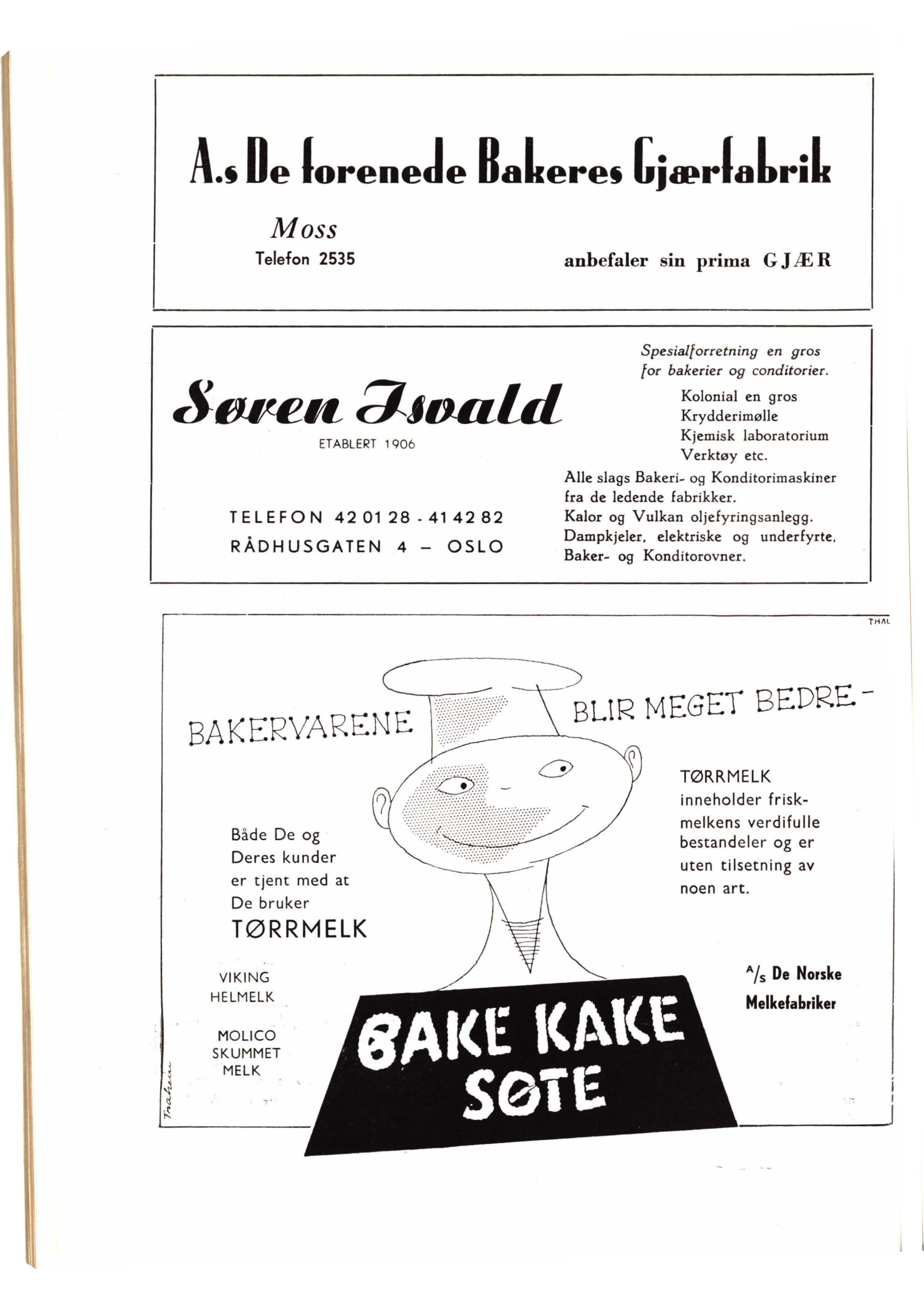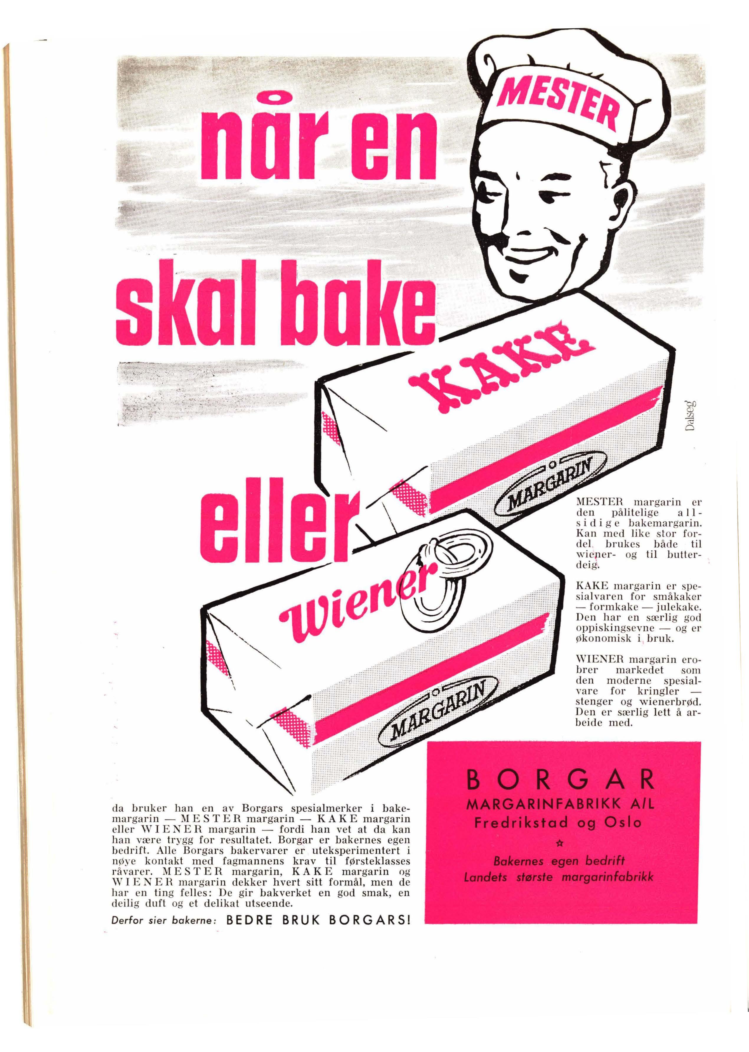 cia bruker han e n av Borgars spesialmerker i b a k emargarin - 1\1 ESTER margarin - KAKE margarin ell er WIENER margarin - fordi han ve t a t ci a k a n han være tr ygg for resultatet. Borgar e r bakernes ege n bedrift. Alle Borgars bakervarer er ut e ksp e rim e nt er t i nøye kontakt med fagmannens krav ti l f ø r s teklass es råvarer. MESTER m a r ga rin , KAKE mar gar in 0g WIENER margarin d e kk e r hvert sitt formål, men de har en tin g fe ll es: De gir bakv e rk e t e n god smak, e n deilig duft og et delikat ut see nd e . Derfor sier bakerne : BE D RE BRU K B O R G A R SI