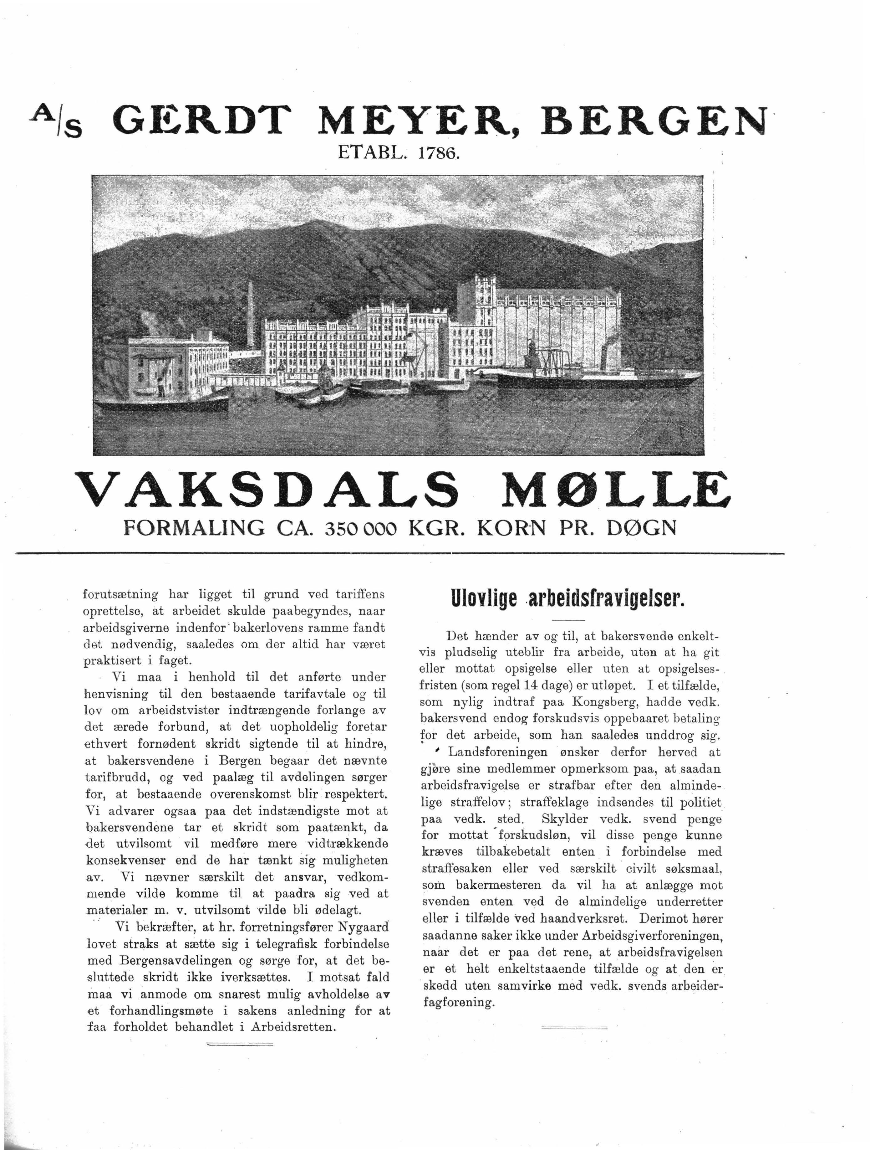 Vi maa i henhold til det anfø rte under henvisning til den bestaaende tarifavtale og til lov om arbeidstvister indtrængende forlange av det ærede forbund, at det uopholdelig foretar ethvert fornødent skridt sigtende til at hindre, at bakersvendene i Bergen begaar det nævnte tarifbrudd, og ved paalæg til avdelingen sørger for at bestaaende overenskomst blir resp ektert. ' Vi advarer ogsaa paa det indstændigste mot at bakersvendene tar et skridt som paat ænkt, da -det utvilsomt vil medføre mere vidtrækkende konsekvenser end de har tænkt sig muligheten av. V i nævner særskilt det ansvar, vedkommende vilde komme til at paadra sig ved at materialer m. v. utvilsomt vil de bli ødelagt.