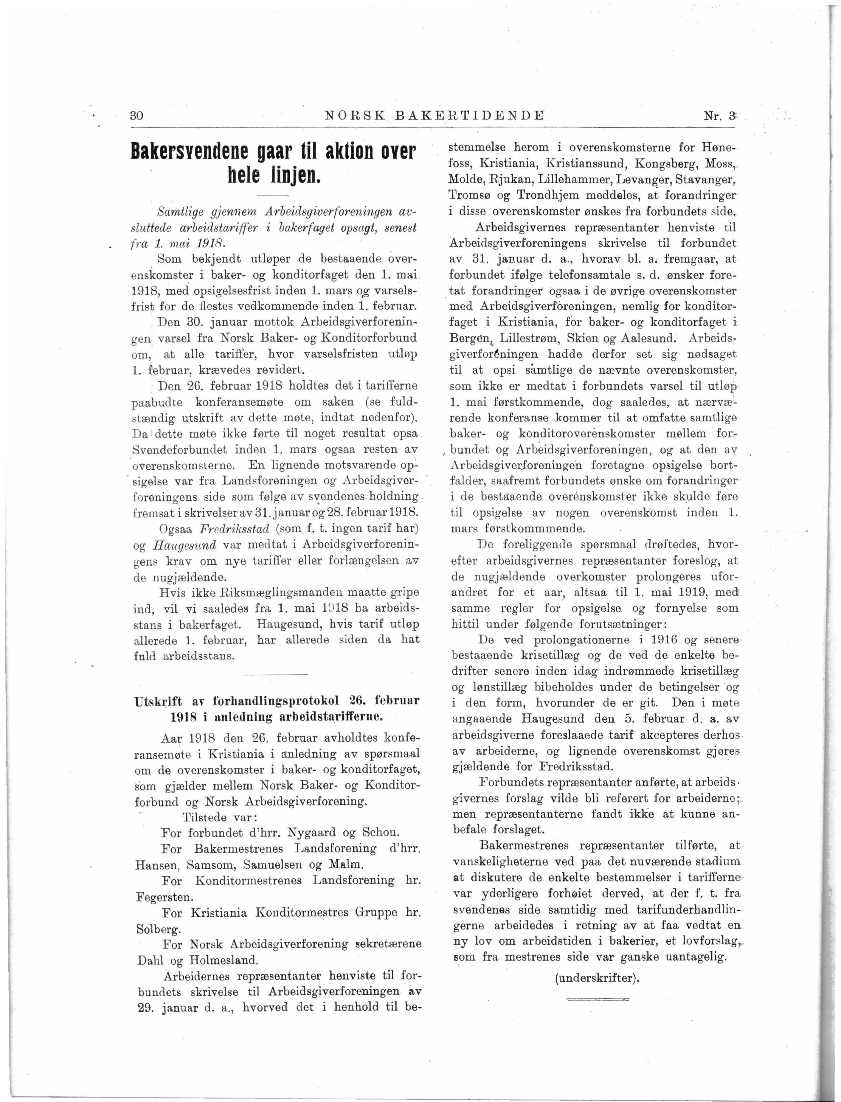 Som bekjendt utløper de be st a ae nd e overens komste r i baker- og konditorfaget den 1. mai 1918, med op sigelsesfri st inden 1. mars og v a rselsfrist for de fle st es vedkommende inden 1. februar.