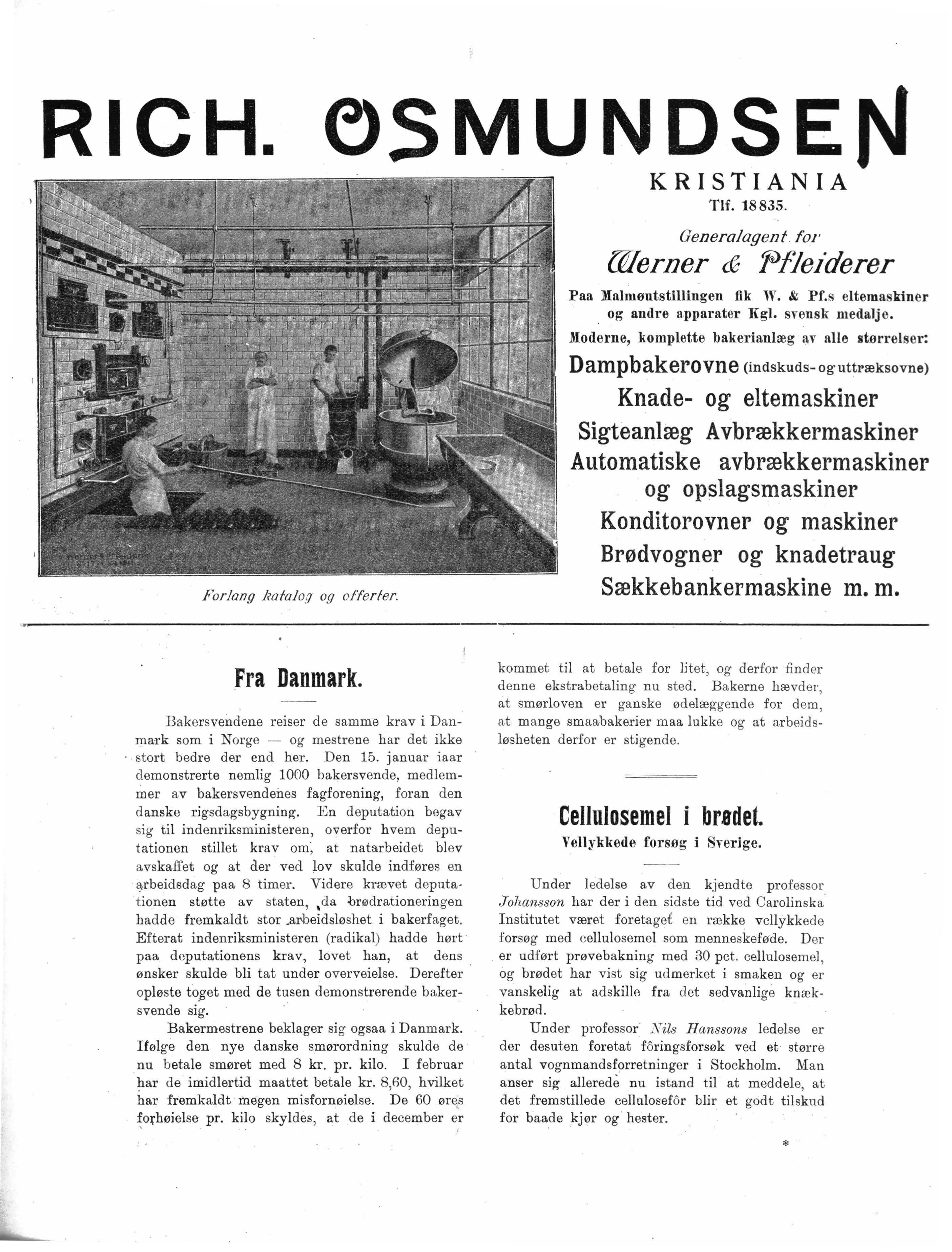 lndho l d : Fra Danmark - : Ce llul osemel i brødet. - 'l'il de bake~mestre; .soµi endnu ikk e er medlem:1er a~ Ba erme stre s -L-~ndsforenin g. - Arbeidskon' flikter. - Ulovlige arbeidsfrav igelser. Bakersvendene' gaar til &k tion over hel e linj en. - Haugesunds bakerm es tre indtr æ der i Bak ermestren es L andsfor en ing - Skiens bakerm estre optr æ r lodre t overfor F1·ovianteringsraade t - Fra Drammen. - Døds fa ld - Fiskens utnyttelse til at drøi (' brødet. - Ikke pot etm el til "kak er ut en kort." '