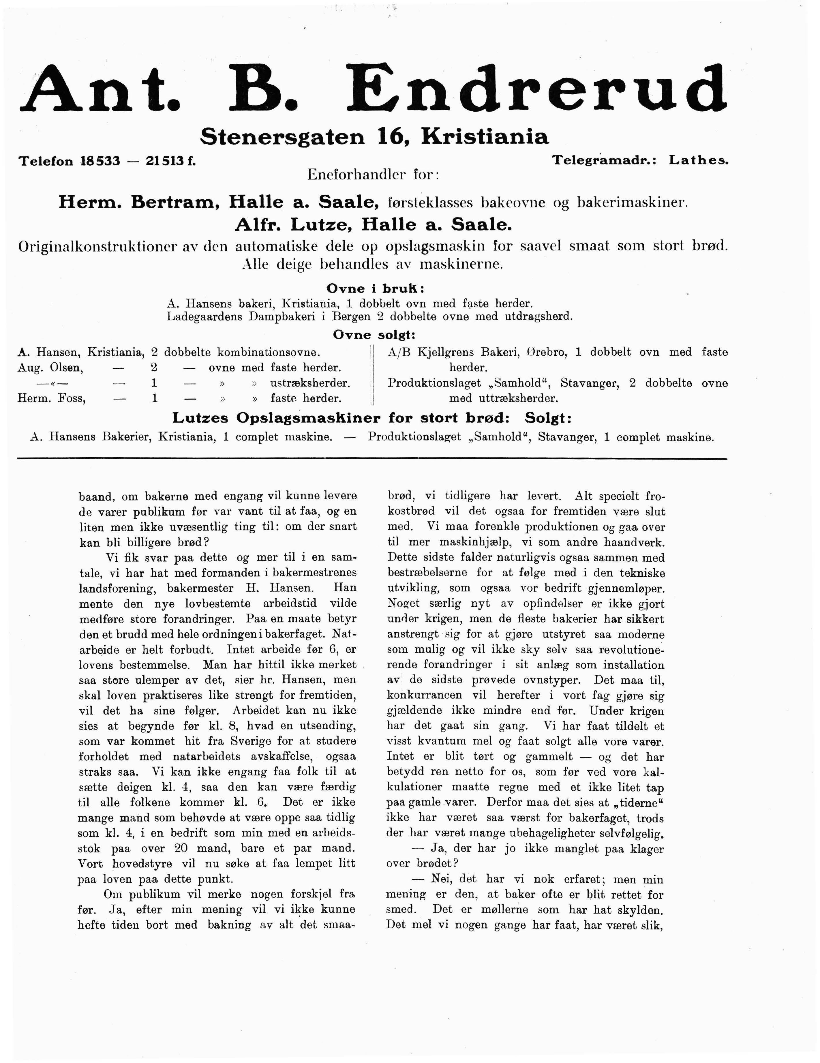 A. Hansens Bakerier, Kristiania, l complet maskina. - Produktionslaget "Samhold", Stavanger, 1 complet maskine.