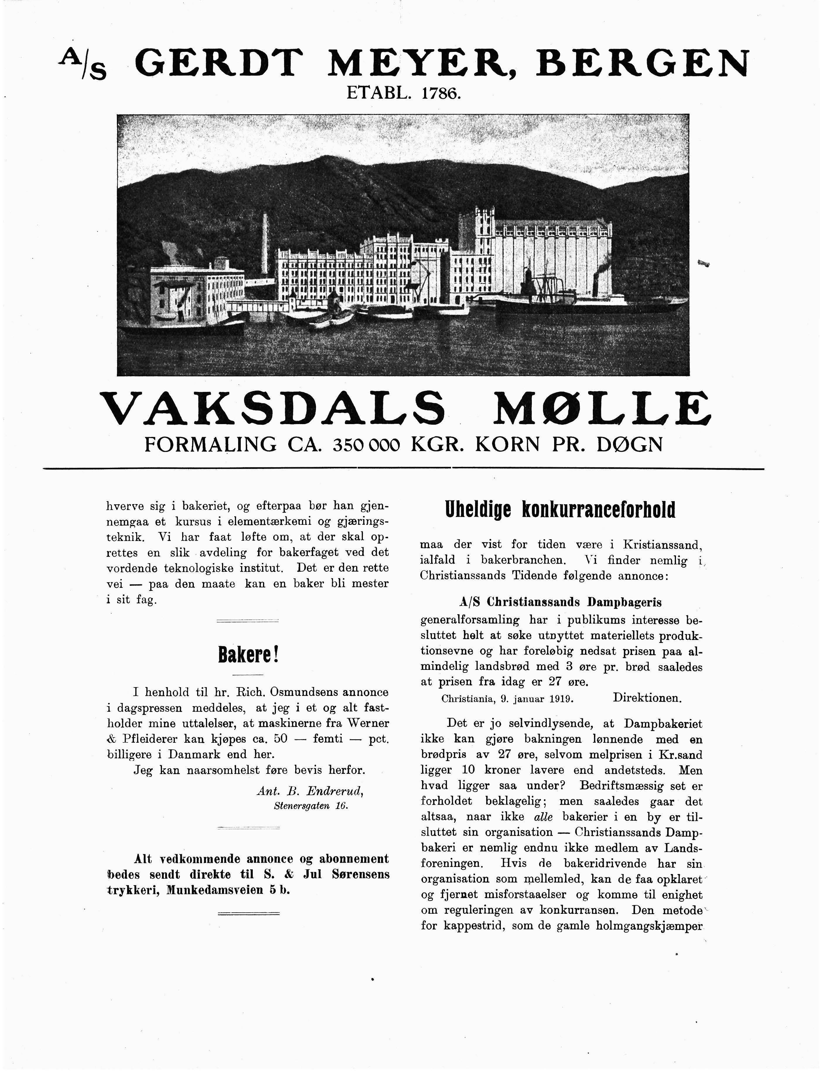 5. februar 1919 avholdtes den ordinære generalforsamling i Bergen s Bak ermest e rforening. Av aarsberetningen, der blev oplæst av formanden, fremgik at foreningen i 1918 hadd e hat det travl este aar som kunde opvises. Spe• cielt hadde bestyrelsen hat meget arbeide og mange konferanser med Provianteringsraadet. Dette gjaldt saavel skriftvekslen som mundtlige konferanser, baade i anlednin g av brødpriser og ellers forskjellige forhold. Svendelønningerne har som bekjendt i aarets løp steget ganske betydelig. For Bergens vedkommende blev saaledes den ordinære løn efter tiniffens revision i mai kr. 62,00 pr. uke + klædesgodtgjørelse. Hertil er senere indrømmet 2 frivillige dyrtidstillæg a kr. 5,00 pr uke, nemlig i oktober 1918 og nu sidst i januar, saaledes at d e n almindelige løn nu er ialt kr. 72,00 pr. uke for ·gifte arbeidere. Foruten tillægget til svenden e, har man ogsaa maattet gaa til en række dyrtidstillæg til de