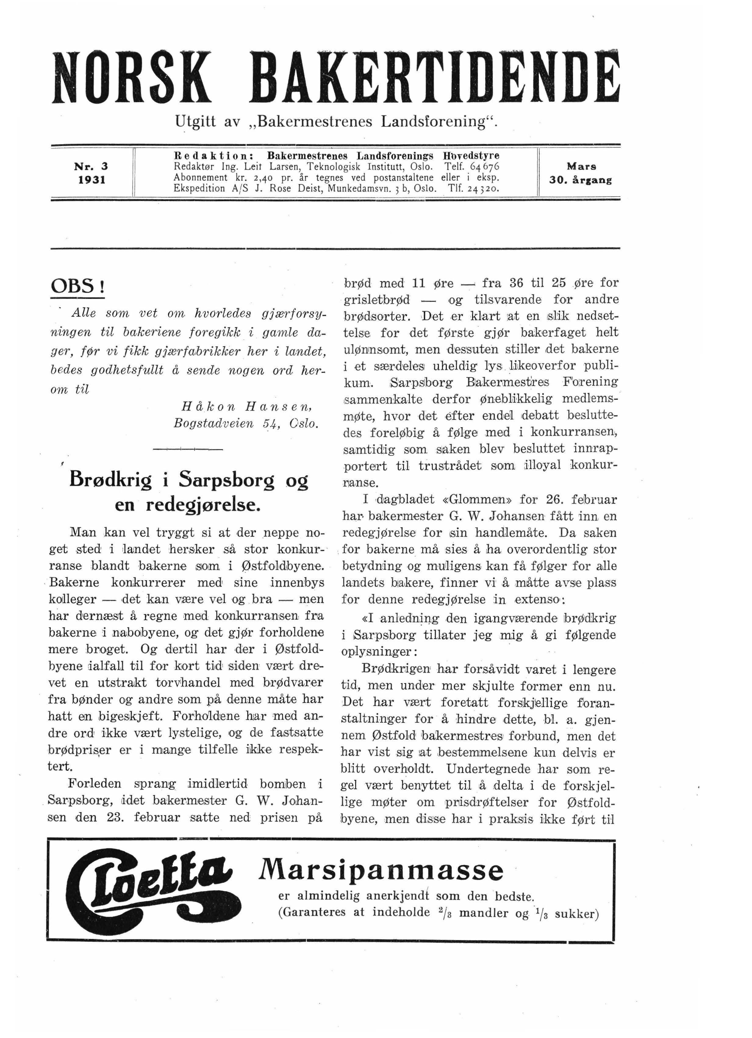 landets bakere, finner vi' å måtte avsie plas'S for denne redegjørelse in extenso•: «I anlediniI).g .den igangvær,ende ibrØd:krig i Sarpsborg tillater jeg mig å gi følgende oplysninger : Brødkr:igen har forså vidt varet i lengere tid, men under mer skju lt e former enn nu. :Det har vært foretatt forsikj!e11ige foranstaltninig.er for å hindre dette, bL a. gjennem Østfold· balrnrmestresi forbund, men det har vist .sig :at bestemmelsene ku.n delvis er blitt overholdt . Undertegne-de har som regel vært benyttet til ,å delta i de forskjellige møter om priiS:d:rØftelser for Østfoldlbyene, men d iss,e har i prakSJis ikke f Ørt tiI