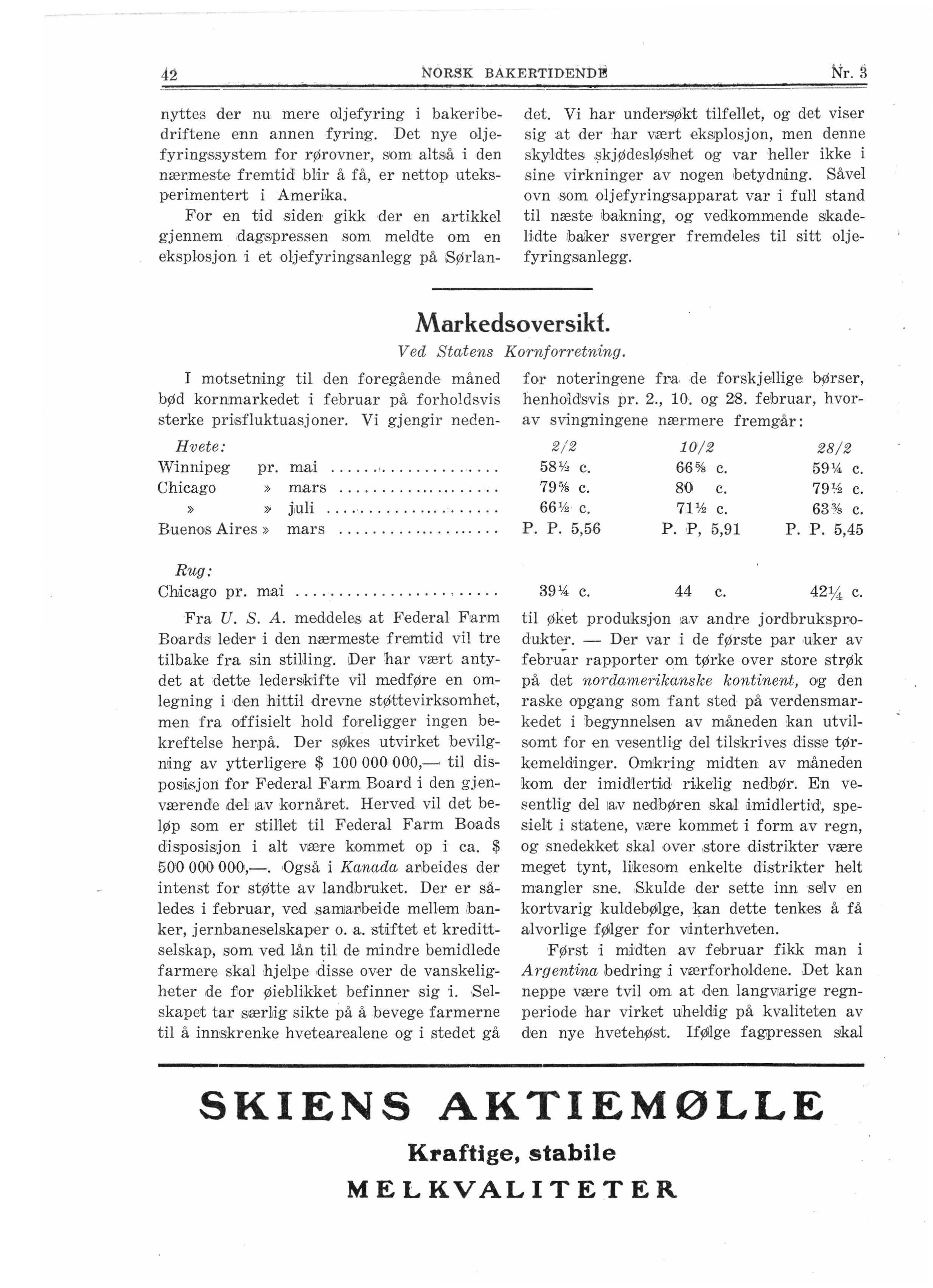 39¼ C. 44 C. 42 ¼ c til Øket produiksjon :a.v andre jordbruksprodukter. - Der var i de første par ,uker av februar rapporter om tørke over store strøk på det nordamerikanske kontinent, og den raske apgang som fant sted på verdensmarkedet i begynne1sen av måneden kan utvilsomt for en vesentlig del tilskrives dis1S'e tørkemeldfoger . Omikring midten av måneden kom der imid'lertid rikel ig nedbør. En vesentlig del 1av nedbøren skal ,imid l ertid', spe~ siel,t i statene, v,ære kommet i form av regn, og snedekket skal over ,store distrikter vær:e meget tynt, likesom enke lte distrikter he lt mangler sne. Stkulde der sette inn seilv en kortvarig ku1debØlge, kan dette tenkes å få alvorlige fØlger for viinterhveten.