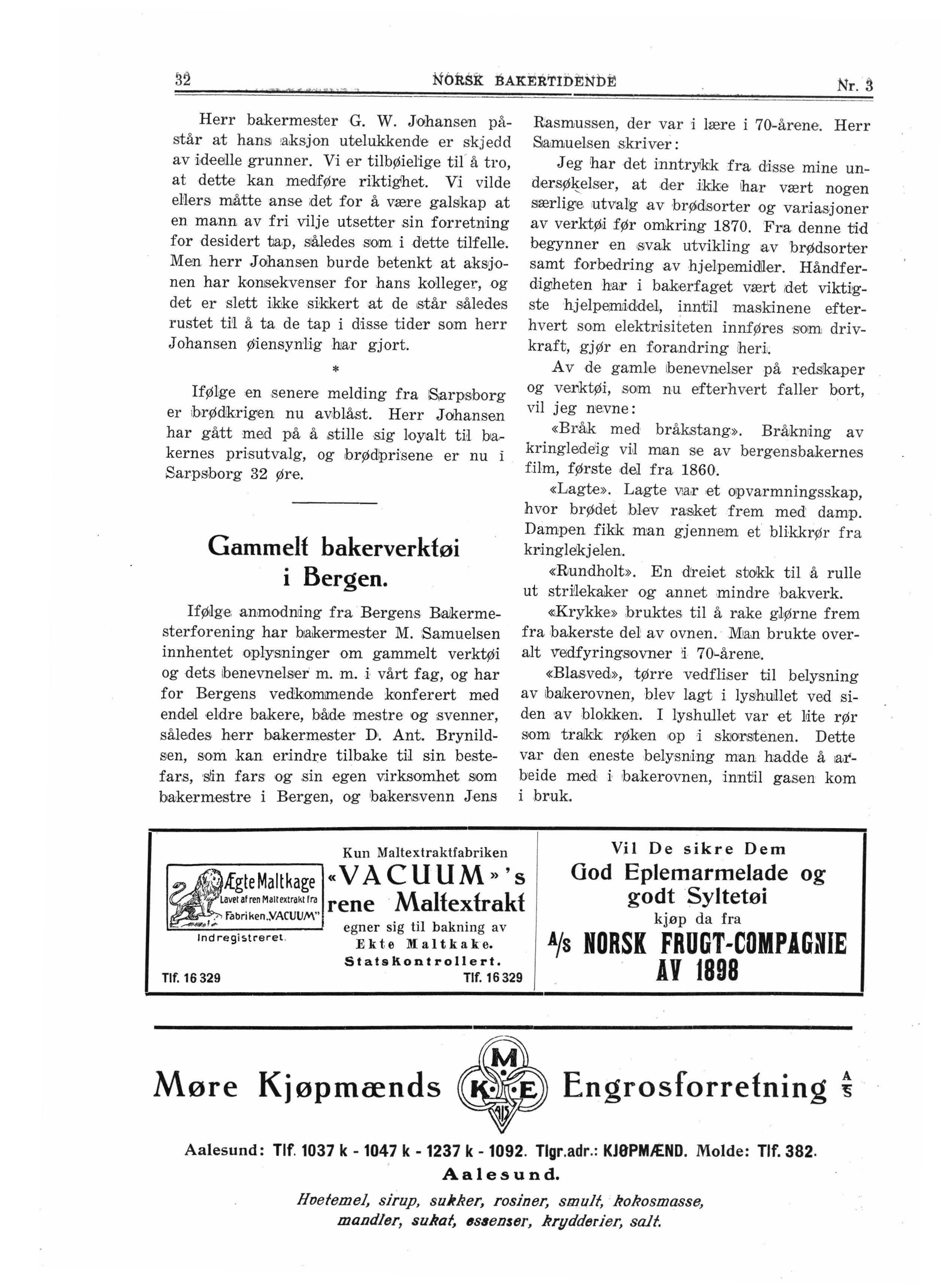 IfØ~g,e; anmodntlng fra Bergens B~ermesterforening har b:aikermester M. :Samuelsen innh entet oplysninger om gammelt verktøi og dets !benevnelser' m.m. ,i, vårt fag, og har for Bergens vedkommende konferert med endel •eldre bakere, både mestre og svenner, således herr b,akermæter D. Ant. Brynild~ sen, s,om kan er.indre tilbake til sin bestefars, slin fars· og .sin egen v:irksomhet siom bakermestre i Bergen, og baker,s,venn J ,ens