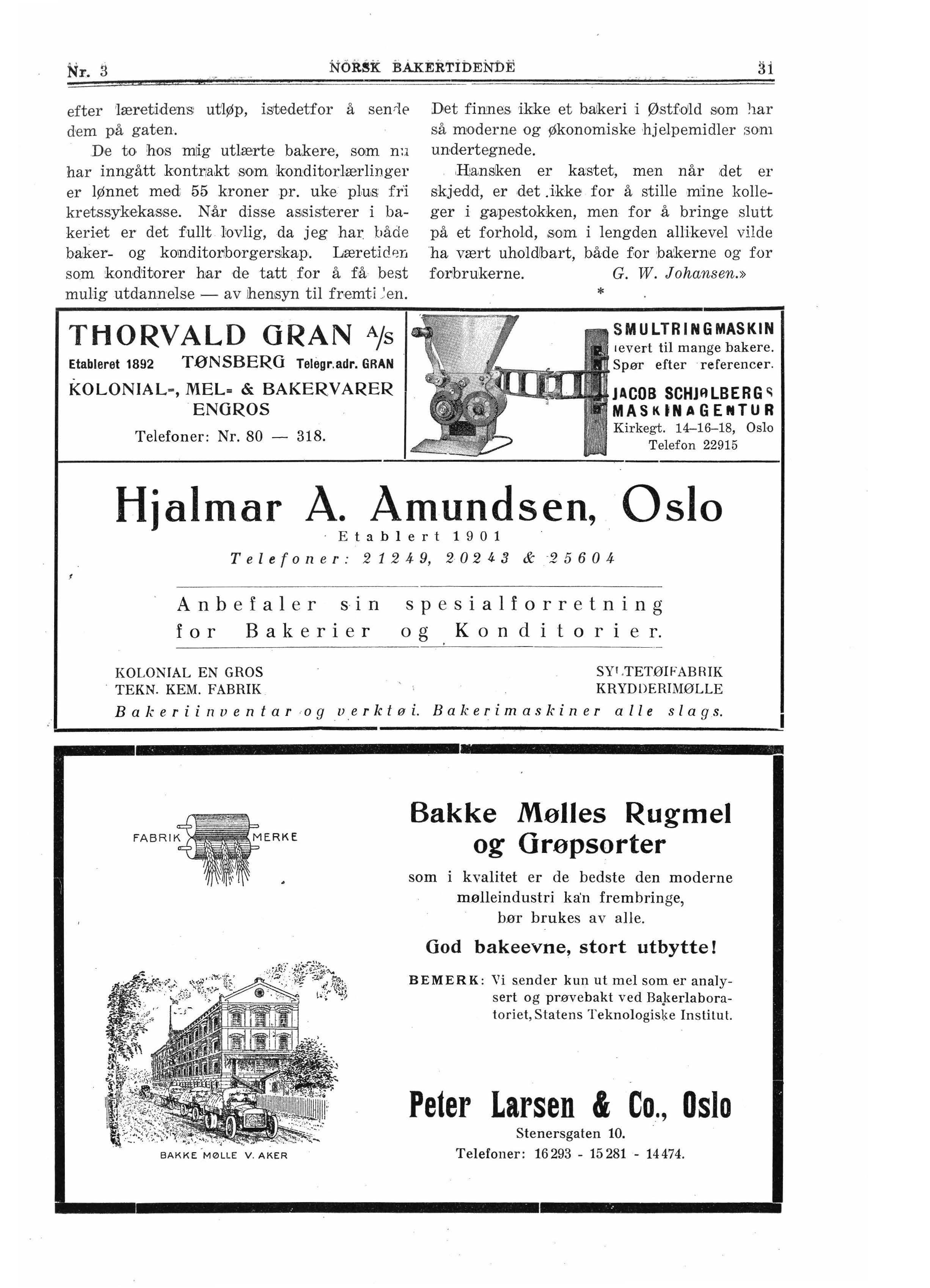 De to hos mig utlærte bakere, som n:1 har inngått kontnakt som konditorlærlinger er lønnet med 55 kroner pr. uke plu,s fri kretssykekasse. Når disse as,sisterer i bakeriet er det fullt lovlig, da jeg har. både baker- og k0!ndito11borgerskap. Læretfri% som konditorer har de tatt for å få best mulig utdannelse - av !hensyn til fremti ,len.