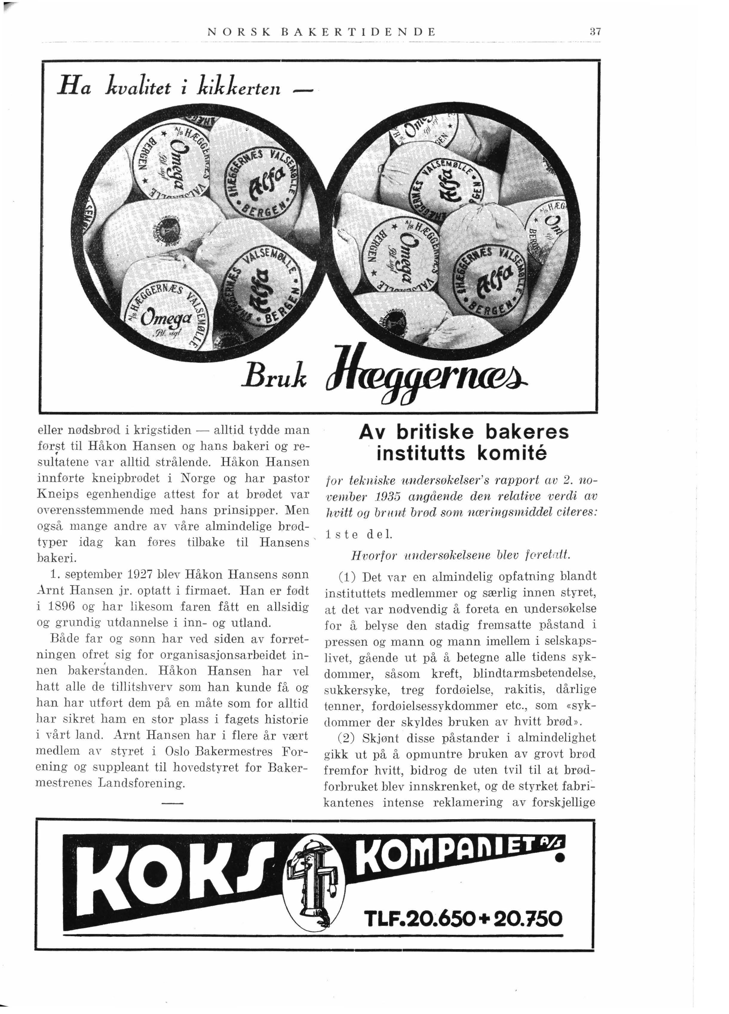 eller nødsbrød i krigstiden - alltid tydde man først til Håkon Hansen og hans bakeri og resultatene mr alltid strålende. Håkon Hansen innførte kneipbrødet i Norge og har pastor Kneips egenhendige attest for at brødet var overensstemmende med hans prinsipper. Men også mange andre av våre alminde lige brødtyper idag kan fores tilbake til Hansens ' bakeri.