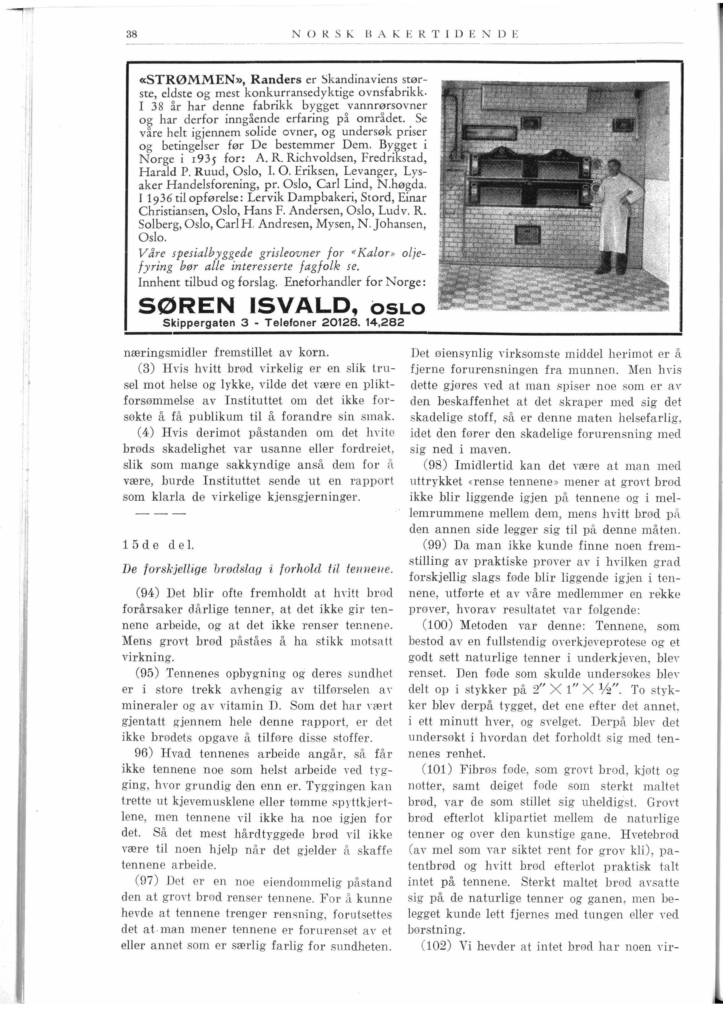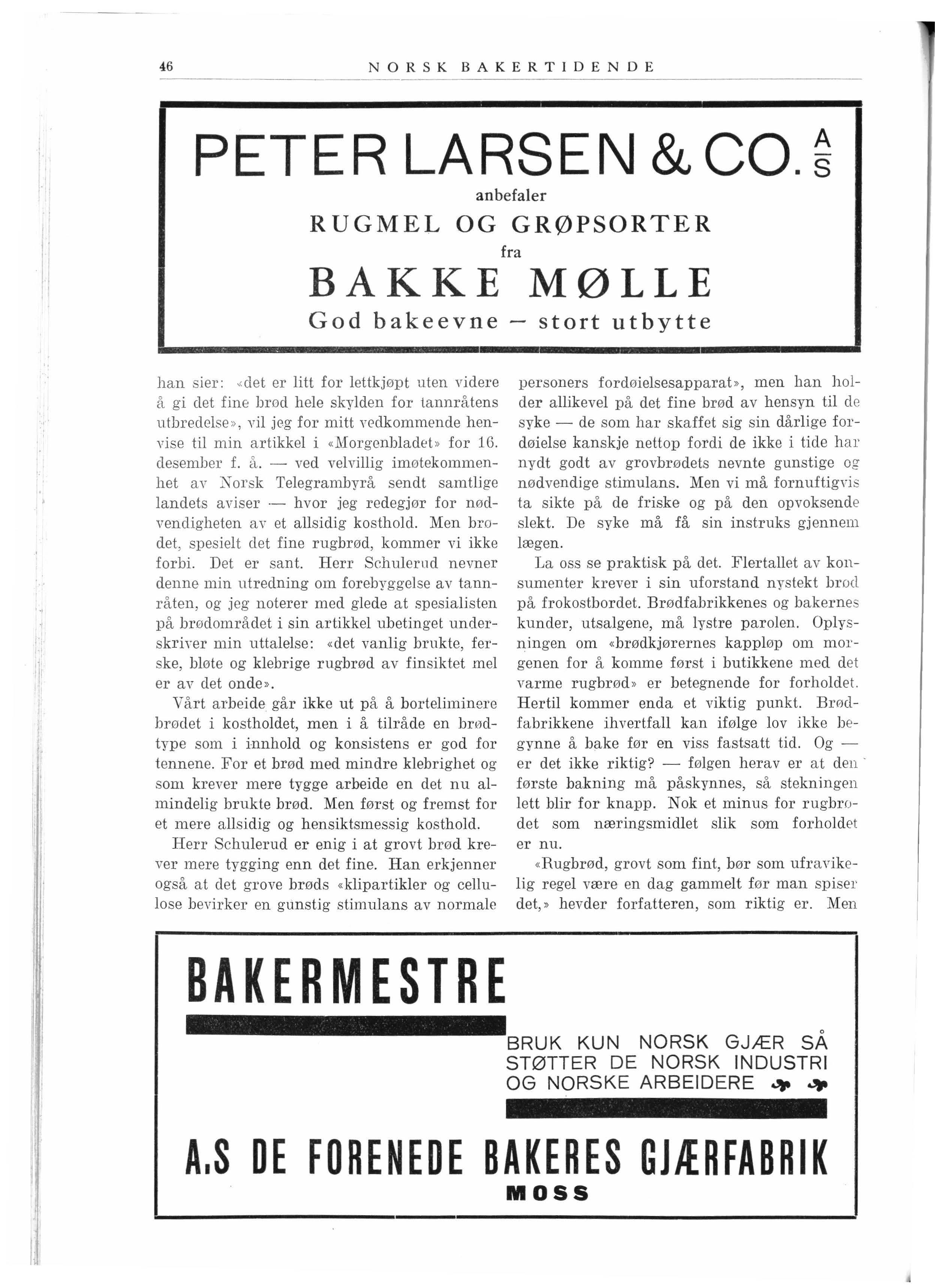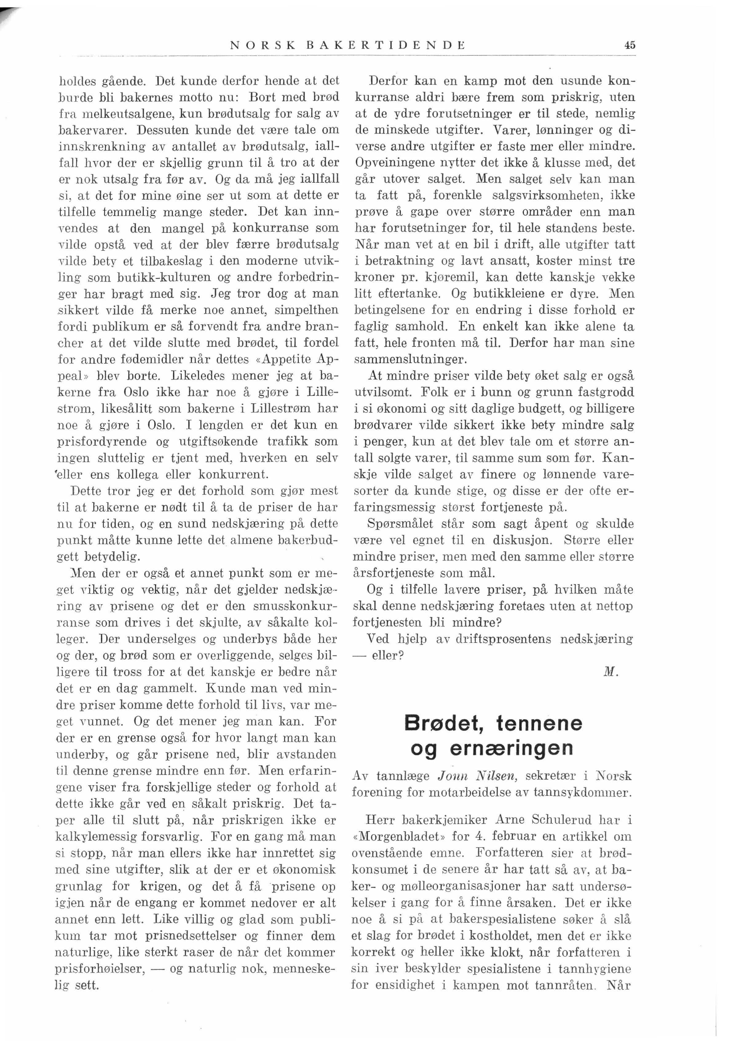 I Deres blads februarnummer omtaler D e en rapport fra engelske undersøkelser om den relatiYe verdi av «h vitt og brunt » brød. I tilslutning hertil uttaler De ønsket om et s amarbeide med oss bakere i brødspørsmålet. Som formann i Bakermestrenenes Landssammens lutning er det mig en glede å kunne si at vi bakere gjerne er beredt hertil. Jeg har også tidligere gitt uttrykk herfor i samtaler med nuværende president og se kr etær i den norske tannlægeforening. Når vi gjerne Yil samarbeide er det ikke minst fordi det er oss maktpåliggende å komme til kl arhet o,·er om noen spesiell brødtype kan sies å være tjenligere i et blandet kosthold - så vel av hensyn til tannspørsmålet som ernæringsmessig sett, - enn de typer bakerne nu fremstiller og som publikum kan velge blandt idag.