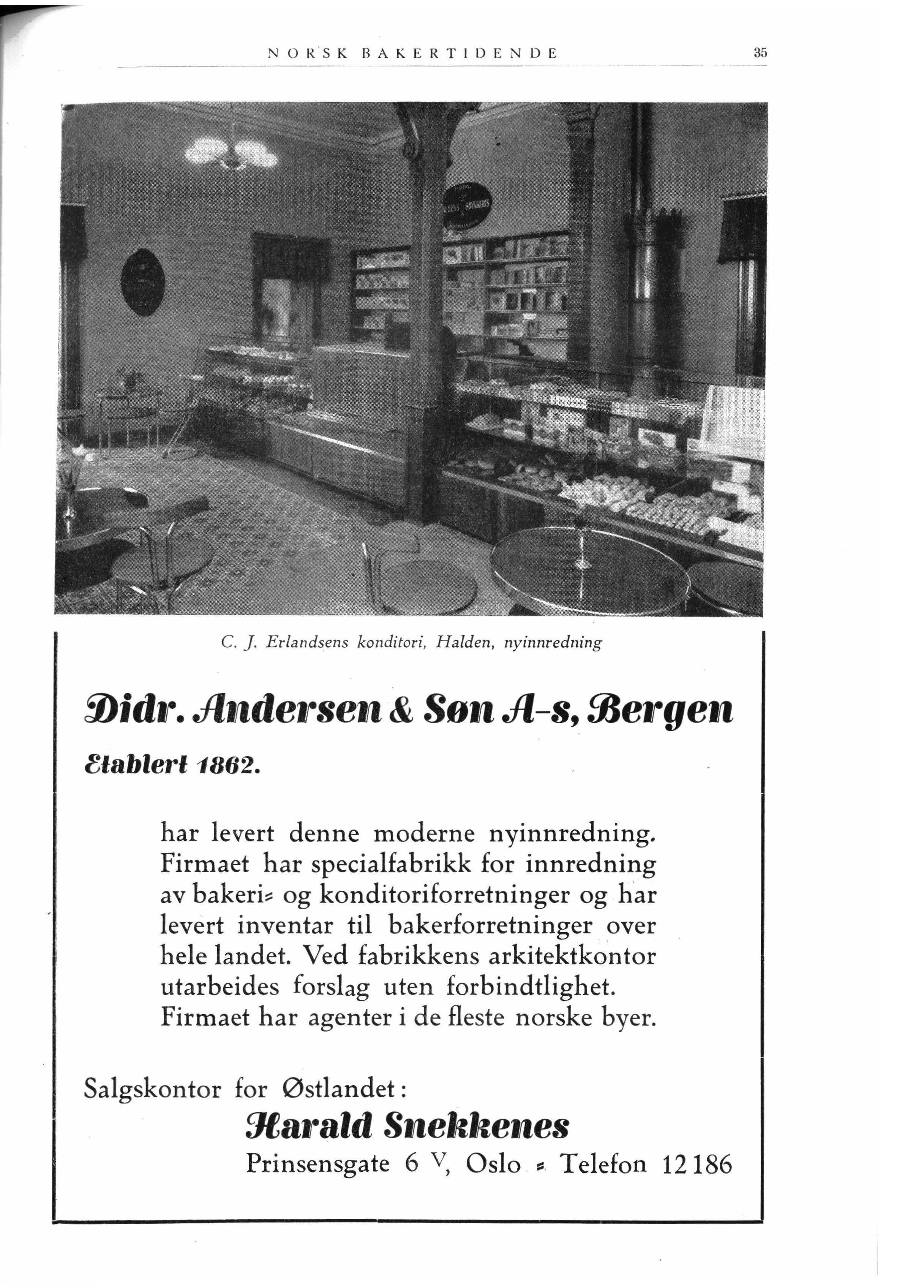 har levert denne moderne nyinnredning. Firmaet har specialfabrikk for innredning av bakeri::: og konditoriforretninger og har levert inventar til bakerforretninger over hele landet. Ved fabrikkens arkitektkontor utarbeides forslag uten forbindtlighet. Firmaet har agenter i de fleste norske byer.