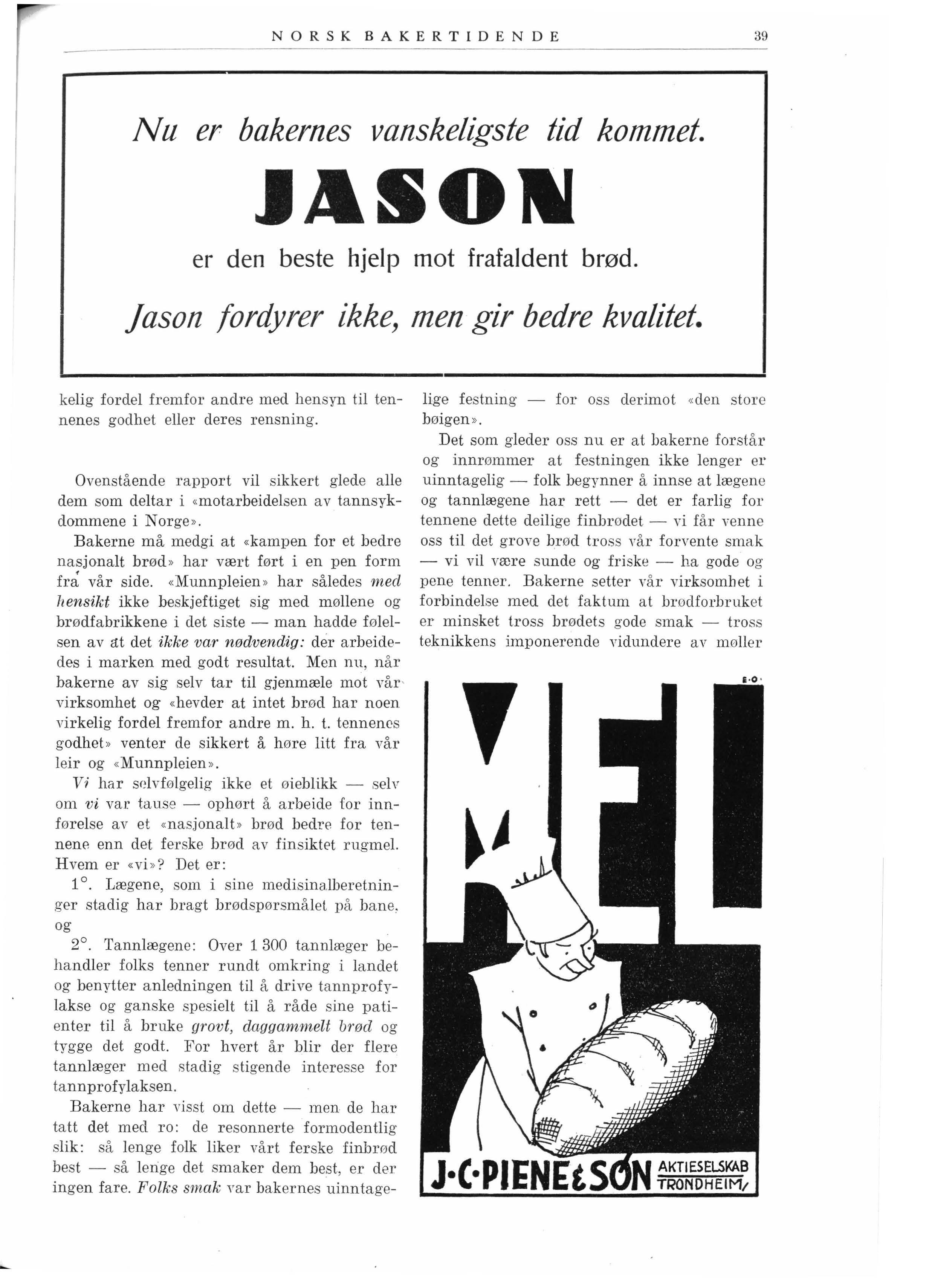 Det som gleder oss nu er at bakerne forst år og innrømmer at festningen ikke lenger er uinntagelig - folk begynner å innse at læ gene og tannlægene har rett - det er farlig for tennene dette deilige finbrødet - vi får venne oss til det grove brød tross vår forvente smak - vi vil være sunde og friske - ha go de og pene tenner. Bakerne setter vår virksomhet i forbindelse med det faktum at brødforbruk e t er minsket tross brødets gode smak - tros s teknikkens imponerende vidundere av møller