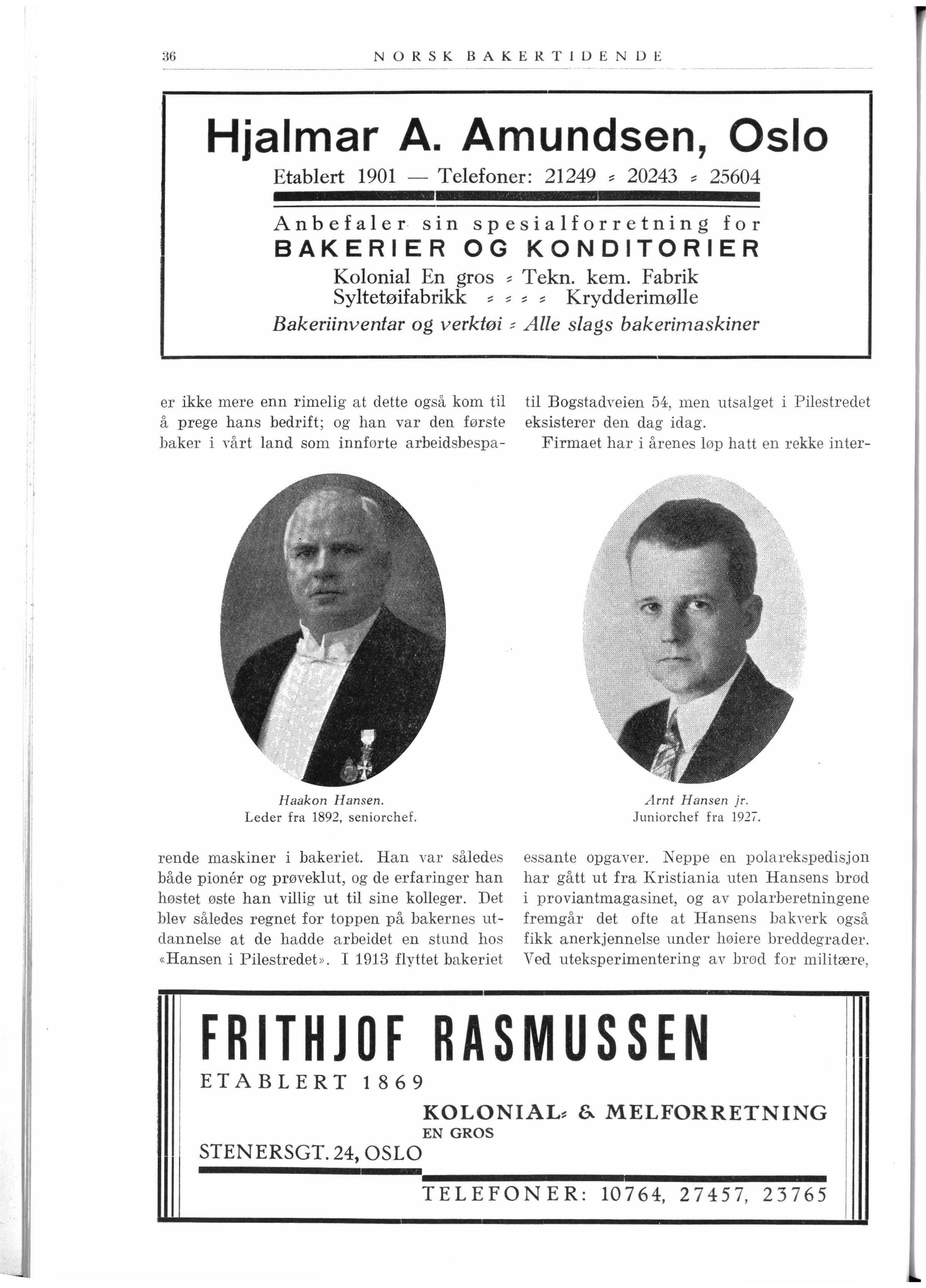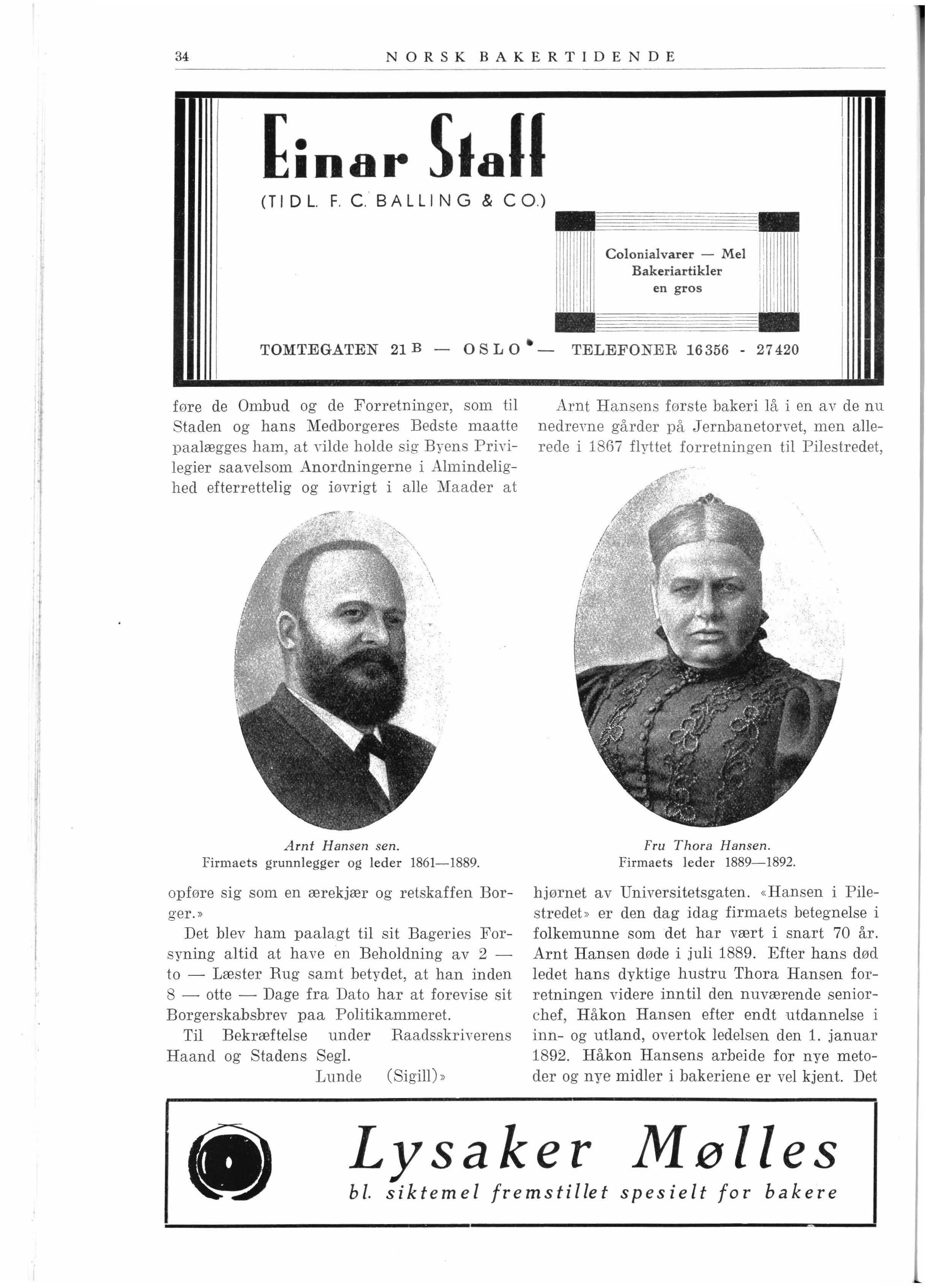 hjørnet av Universitetsgaten. «Hansen i Piles tredet " er den dag idag firmaets betegne lse i folkemunne som det har vært i snart 70 år Arnt Hansen døde i juli 1889. Efter hans død ledet hans dyktige hustru Thora Hansen forretningen videre inntil den nuværende seniorchef, Håkon Hansen efter endt utdannelse i inn - og utland, overtok ledel sen den 1. januar 1892 Håkon Hansens arbeide for nye metoder og nye midler i bakeriene er vel kjent. Det
