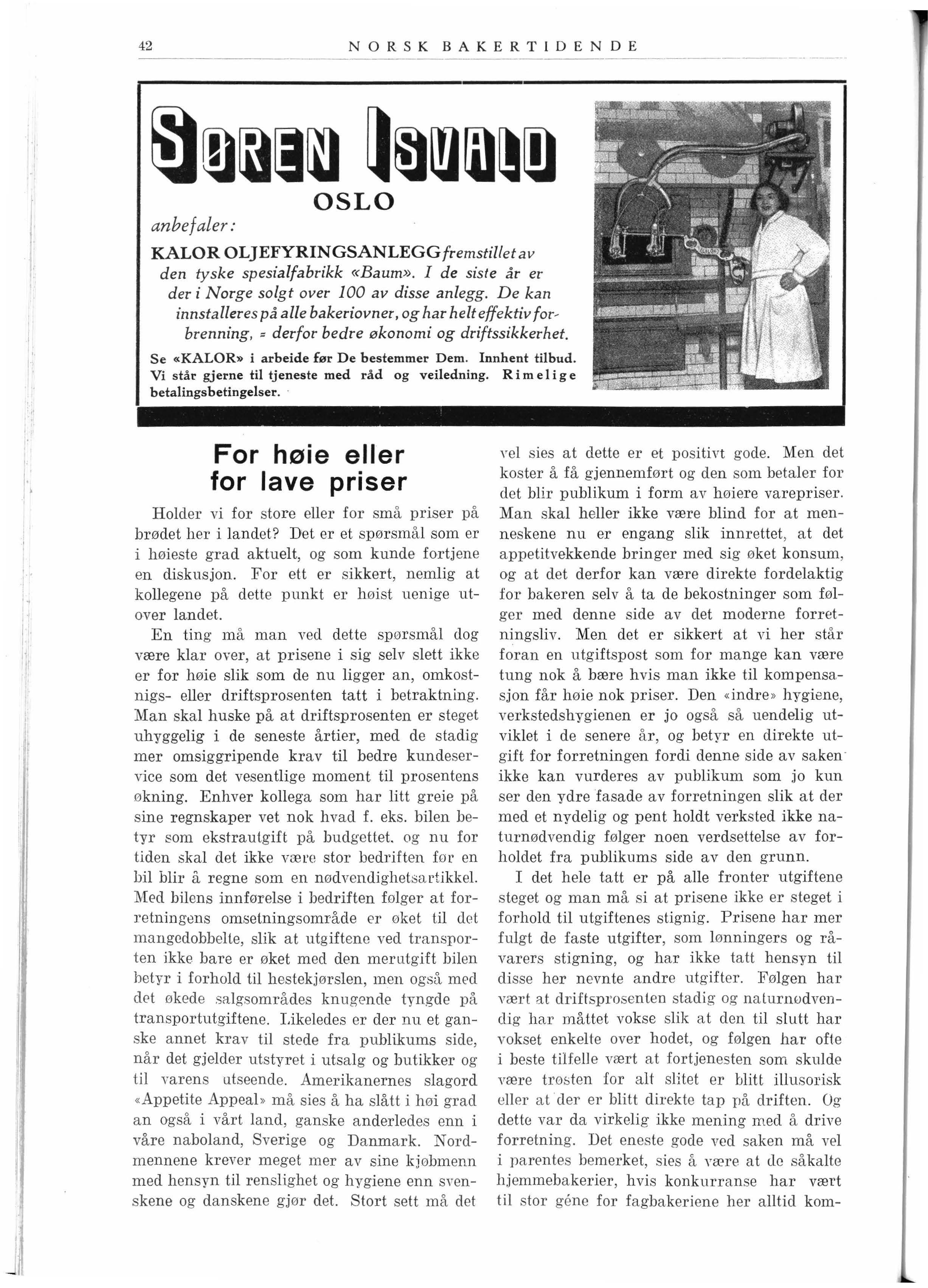 vel s ies at dette er et positivt gode . Men det ko ste r å få gjennemført og den som betaler for d et blir publi kum i form av høiere varepriser Man skal heller ikke være blind for at menneskene nu er engan g sl ik innrettet , at det appetitvekkende bringer med sig øket konsum , og at det derfor kan være direkte fordelaktig for bakeren se l v å ta de bekostninger som følger med denne side av det moderne forretningsliv Men det e r sikk ert at vi her står foran en utgiftspost s om for m a nge kan være tung nok å bær e hvis man ikke til kompensasjon får høie nok priser. Den «i ndre » hygiene, verkstedshygienen er jo også så uendelig utvik let i de senere å r , og betyr en direkte utgift for forretningen fordi denne side av sakenikke kan v urd eres av publikum som jo kun ser den ydre fasade av forretning en slik at der med et nydelig og pent holdt verksted ikke naturnødvendig f ølger noen verdsette lse av forholdet fra publikums si d e av den grunn . I det he l e tatt er på a lle fronter utgiftene steget og man m å s i at prisene ikke er stege t i forho ld til utgiftenes stignig. Prisene h ar m er fulgt de faste utgifter , som l ønningers og råvarers stig ning , og har ikke tatt hensyn til disse her nevnte andre utgifter. Følgen har vært at driftsprosenten stad i g og nalurm,dvendig har måttet vokse slik at den til s lu tt har vokset enkelte over hodet, og følgen har ofte i beste tilfelle vært at fortjenesten som skulde være trøsten for alt slit et er blitt illu s orisk eller at ·der er blitt dir ekt e tap på driften. Og dette var da virkelig ikke mening med å drive forretning. Det eneste gode ved saken må vel i parentes bemerket, s ie s å være at de så kalt e hjemmebakerier, hvis konkurr anse har vært til s tor gene for fagbakeriene her a lltid kom-