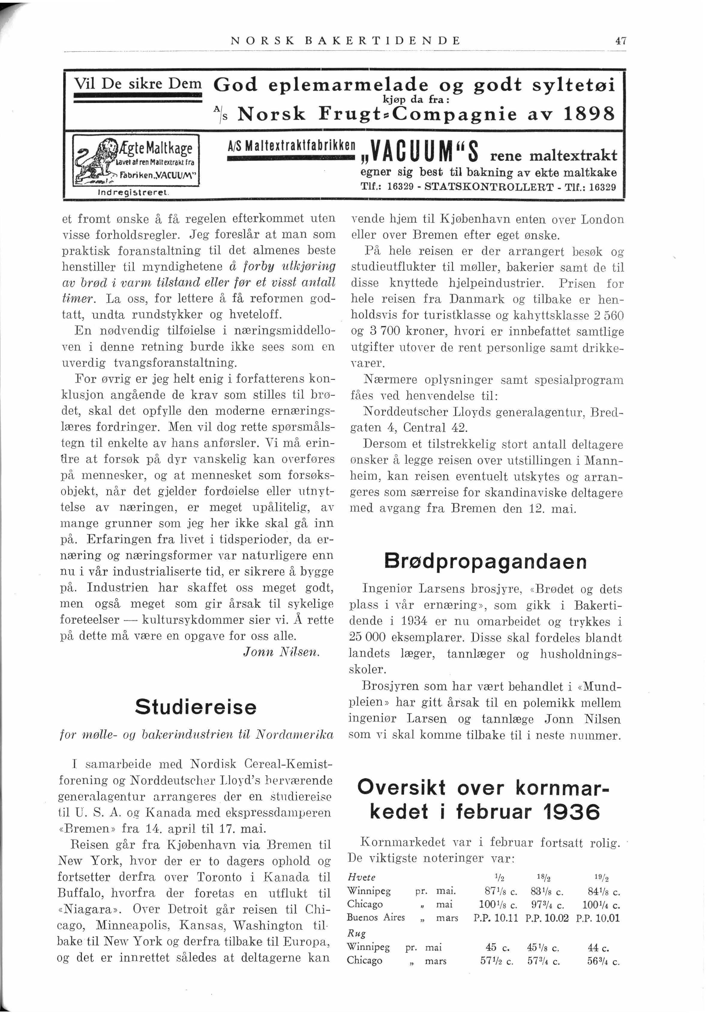 For øvrig er jeg helt enig i forfatterens konklusjon angående de krav som stilles til brødet, skal det opfylle den moderne ernæringslæres fordr inger. Men vil dog rette spørsmålstegn til enkelte av hans anførsler. Vi må erintlre at forsøk på dyr vanske lig kan ornrføres på mennesker, og at mennesket som forsøksobjekt, når det gjelder fordøielse eller utnyttelse av næringen, er meget upålitelig, av mange grunner som jeg her ikke skal gå inn på. Erfaring en fra livet i tidsperioder, da ernæring og næringsformer var naturlig ere enn nu i vår industrialiserte tid, er sikrere å bygge på. Industrien har skaffet oss meget godt, men også meget som gir årsak til sykelige foreteelser - kultursykdommer sier vi. Å rette på dette må være en opgave for oss alle. Jonn Nilsen