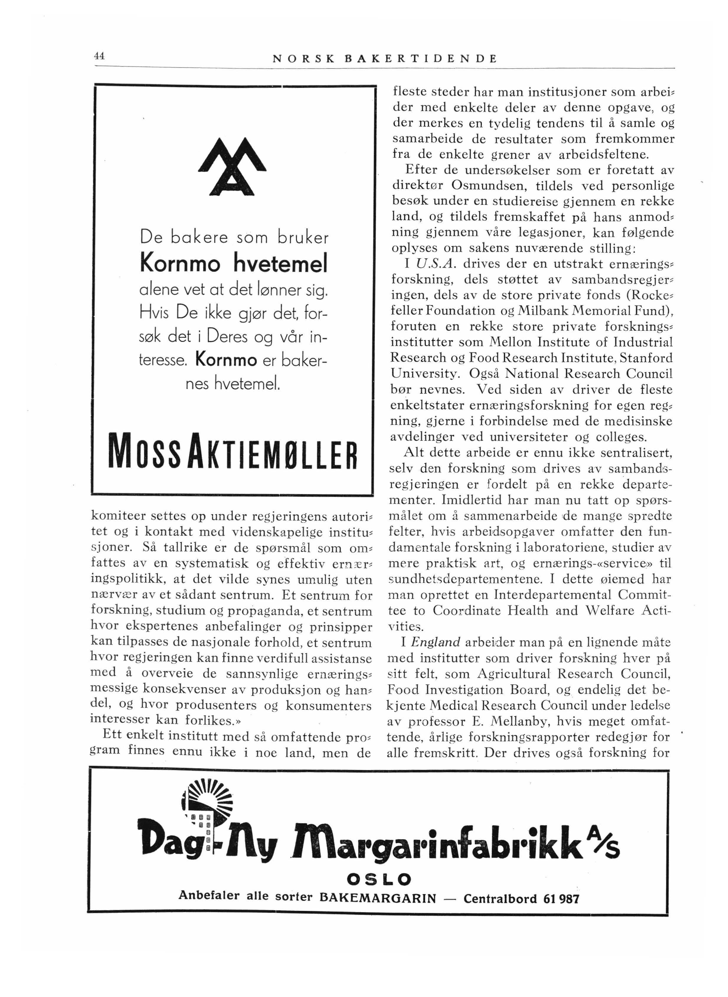 Man har en brødkommisjon av hygienikere, kjemikere og representanter for mølle- og bakeriindustrien, som har til opgave å lage et «folkebrø<l» for å finne en bedre utnyttelse av kornet og fortrinsvis det som finnes i kliet. Begrunnelsen for dette arbeide er at brødtypeproblemet blir satt i forbindelse med tannråteiprohlemet, som synes forbundet med ernærings-feil.