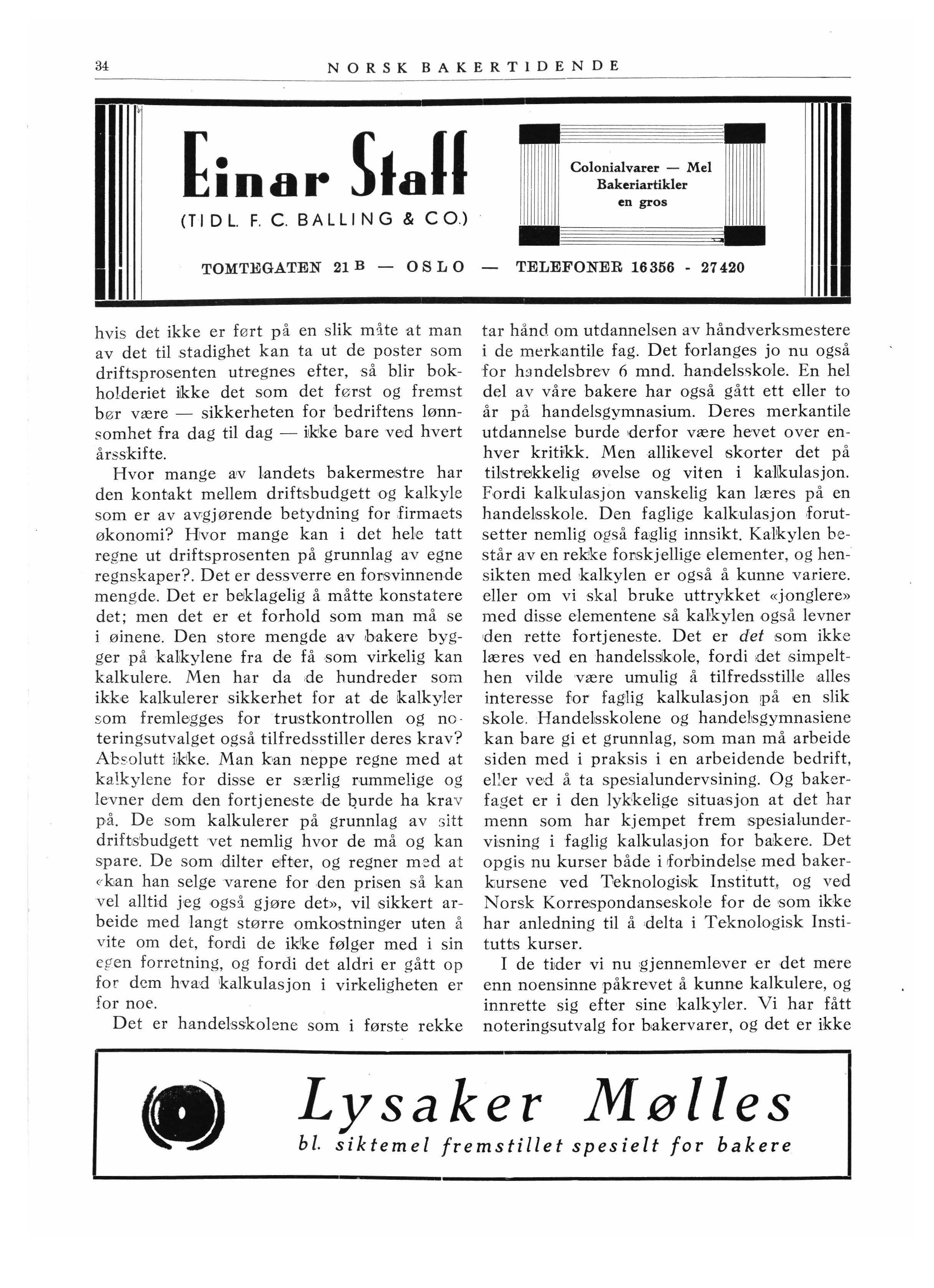 tar hånd om utdannelsen av håndverksme s tere i de merk ,antile fag. Det forlanges jo nu også for h:rndeisbrev 6 mnd. handelsskofo. En hel del av våre bakere har også gått ett eller to år på handelsgymnasium. Deres merkantile utdannelse burde ,derfor være hevet over enhver kritikk. Men allikevel skorter det på tiLstriekkelig øvelse og viten i kalikulasjon. Fordi kalkulasjon vanskelig kan læres på en handel,sskole. Den faglige kalkulasjon forutsetter nemlig også faglig innsikt. Kalkylen består arv en rekke foi;skj,ellige elementer, og hensi kten med kalkylen er også å kunne variere. eller om vi skal bruke uttrykket «jonglere» med disse elementene så kalkylen også levner 1den rette fortjeneste. Det er det som ikke læres ved en handelsslkole, fordi det s impelthen vilde være umulig å tilfredsstiUe alles interesse for fag:lig kalkulasjon !På en slik skole. Hande1sskolene og handelisgymnasiene kan bare gi et grunnlag, som man må arbeide siden med i praksis i en arbeidende bedrift, eE-er ved å ta spes ialundervsining. Og bakerfaget er i den lykkelig•e situa,sjon at det har menn som har kjempet frem spesia1undervisning i faglig kalkulasjon for brukere. Det opgis nu kurser både i forbindelse med bakerkursene ved 'Deknologisk Institutt, og ved Norsk Korrespondanseskole for de som ikke har anledning til å ,delta i Teknologisk Institutts kurser.