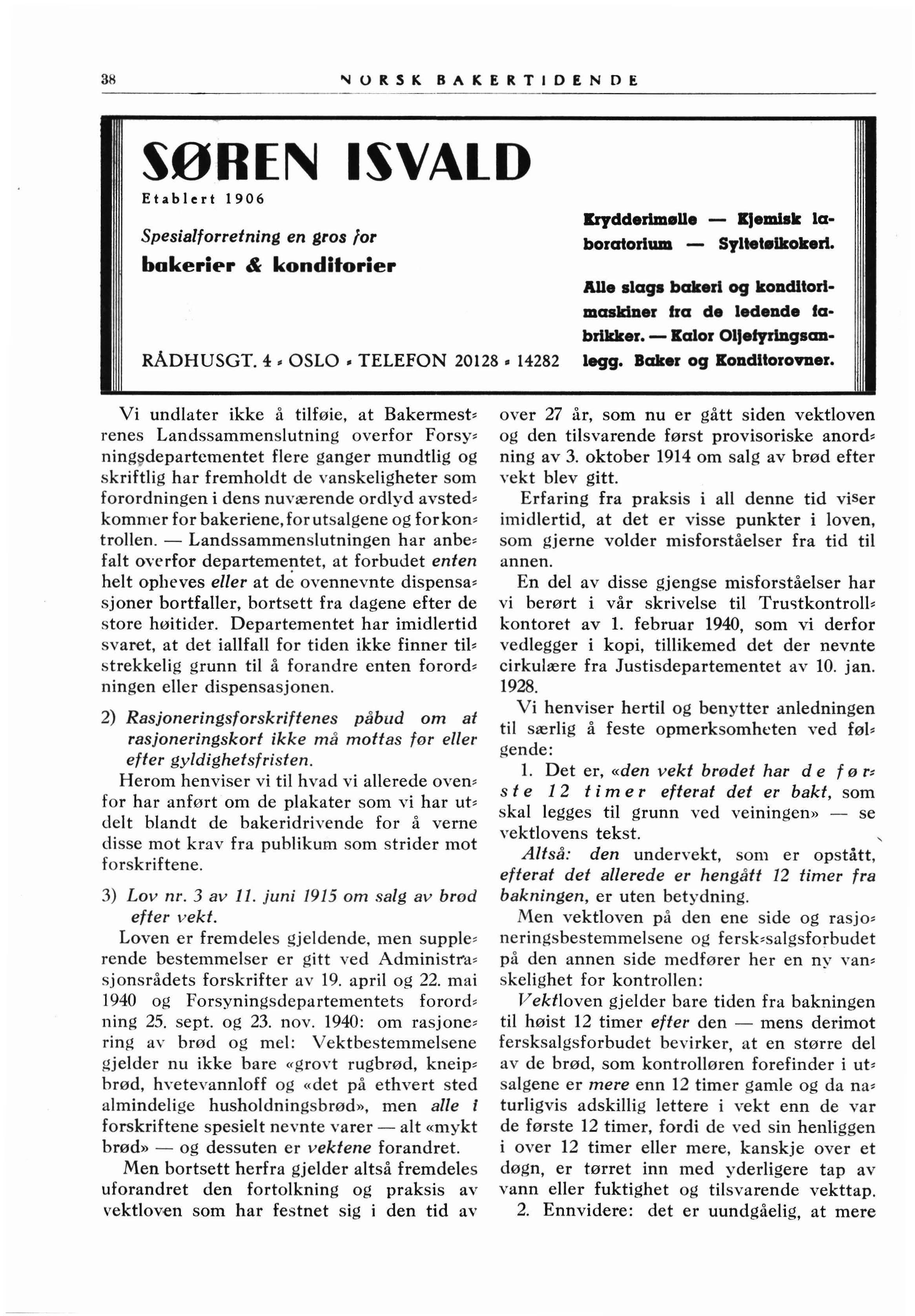 Vi undlater ikke å tilføie, at Bakennest• renes Landssammenslutning overfor Forsy• ning§departcmentet flere ganger mundtlig og skriftlig har fremholdt de vanskeligheter som forordningen i dens nuværende ordlyd avsted• kommer for bakeriene, for utsalgene og for kon• trallen. - Landssammenslutningen har anbe• falt overfor departementet, at forbudet enten helt opheves eller at de ovennevnte dispensa• sjoner bortfaller, bortsett fra dagene efter de store høitider. Departementet har imidlertid svaret, at det iallfall for tiden ikke finner til• strekkelig grunn til å forandre enten forord• ningen eller dispensasjonen.