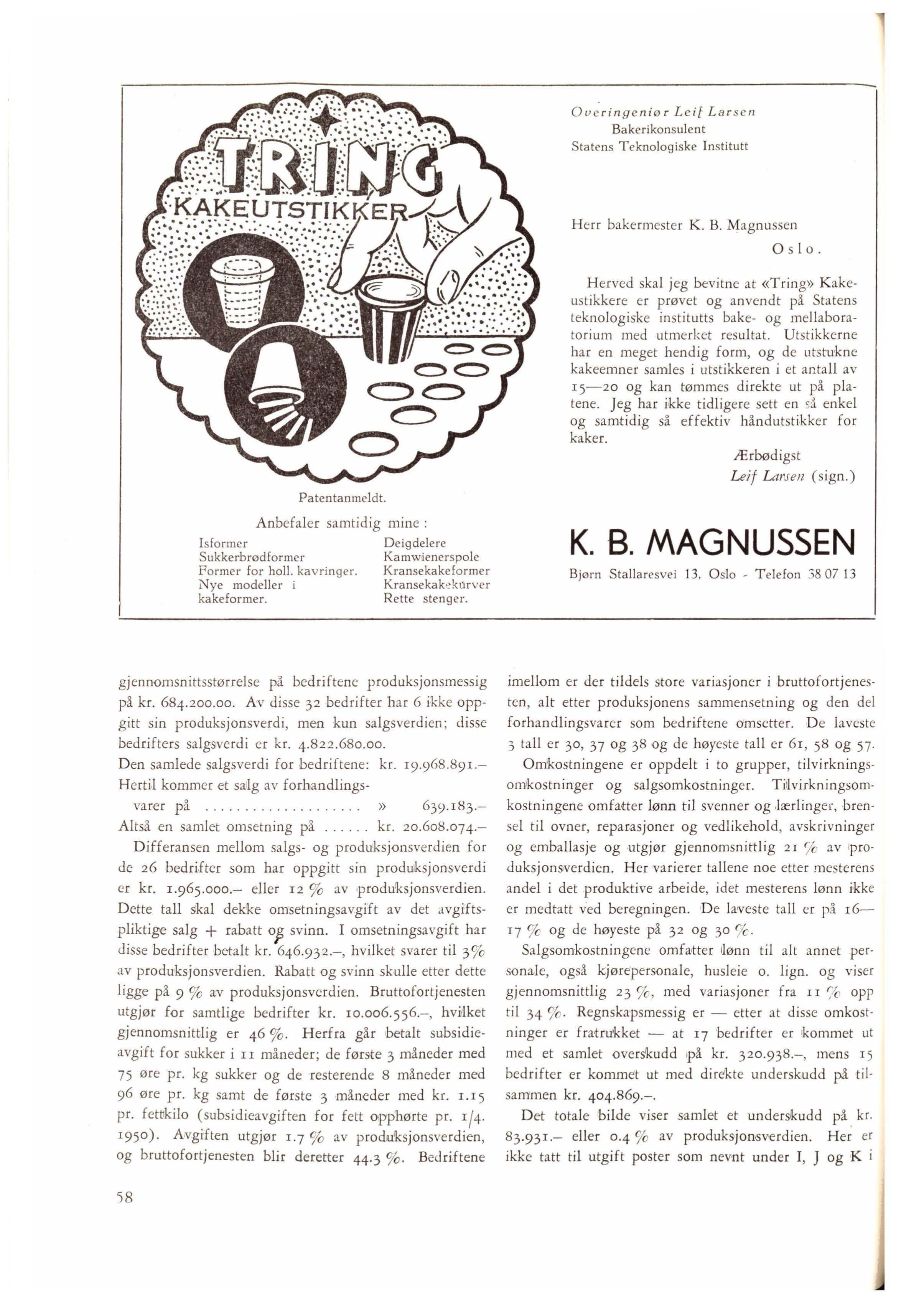 H erved ska l jeg bev itn e at «Tring)> K a k eustikkere er prøvet og anvendt på Statens teknolog iske institutts bake- og mellaboratorium med utmerket resultat. Utstikkerne har en meget h e ndi g form, og de utstukne kakeem n er samles i uts tikkeren i et anta ll av r 5-2 0 og kan tømmes direkte ut på platene. J eg har ikke tidligere sett e n så en kel og samtidig så effe kti v h å ndut s tikk er for kaker.