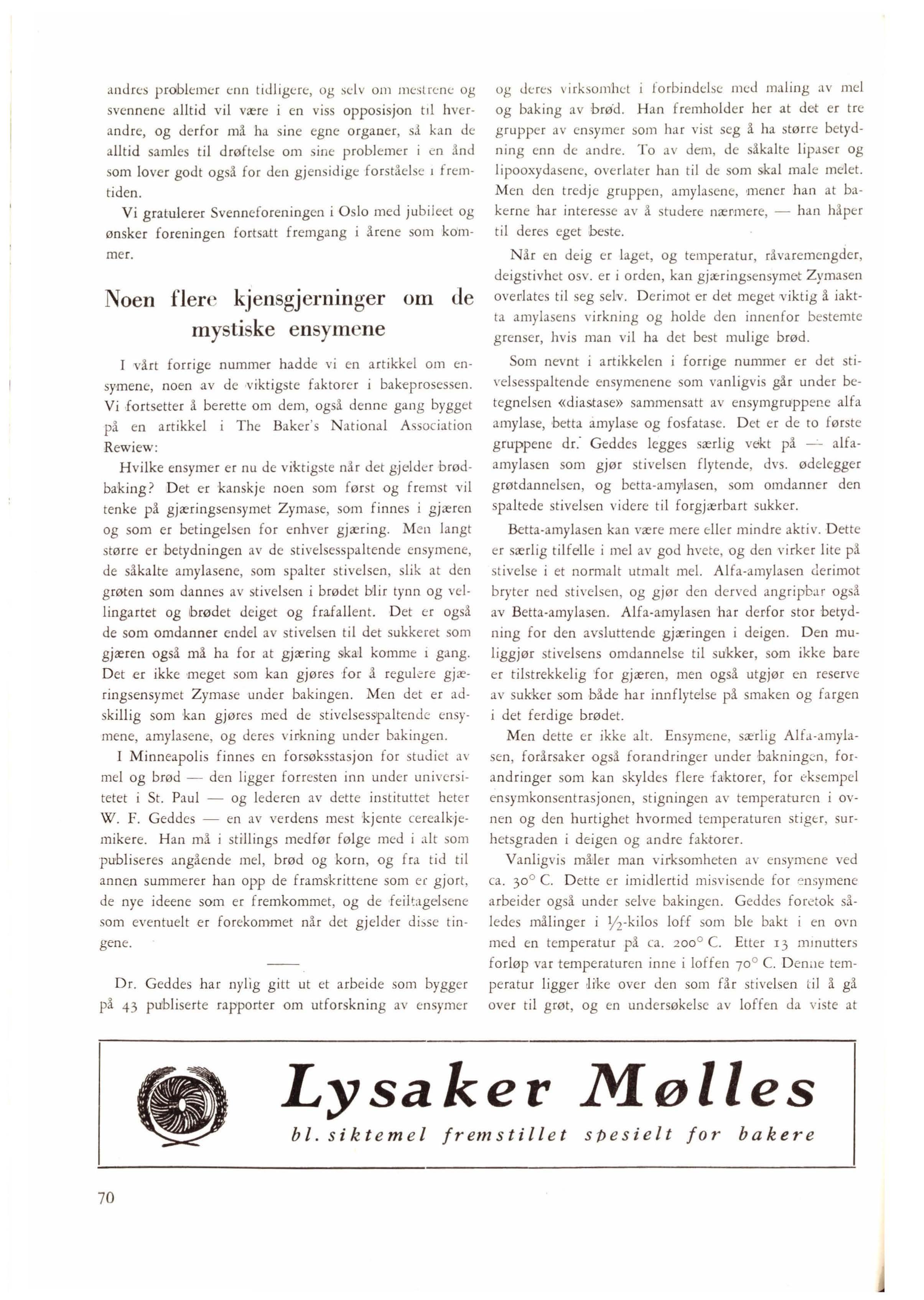 og Jeres virksom h c:t i forbindelse meJ maling av mel og baking av brø'd. H a n fremholder her at d et er tre gr upp er av e nsym er som h ar vist seg å h a større betydning enn de andre. To .1v dem, de sil.kalte lip.1 ser og lipo oxydase n e, overlater h a n t il de som ska l male melet. M e n den tredje gruppen, amylasene, mener han at bak e rn e har interesse av å studere nærmere, - h an h åper til dere s eget beste.