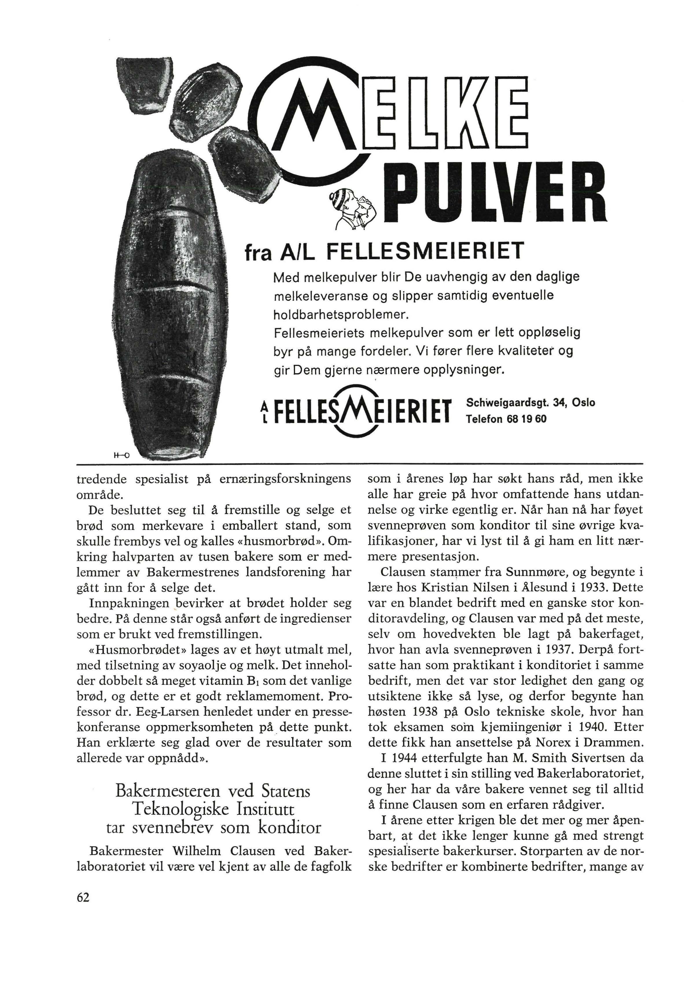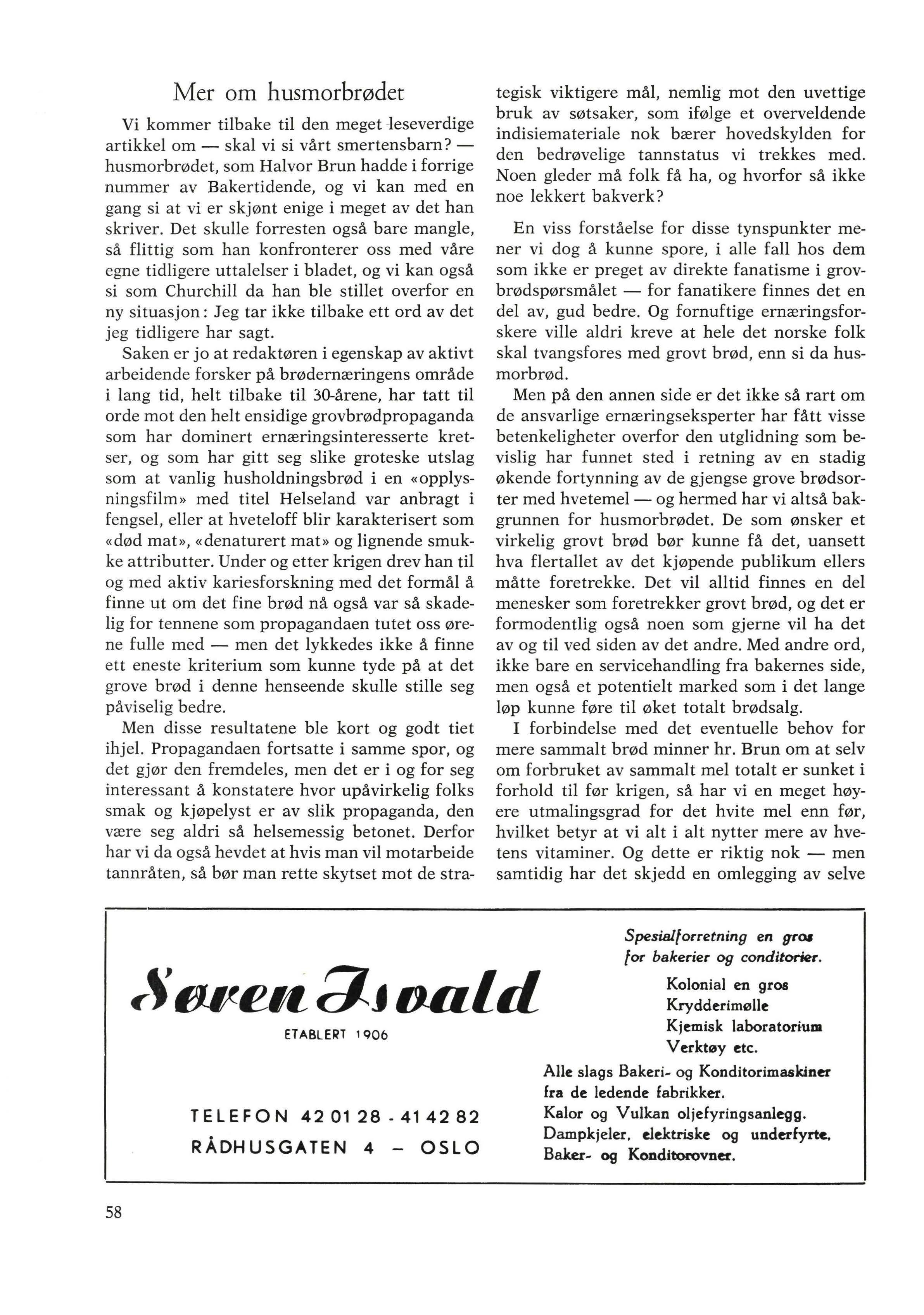 Vi noterer imidlertid det nye innlegg som det første synlige resultat av det arbeide for et øket brødkonsum som nå er i emning, og håper at dette arbeide også må gi synlige resultater. Som kjent er det ikke bare bakerne og deres leverandører som vil ha fordel av et øket brødsalg. Det er jo påvist at det av helsemessige grunner er ønskelig at folk spiser mere brød, og et bedre underlag for sin propagandavirksomhet kan ingen ønske seg.