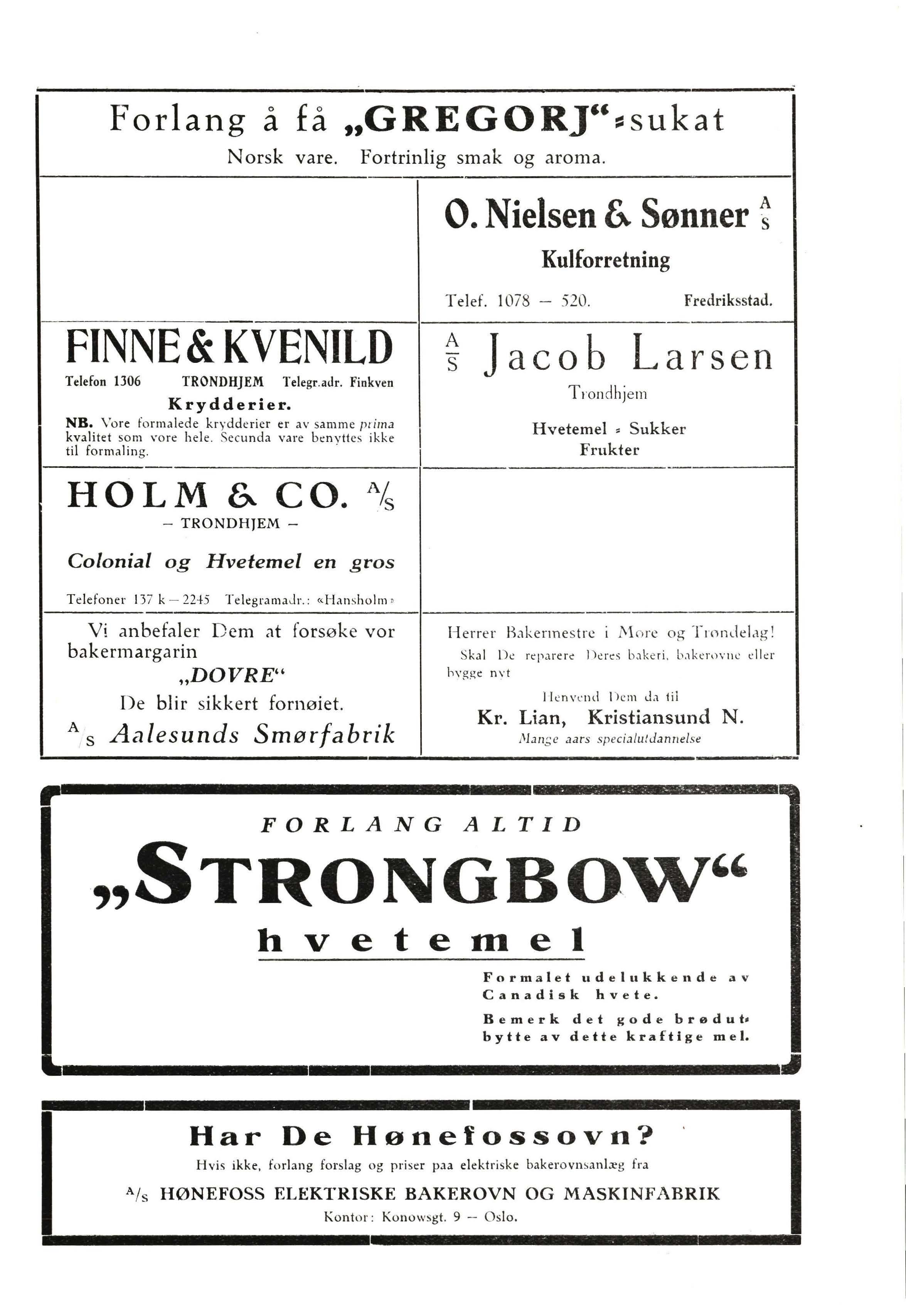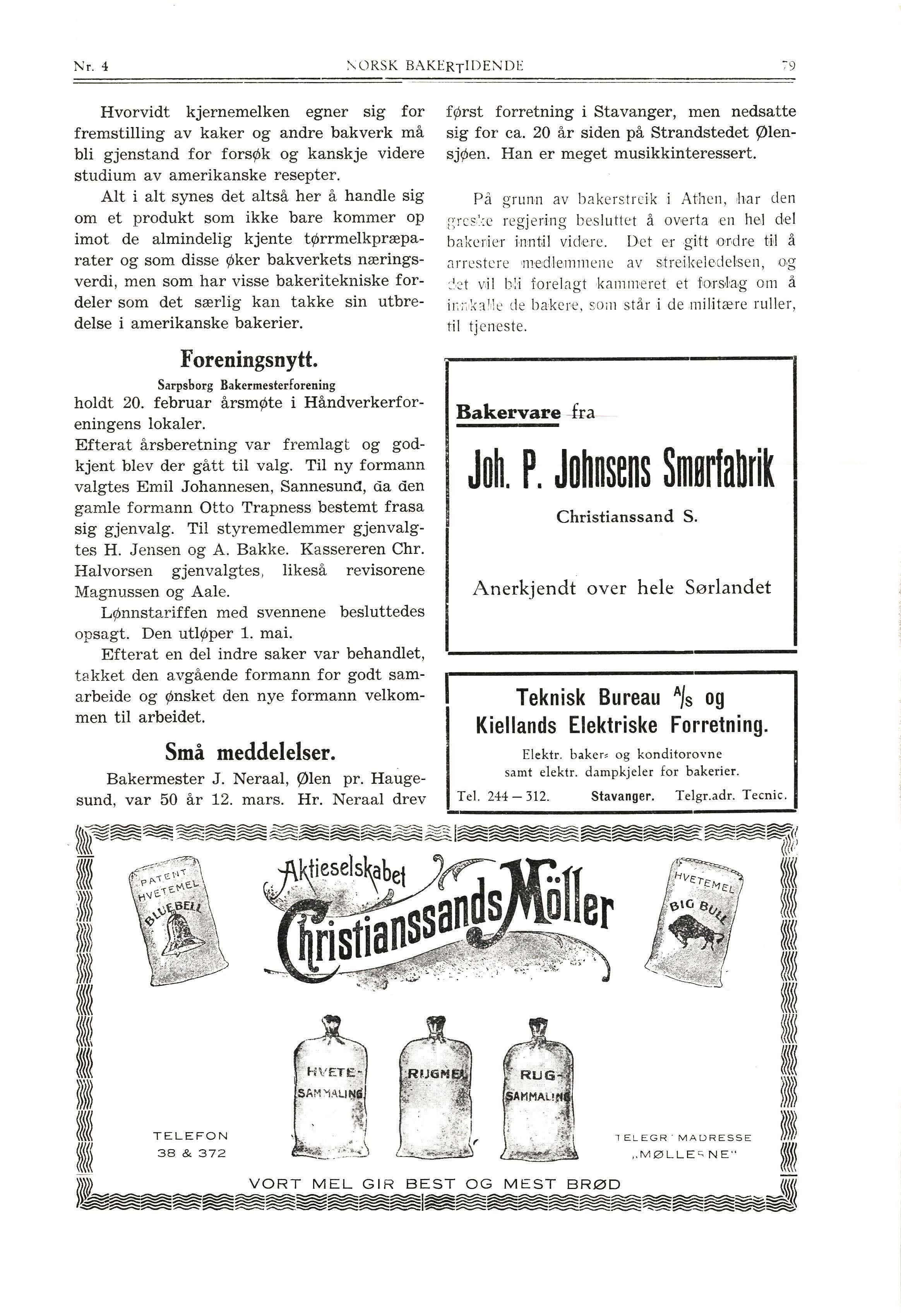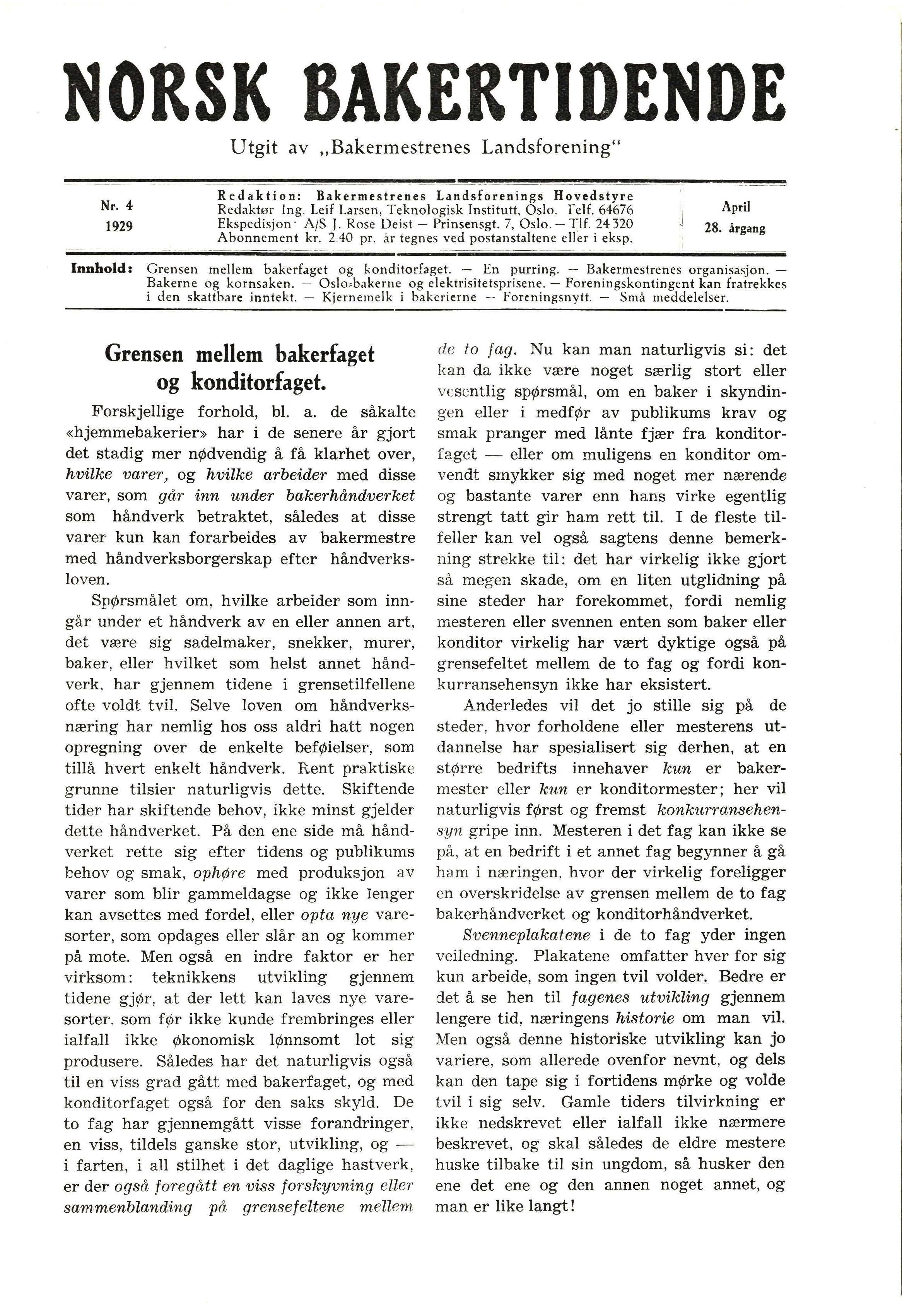 Innhold: Grensen mellem bakerfaget og konditorfaget - En purring. - Bakermestrenes organisasjonBakerne og kornsaken. - Oslo,bakerne og elektrisitetsprisene - Foreningskontingent kan fratrekkes i den skattbare inntekt - Kjernemelk i bakcricrne - foreningsnytt - Små meddelelser.