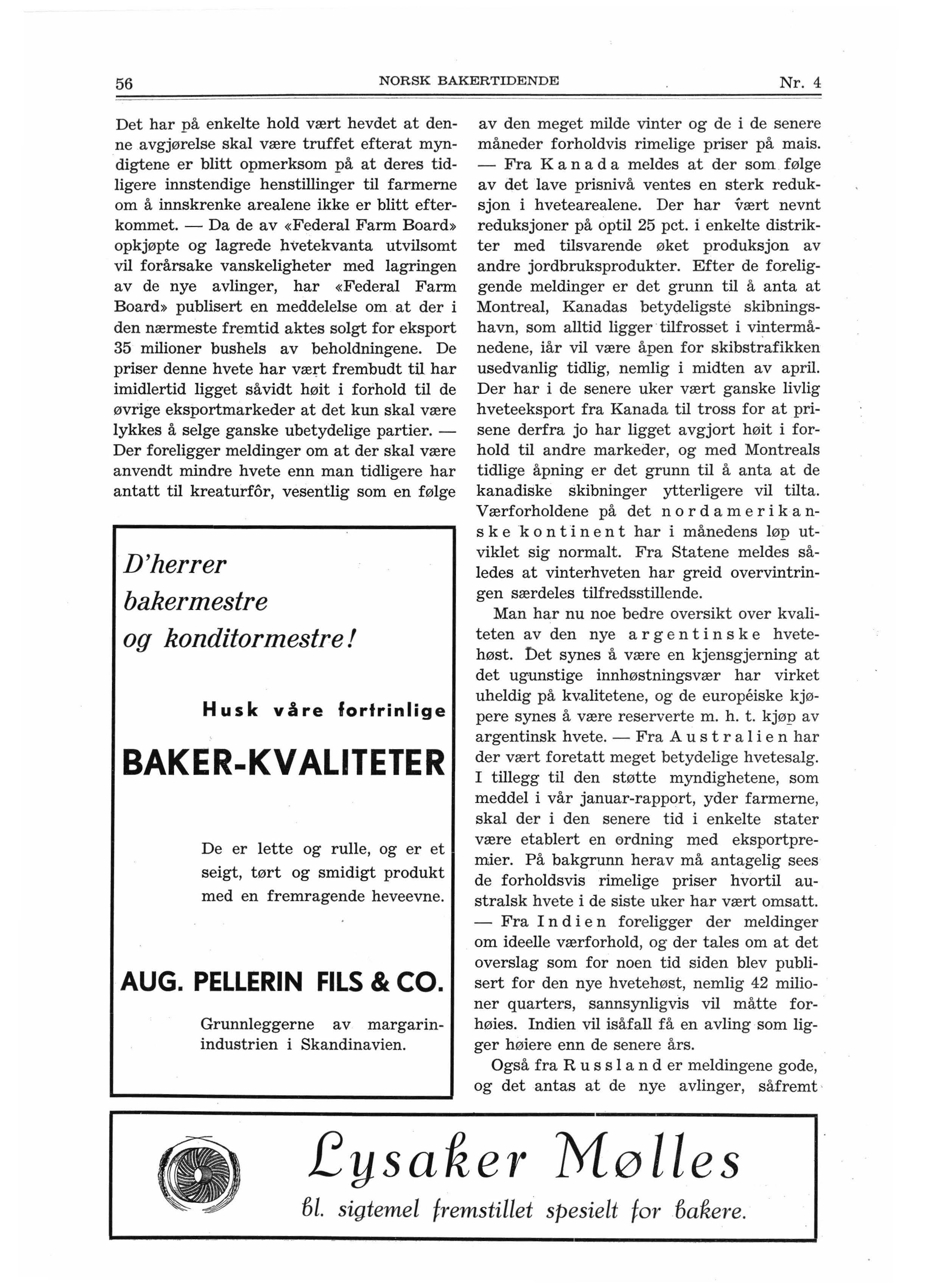 Man har nu noe bedre oversikt over kvaliteten av den nye argentinske hvetehøst. Det synes å være en kjensgjerning at det ugunstige innhøstningsvær har virket uheldig på kvalitetene, og de europeiske kj øpere synes å være reserverte m. h. t. kjøp av argentinsk hvete. - Fr a A u s t r a I i e n har der vært foretatt meget betydelige hvetesalg. I tillegg til den støtte myndighetene, som meddel i vår januar-rapport , yder farmerne , skal der i den senere tid i enkelte stater være etablert en 0rdning med eksportpremier. På bakgrunn herav må antagelig sees de forholdsvis rimelige priser hvortil australsk hvete i de siste uker har vært omsatt. - Fra I n d i e n for eligger der meldinger om ideelle værforhold, og der tales om at det overslag som for noen tid siden blev publisert for den nye hveteh øs t , nemlig 42 milioner quarters, sannsynligvis vil m å tte forhøies. Indien vil isåfall få en avling som ligger høiere enn de senere års.