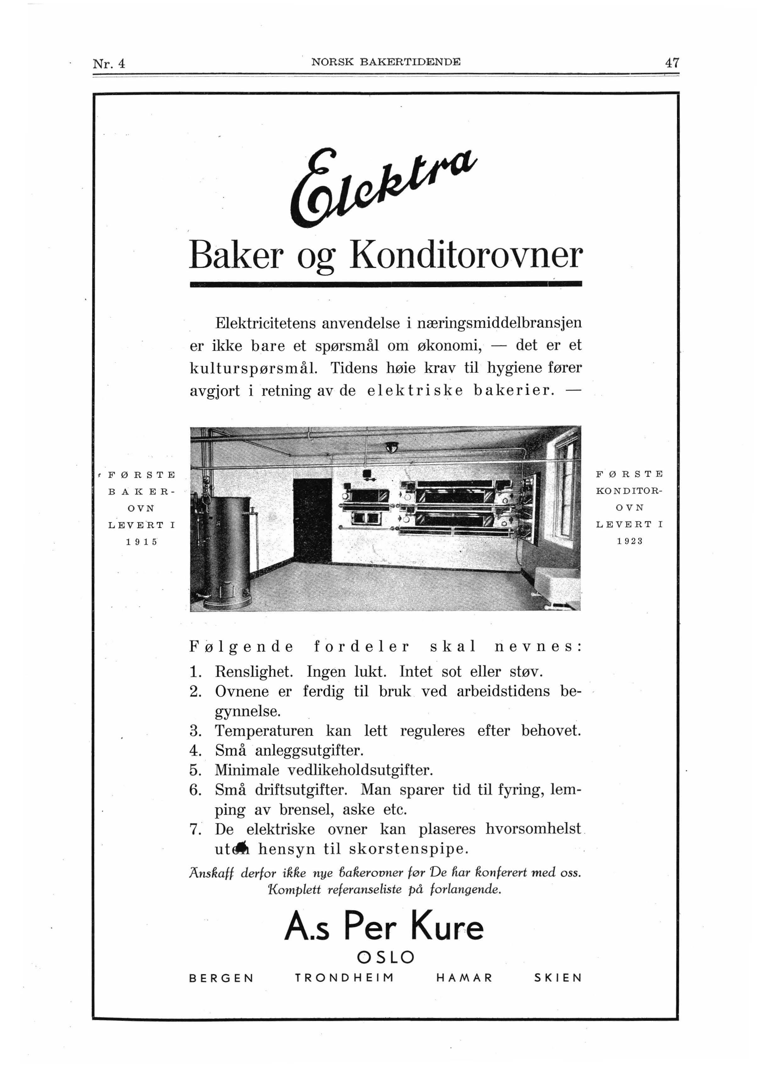 Elektricitetens anvendelse i næringsmiddelbransjen er ikke bare et spørsmål om økonomi, - det er et kulturspørsmål. Tidens høie krav til hygiene fører avgjort i retning av de elektriske bakerier. -