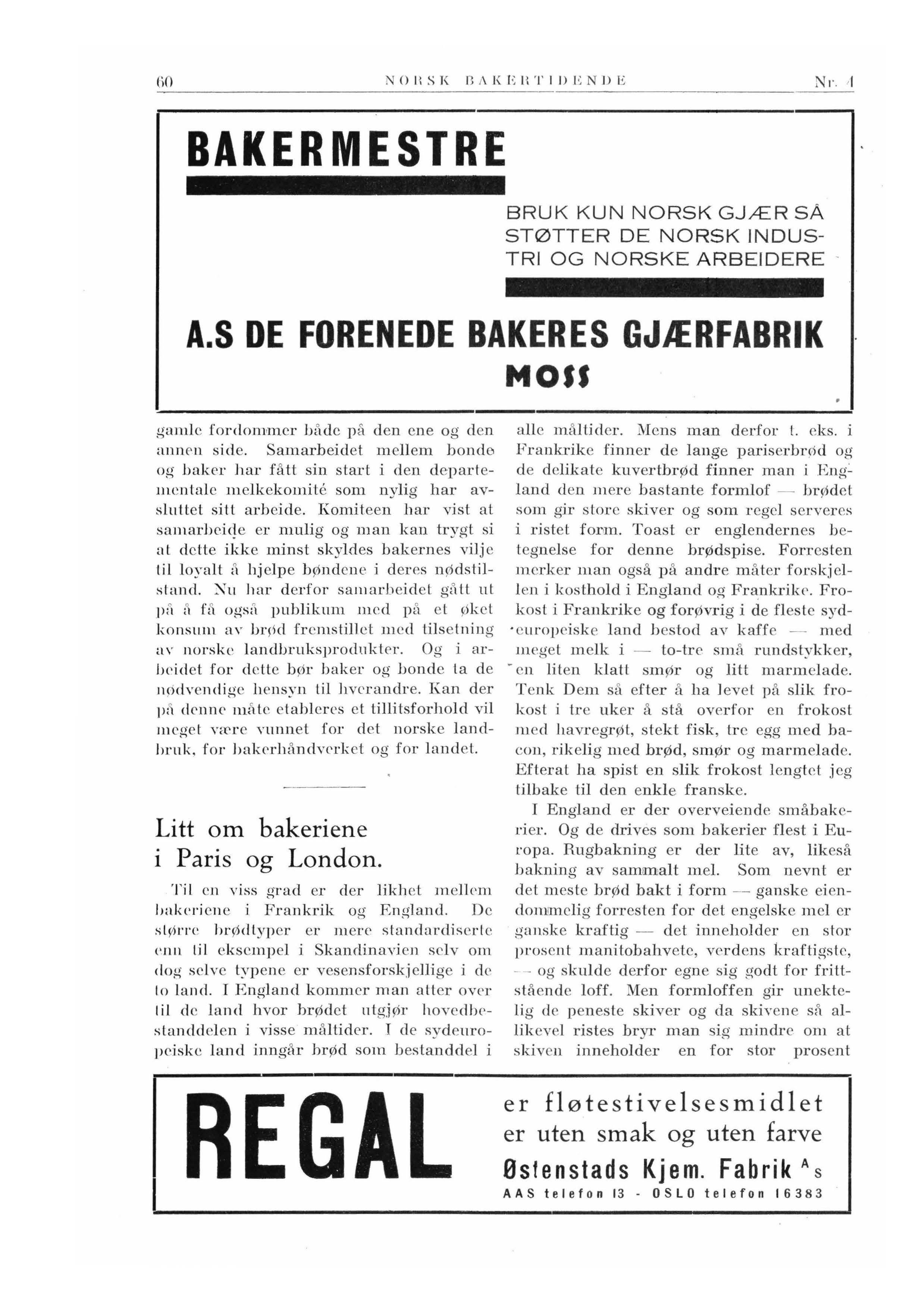 I n n h o 1 d : llaker og bonde. - Li ti om Ilakeriene i London og Paris. - Nytt norsk bakepulver. - llfelekscm - Kornmarked e t i februar (forts.) - Kornmarkedet i mars. - Vår bransje og Arbeids-Fylkingen. - Fross e t brød. - Bakeforsøk. - Selvhevende mel. - ~lei som myntfot. - En ny anven<lclse for rad io. - En ny slags re kl ame. - Annonsørfortegn.