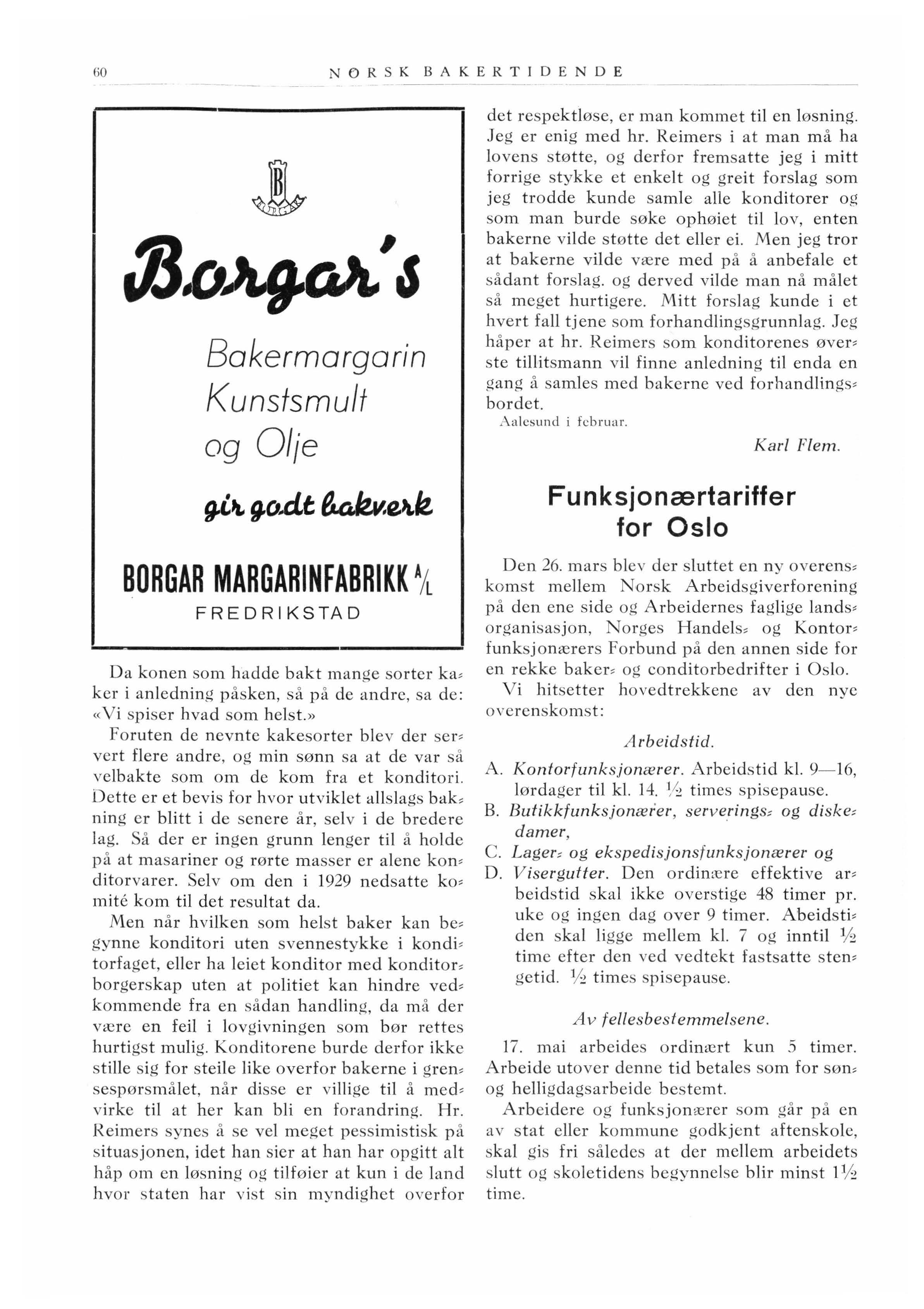 Konditorfa get og bakerfa ge t har si ne kon • trover se r , det har sikkert alle nær bes lektede fag, men utad har de alltid s tått sa mmen , og en flerhet av Konditorme s trenes Land s fore • nin gs medlemmer er også medlemmer av Ba , kerme s tren es Landsforenin g. - Vi har d e rfor også anset det som en s tilltiende overenkomst a t de to fagtidsskrifter ikke s kal inneholde ar tikler so m utad kan bli til skade for det annet fag, og i de 13 år Norsk Bakertid e nde og Norsk Conditortidende har virket sammen er dette principp som en se lvføl geli g het sø kt overholdt. Inntil Norsk Co nditortidende fant å kunn e br y te det p å g runn av en s terkt mi s, v i sen de utenlandsk avisartikkel.