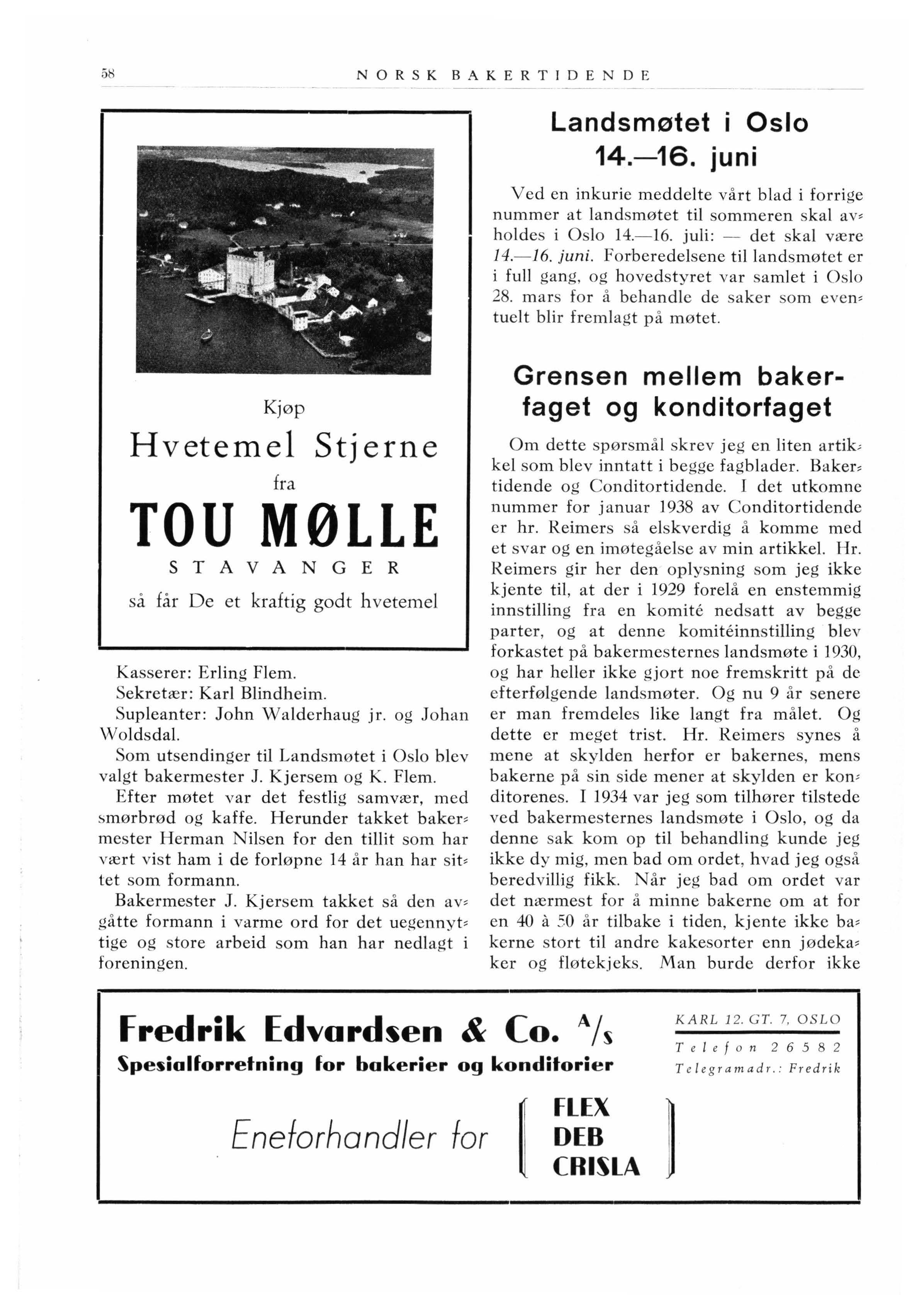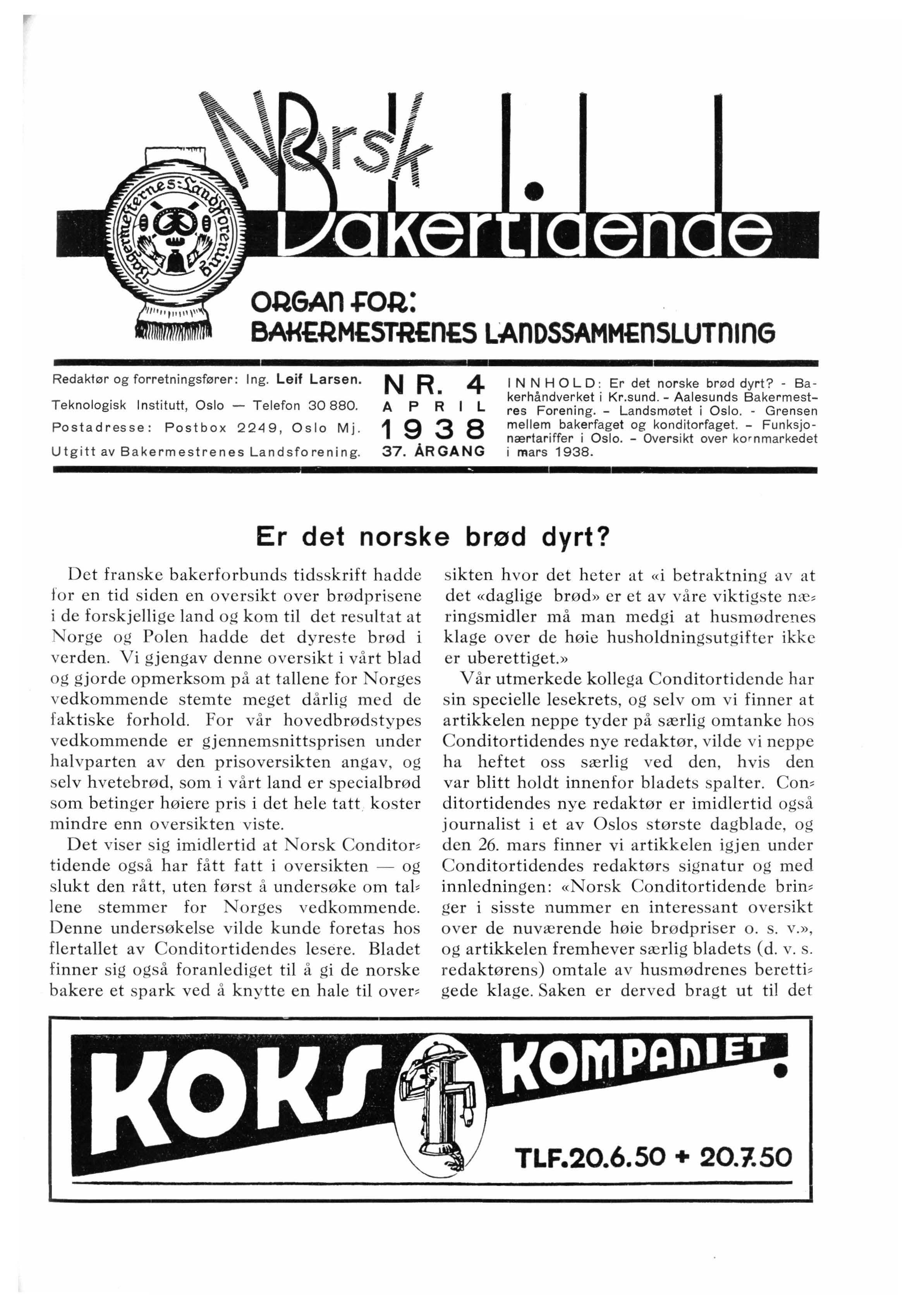 I N N HOLD : Er det norske brød dyrt? - Bakerhåndverket i Kr.sund. - Aalesunds Bakermestres Forening. - Landsmøtet i Oslo. - Grensen mellem bakerfaget og konditorfaget. - Funksjonærtariffer i Oslo. - Oversikt over kornmarkedet i mars 1938.