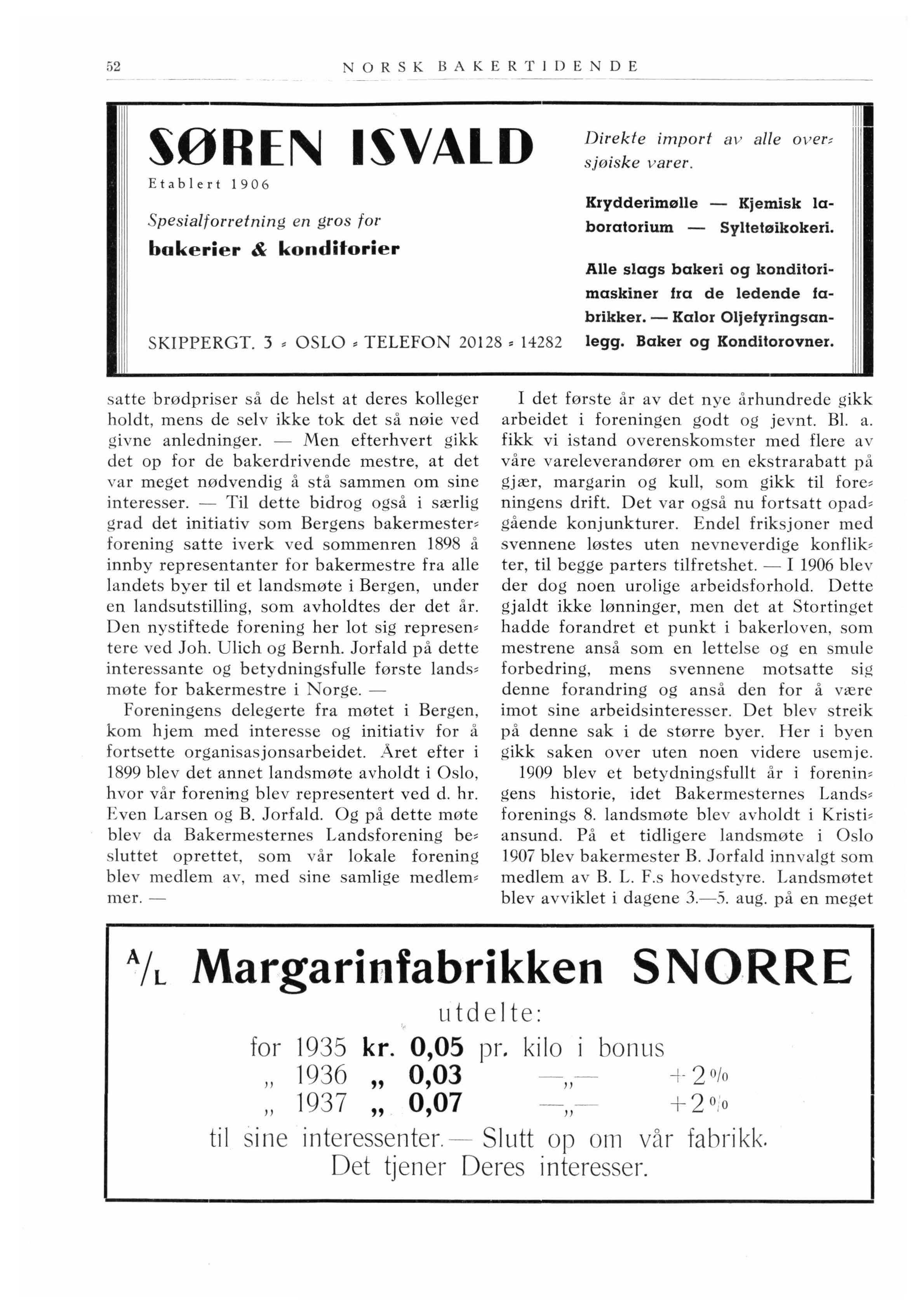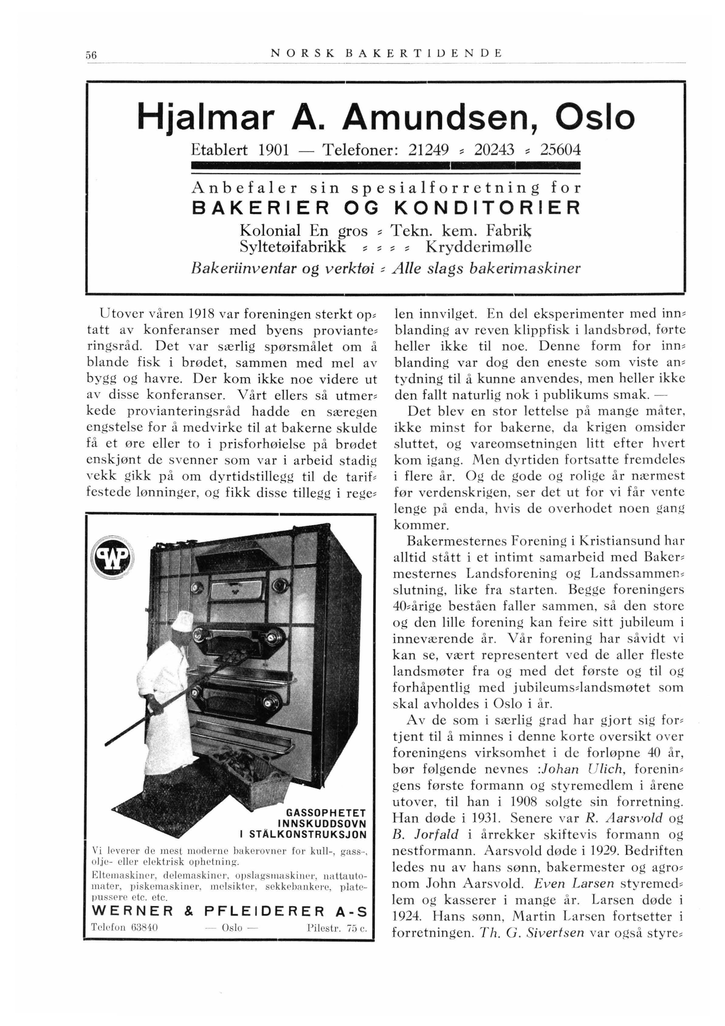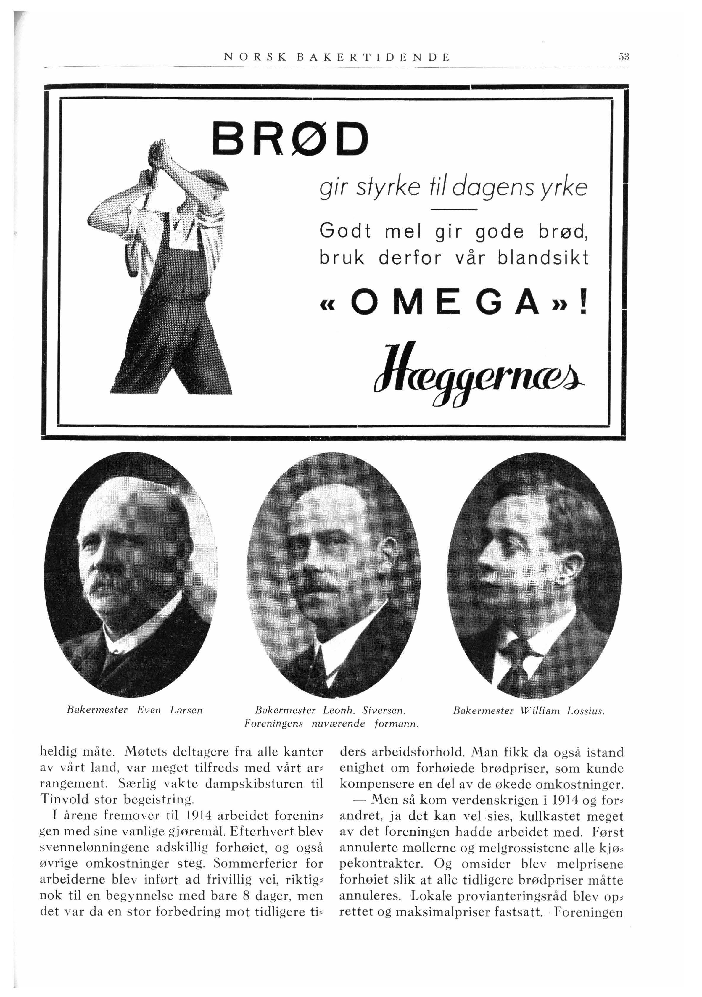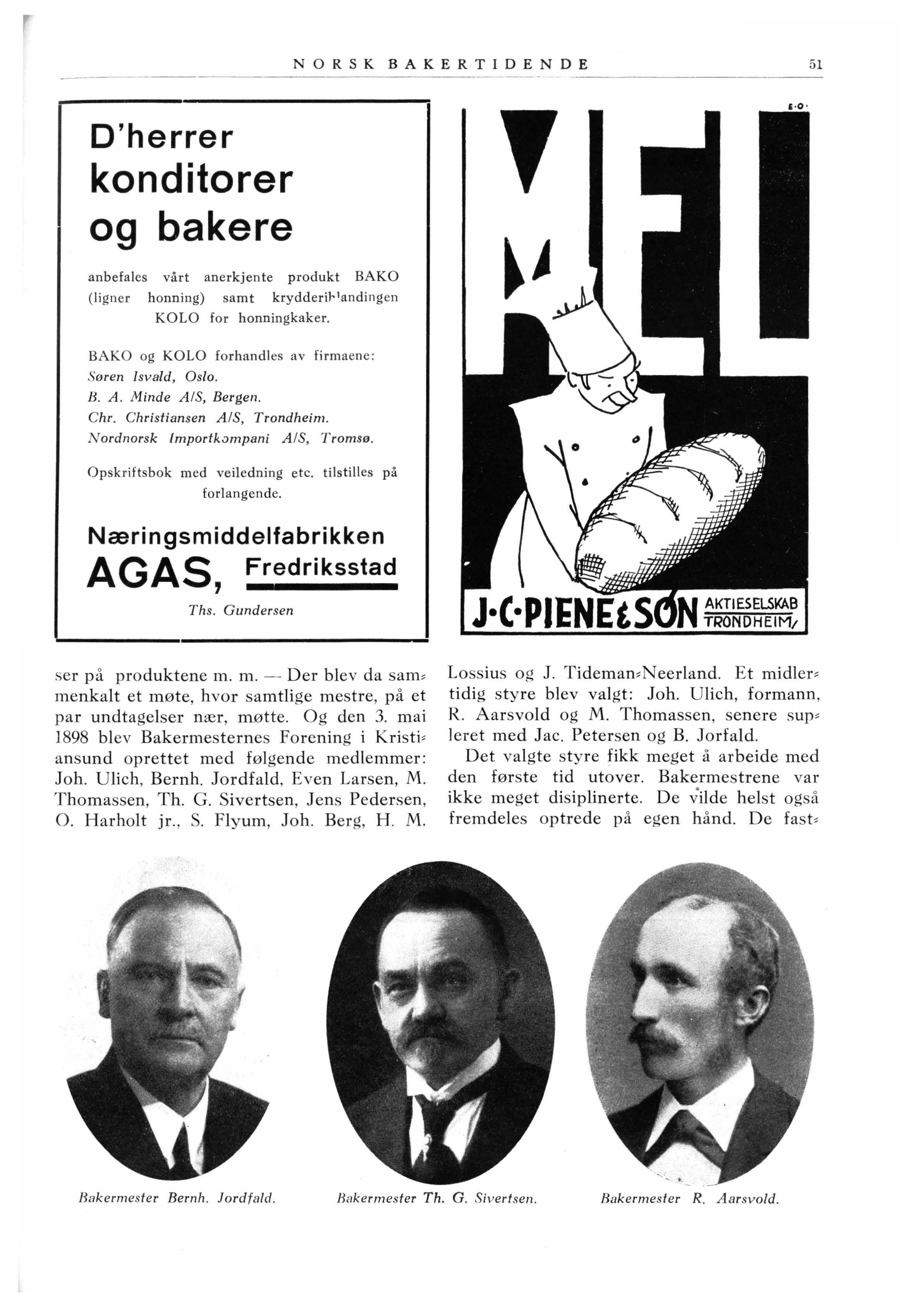 medlem og formann i styret i noen år. Han døde i 1931 o g efterfølges av sønnen Leonh. Sivertsen. Også bakermester Jens Pedersen og H. M. Lossius var interesserte med lemmer i flere perioder. Pedersen har nedlagt sin for, retning for endel år siden. H. M. Lossius døde allerede i 1916, og hans sønn William Lossius, som er utdannet som konditor overtok da for, retningen. Fra 1930 er også Bernh. Jorfalds bakeribedrift overført ti l hans sønn , baker, mester Sverre Jorfald