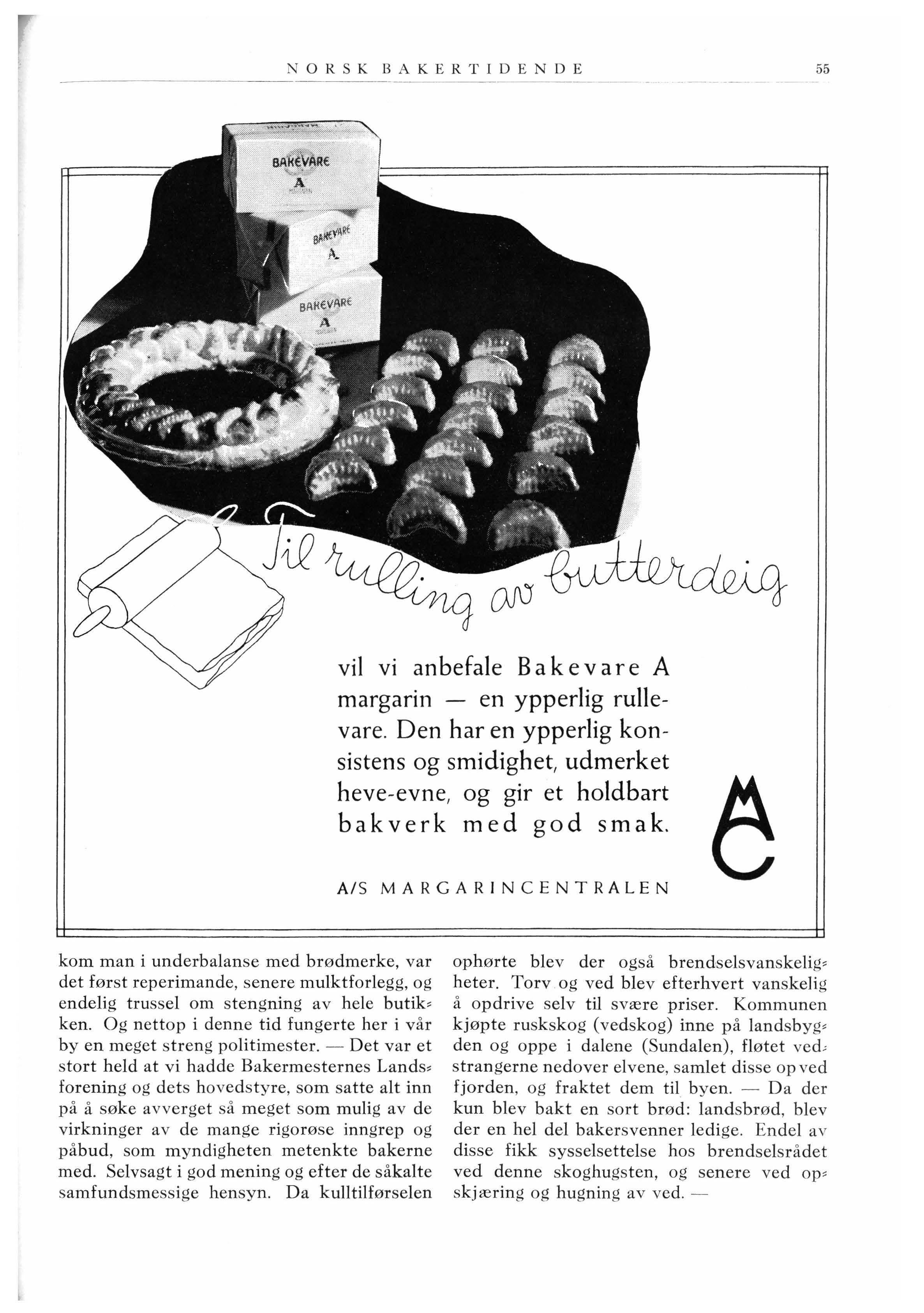 kom man i und erbalanse med brødmerke, var det først reperimande, senere mulktforlegg, og endelig trussel om stengning av hele butik , ken. Og nettop i denne tid fungerte her i vår by en meget streng politimes t er - Det var et stort held at vi hadde Bakermesternes Lands , forening og dets hovedstyre , som satte alt inn på å søke avverget så meget som mulig av de virkninger av de mange rigorøse inngrep og påbud, som myndigheten metenkte bakerne med. Selvsagt i god mening og efter de såkalte samfundsmessige hensyn Da kulltilførselen