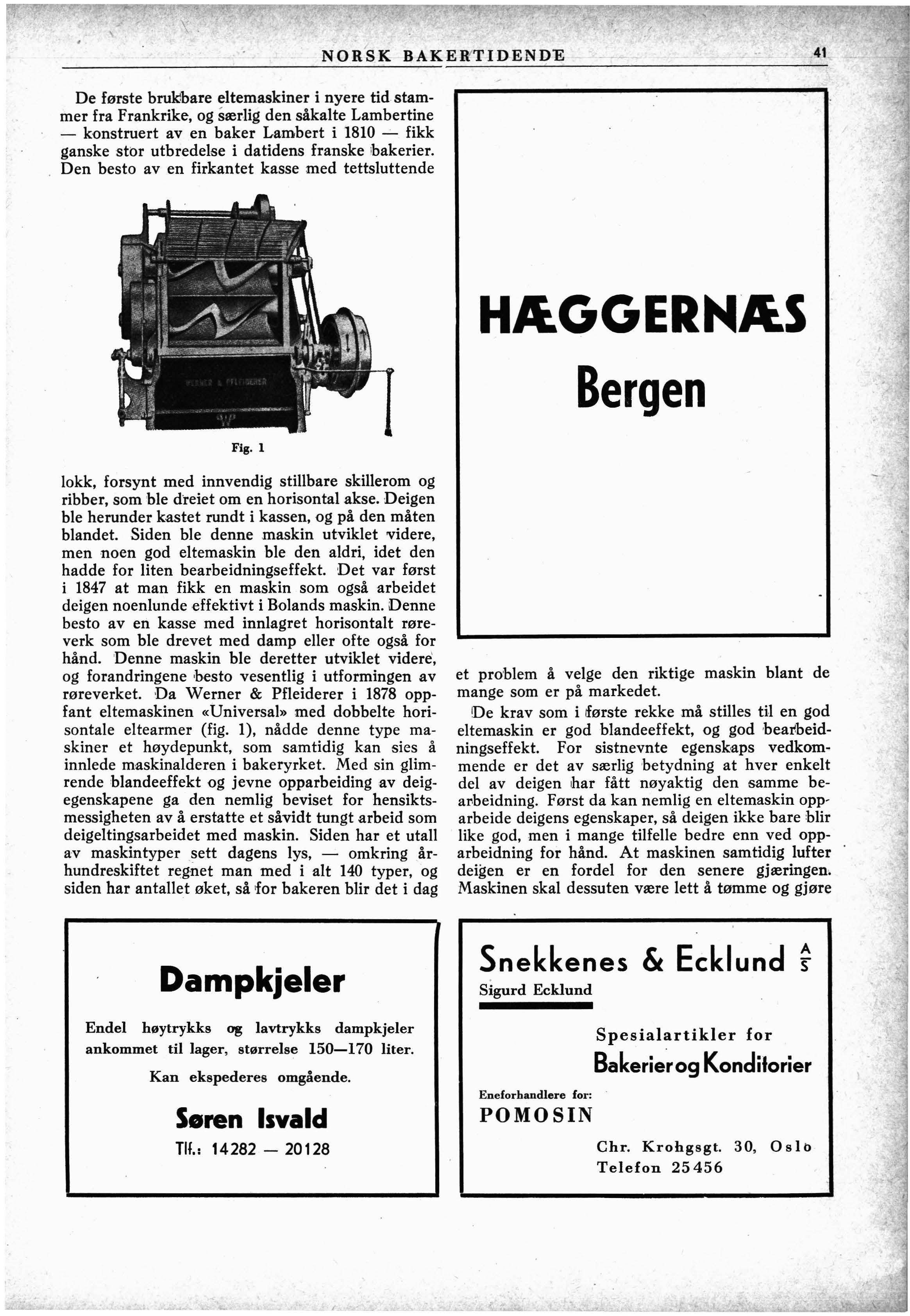 lokk, forsynt med innvendig stillbare skillerom og ribber, som ble d'reiet om en horisontal akse. Deigen ble herunder kastet rundt i kassen, og på den måten blandet. Siden ble denne maskin utviklet videre, men noen god eltemaskin ble den aldri, idet den hadde for liten bearbeidningseffekt. Det var først i 1847 at man fikk en maskin som også arbeidet deigen noenlunde effektivt i Bolands maskin. Denne besto av en kasse med innlagret horisontalt røreverk som ble drevet med damp eller ofte også for hånd. 'Denne maskin ble deretter utviklet videre', og forandringene besto vesentlig i utformingen av røreverket. Da Werner & Pfleiderer i 1878 oppfant eltemaskinen «Universal» med dobbelte horisontale eltearmer (fig. 1), nådde denne type maskiner et høydepunkt, som samtidig kan sies å innlede maskinalderen i bakeryrket. Med sin glimrende blandeeffekt og jevne opparbeiding av deigegenskapene ga den nemlig beviset for hensiktsmessigheten av å erstatte et såvidt tungt arbeid som deigeltingsarbeidet med maskin. Siden har et utall av maskintyper sett dagens lys, - omkring århundreskiftet regnet man med i alt 140 typer, og siden har antallet øket, så for bakeren blir det i dag