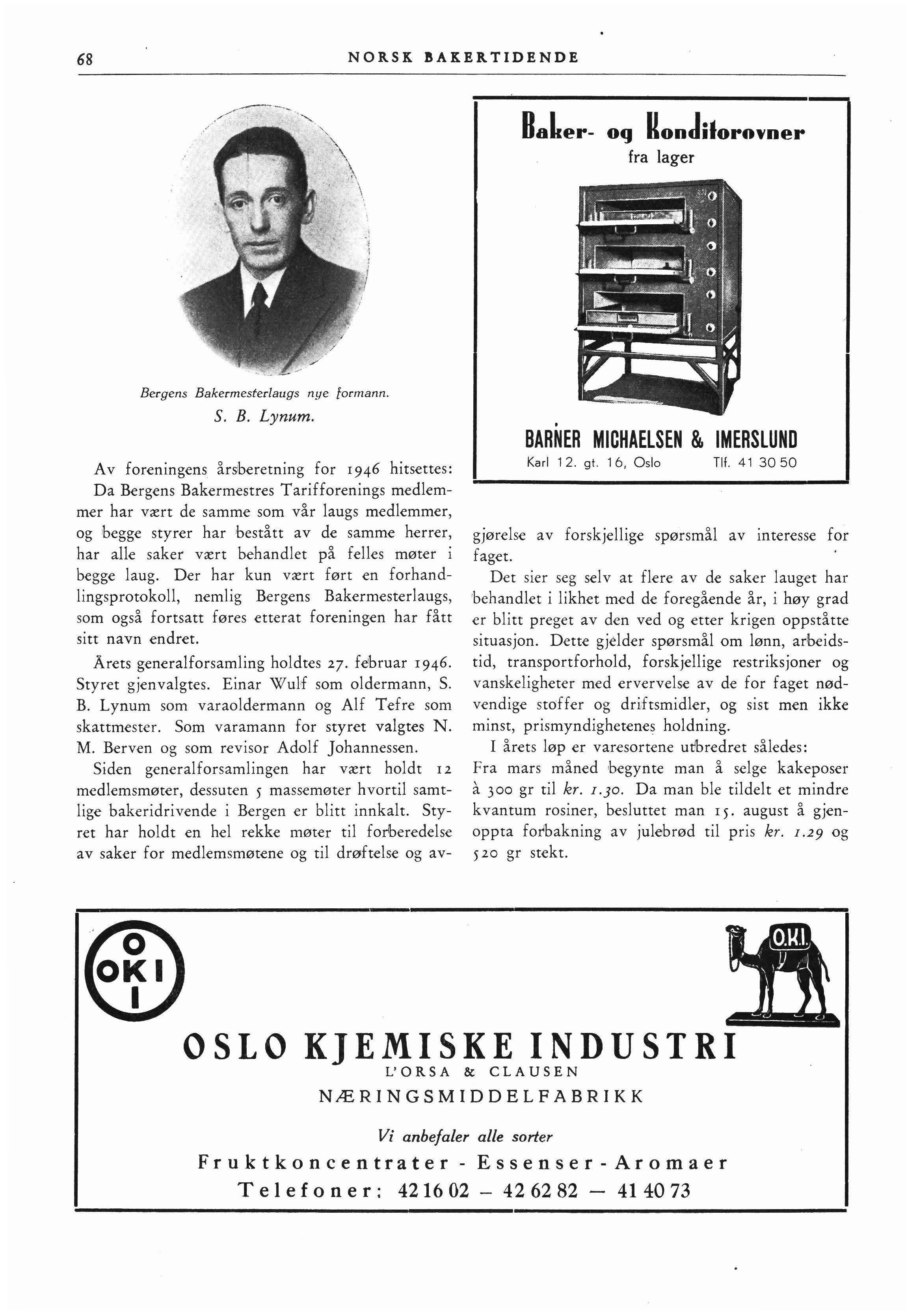 Oslo Bakerlaug holdt sin årlige generalforsamling den 19. mars 1947 under ledelse av formannen, bakermester Eugen Gundersen. Fremmøtet var bra. Formannen ønsket ·velkommen, og mintes deretter to av foreningens medlemmer, som siden siste generalforsamling er avgått ved døden, nemlig Andreas Kleven og K. H. H. Hernæs.