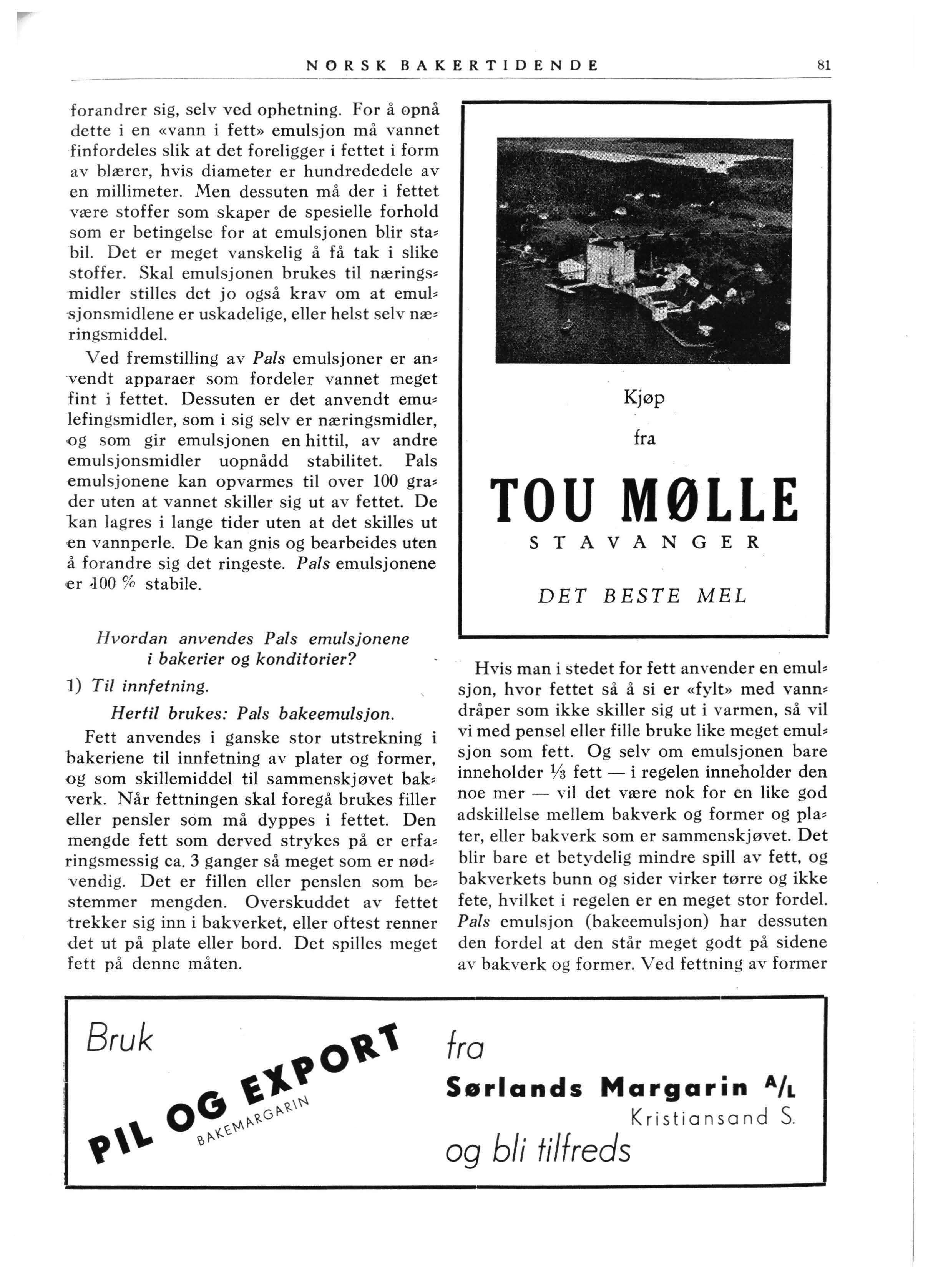 Begge disse sorter er fremstillet av A /S Pals. D a loff og rundst yk ker prakti s k talt ikke lages und er de nuværende forhold, er man blitt s t åe nde ved å fremstille bare en sort Pals Bakefettemulsjon inntil videre. Denne inneholder den fettmen g de som Landbruks• departementets forordnin g setter so m maksi• mum for bakefettemulsjoner . Den inneh ol der ca. 10 % fyllstoffer i form av glykose. Fett, mengden i denne emulsjon er så stor at den gir en tilfredsstillende mørhet i det meste bak: ve rk av rørte ma sse r se lv om alt fett erstattes med emulsjon. Bare i masser som er særlig rike p å fett f. eks. visse sorter sandkaker, kan det være hensiktsme ss ig å erstatte bare en del av fettet med bakefettblanding. Da opskrif, tene og så kan variere b ø r man prøve sig frem, og først erstatte f. eks. halvparten av fettet med bakefettblandingen. Man vil da i alle til: felle opnå et godt resultat, og kan da også lett bedømme om man kan erstatte mer av fettet med bakefettblanding, hvad man i regelen vil kunne gjøre ved de fleste sorter bakverk.