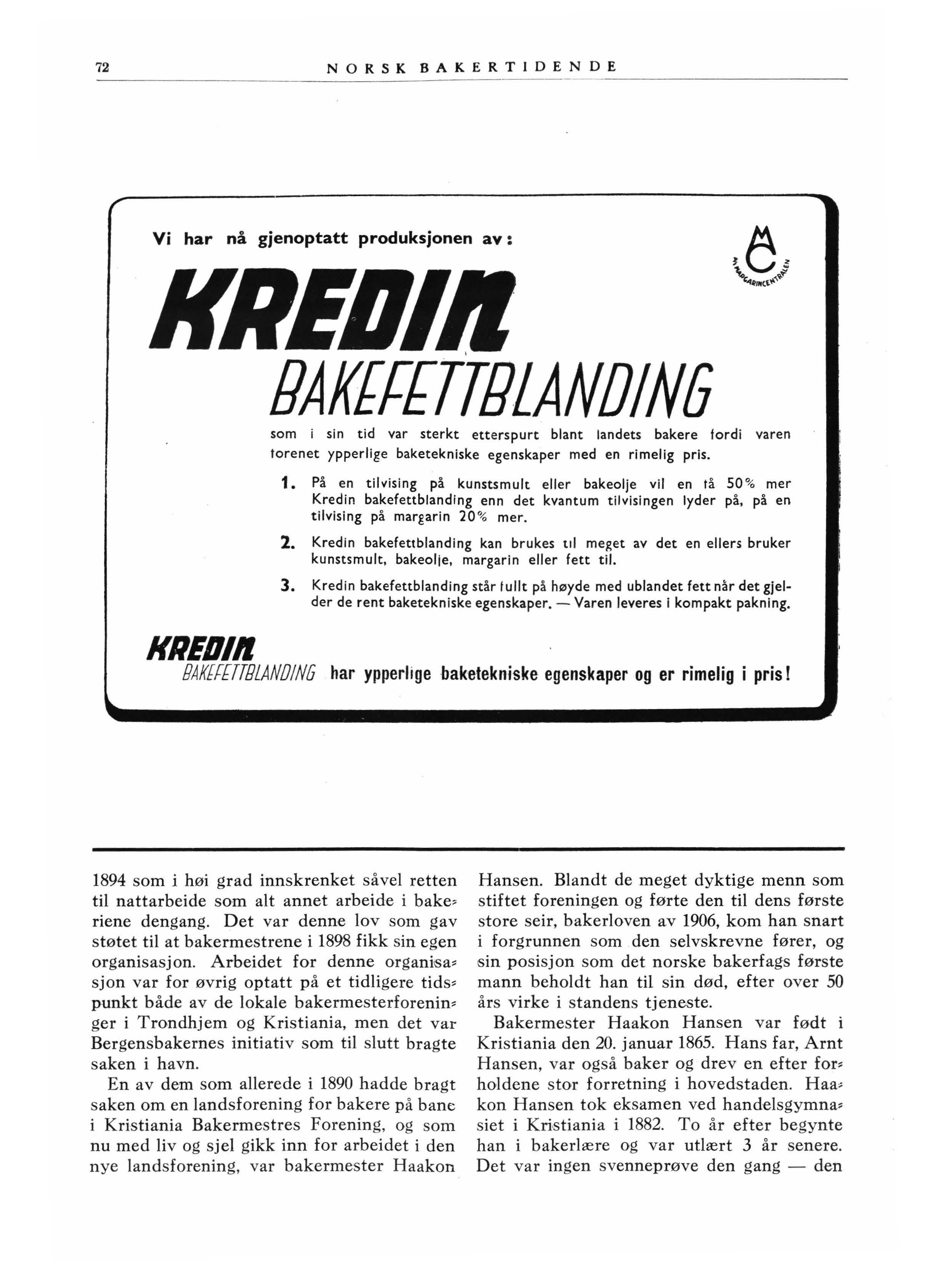 Haakon Hansen døde den 11. mai. Dødsbudskapet vil bli mottatt med vemod av alle norske bakere. Vi visste at han lenge har vært syk, men vi håpet stadig at sykdommen skulde ta en gunstig vending. Vi hadde ikke råd å miste ham, særlig ikke i denne , for vårt fag så vanskelige tid. For vel er det 16 år siden at Haakon Hansen offisielt trådte ut av de aktives rekker innen bakermesterorganisasjonene, m e n han har aldri vært passiv. Til stadighet har han stått til tjeneste når det gjåldt, og alltid øste han villig av sine erfaringers rike veid. Og hans hjerne var klar, og hans hjerte banket varmt for det yrket som han viet sitt liv og sine krefter til siste stund.