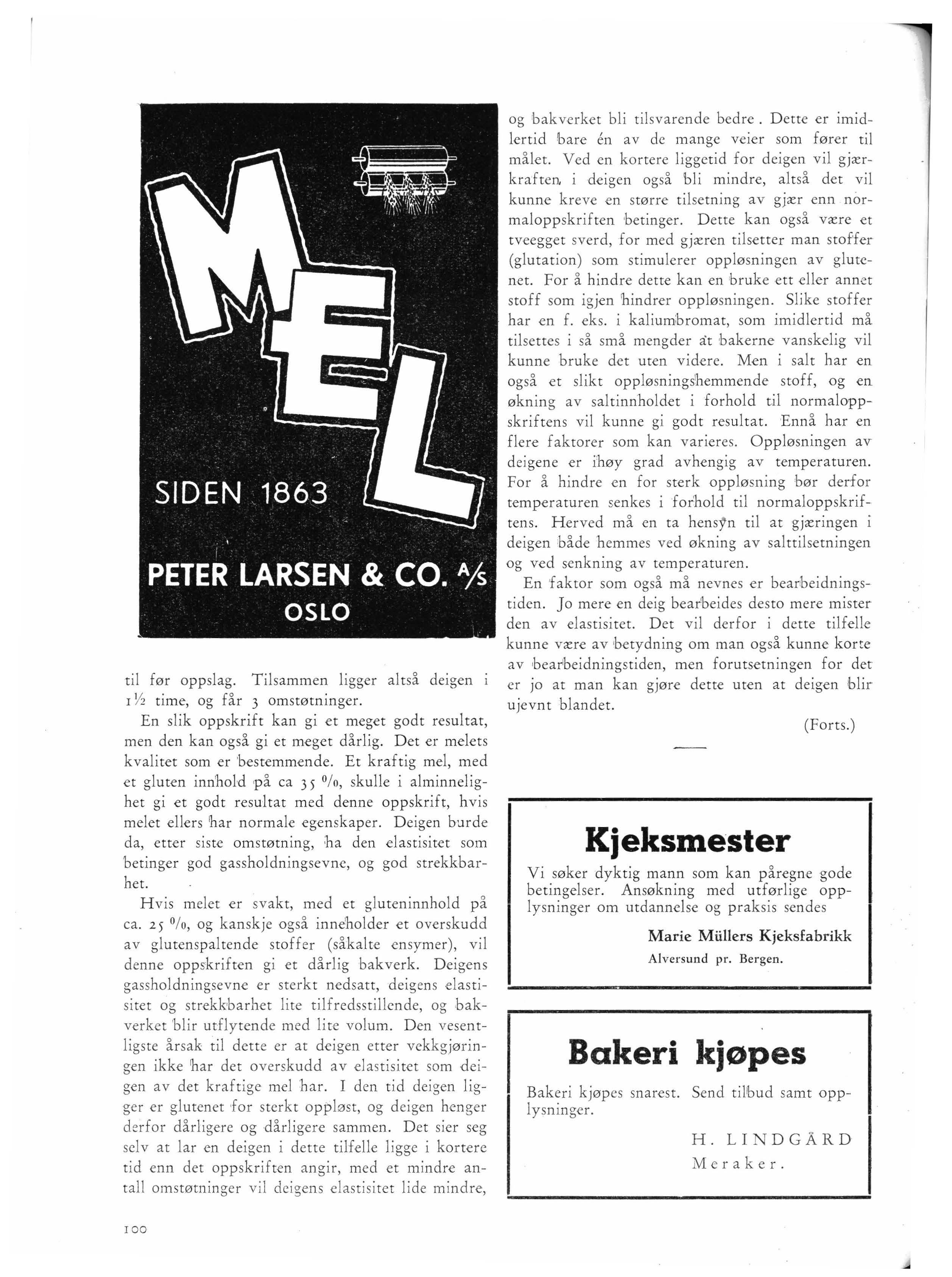 og bakverket bli tilsvarende bedre . Dette er imidlertid bare en av de mange veier som fører til målet. Ved en kortere liggetid for deigen vil gjærkraf ten, i deigen også bli mindre, altså det vil kunne kreve en større tilsetning av gjær enn normaloppskrif ten betinger. Dette kan også være et tveegget sverd, for med gjæren tilsetter man stoffer (glutation) som stimulerer oppløsningen av glutenet. For å hindre dette kan en bruke ett eller annet stoff som igjen hindrer oppløsningen. Slike stoffer har en f. eks . i kaliumbromat, som imidlertid må tilsettes i så små mengder åt bakerne vanskelig vil kunne bruke det uten videre. Men i salt har en også et slikt oppløsnings'hemmende stoff, og en økning av saltinnholdet i forhold til normaloppskrif ren s vi l kunne gi godt resultat. Ennå har en flere faktorer som kan varieres. Oppløsningen av deigene er ihøy grad avhe n gig av temperaturen. For å hindre en for sterk oppløsning bør derfor temperaturen senkes i forhold til normaloppskriftens. Herv ed må en ta hens}'n t il at gjæringen i deigen både hemmes ved økning av salt t ilsetningen og ved senkning av temperaturen.