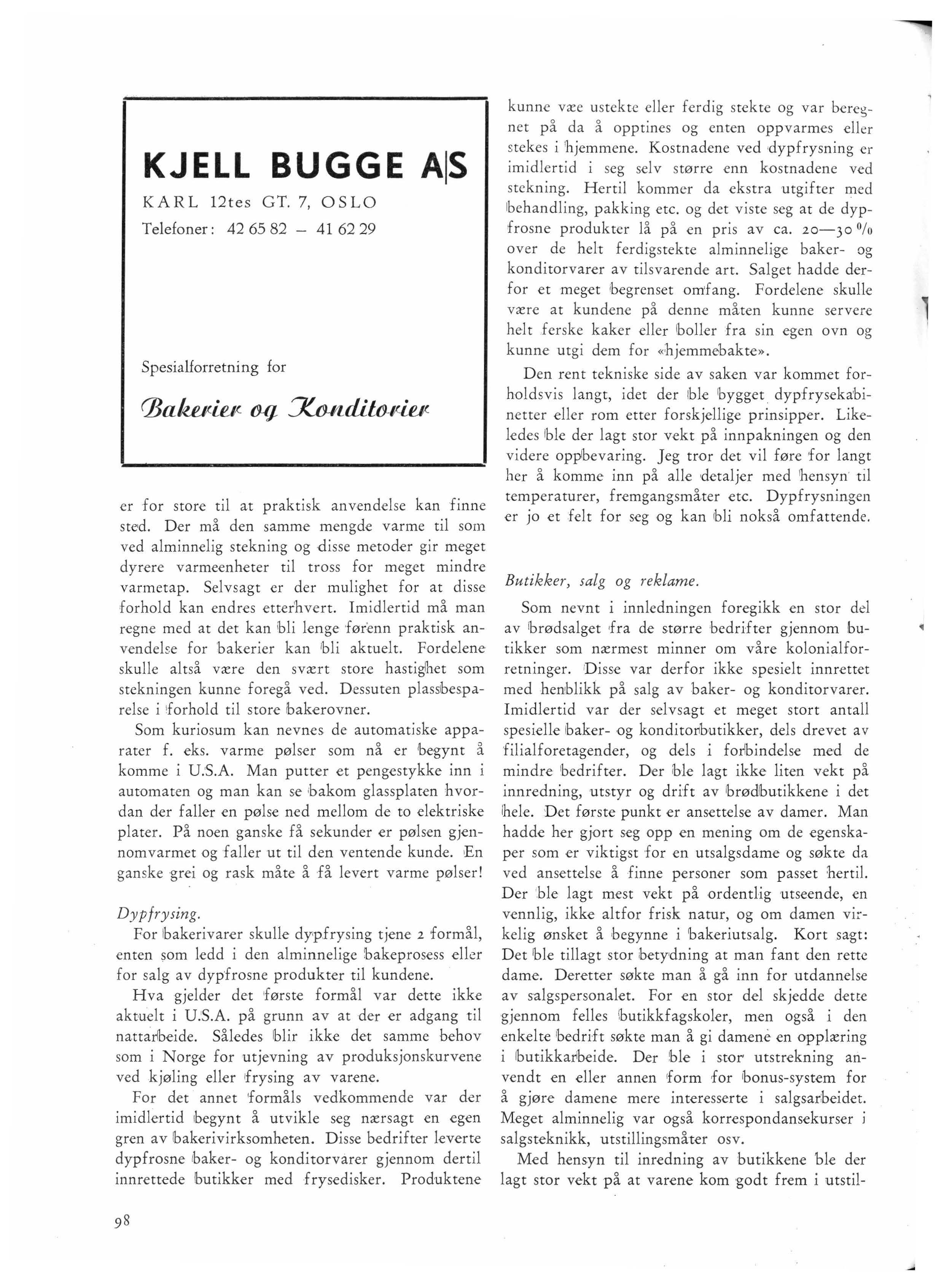 kunne væe u stekte eller ferdig stekte og var beregnet på da å opptines og enten oppvarmes eller stekes i 1hjemmene. Kostnadene ved ,dypfrysning er imidlertid i seg selv stø rre enn kostnadene ved stckning. Hertil kommer da ekstra utgifter med !behandling, pakking etc og det viste seg at de dypfrosne produkter lå på en pris av ca. 20-30 0/o over de helt ferdigstekte alminnelige baker- og konditorvarer av tilsvarende art. Salget hadde derfor et meget !begrenset omfang. Fordelene skulle være at kundene på denne måten kunne servere helt Jerske kaker eller !boller fra sin egen ovn og kunne utgi dem for «hjemmebakte ».