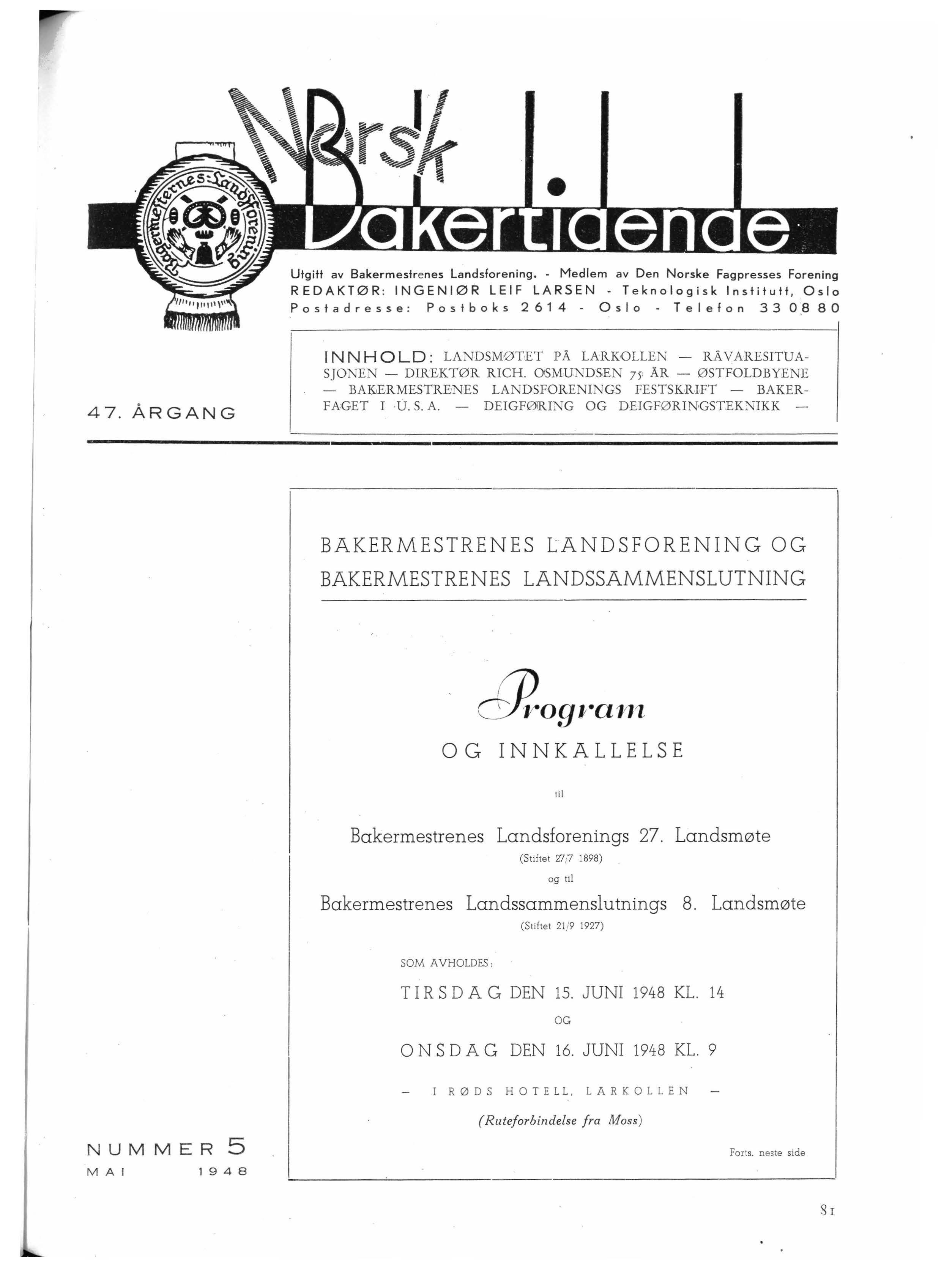 INNHOLD : L A N DSM ØTET PÅ LARKOLL EN - R Å VA R ESITUASJON E N - DIRE KTØR R ICH. OSMU N DSEN 7 5' Å R - ØSTFOL D BYEN E - BAK,ERMESTREN ES LA N DS F OR EN I N G S FE STSKRIFT - BAK E RFA GET I U.S A. - D E IGF ØIRI N G OG D E IGF Ø RI N GSTEK N IKK -