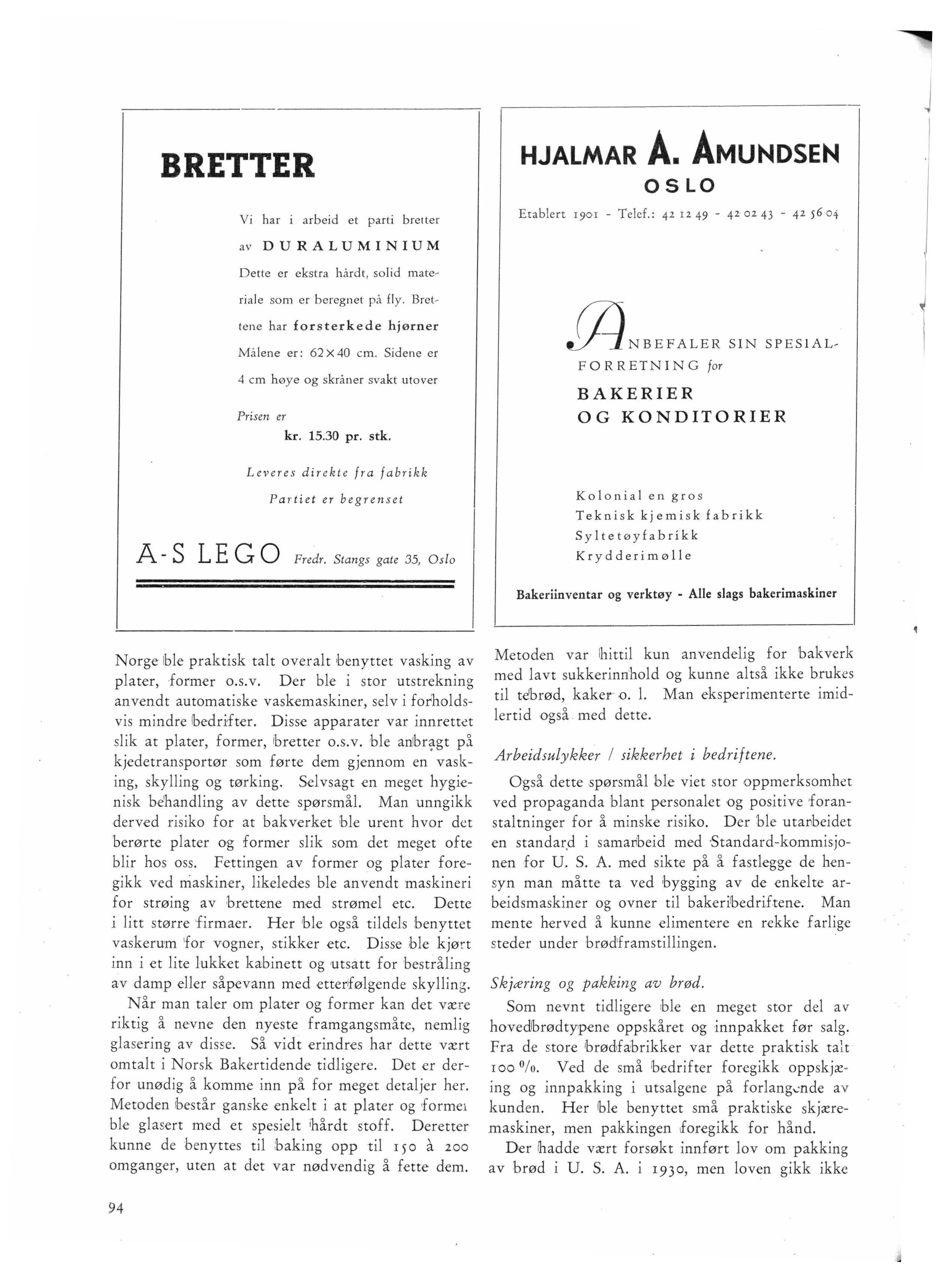 Men direktør Osmundsen trodde på laboratoriet, og dets oppgaver. Og disse trakk han stadig fram, søkte kontakt med olfifent!iglh.eten og viste at b:akningen innelbar prdblemer 'hvis løsning !hadde den største :betydning for vår næringsmiddelsforsørgning. Meget av det han la fram var ideer som var ugjennomtførlige med den viten vi har i dag. Det er nu snart 2 5 år siden han tok opp spørsmålet om en sterkere utnyttelse av poteten i lbrødihakningen. Den ideen blusser opp med jevne mellomrom•han slipper den ikke. Kanskje engang . . . . . .. I mellomtiden ihar !han gitt sitt laboratorium andre oppgaver Han har stillet til disposisjon større pengebeløp for løsning av prolblemer som ibåde angår lbakningens teknikk og brødets næringsverdi. Og problemer er løst. Direktør Osmundsen har nu den tilfredsstillelse at Kristiania Brødfaibrikks laboratorium nyter internasjonal anseelse for de arlbeider som er foretatt der. Og vi har grunn til også å være takknemlig for dette. Løsningen av de vanskene vi sto overfor da vi under krigen fikk slett tysk mel, !bygget i høy gr,ad på resultater av undersøkelser foretatt av Kristiania Brødfabrikk i årene for, og den lykkelige omstendig'het, som vi pekte på i vårt forrige nummer, at vurderingen av brødet nu er blitt mere saklig og mere løsrevet fra følelsesbetonte subjektivt kvakksalveri, har også