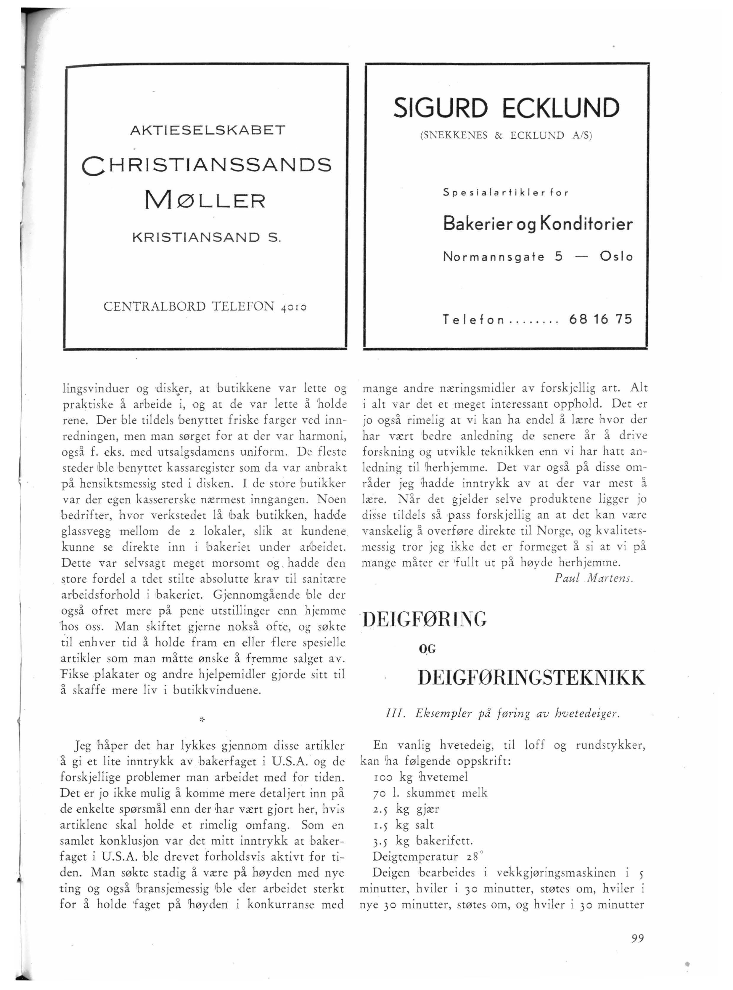 mange andre næringsmidler av forskjellig art. Alt i alt var det et meget interessant opphold. Det er jo også rimelig at vi kan ha endel å lære hvor der har vært 'bedre anledning de senere år å drive forskning og utvikle teknikken enn vi har hatt anledning til 1herhjemme. Det var også på disse områder jeg hadde inntrykk av at der var mest å lære. Når det gjelder selve produktene ligger jo di sse tildels så pass forskjellig an at det kan være vanskelig å overføre direkte til orge, og kvalitetsmessig tror jeg ikke det er formeget å si at vi p å mange måter er 1fullt ut på høyde herhjemme. Paul Martens.