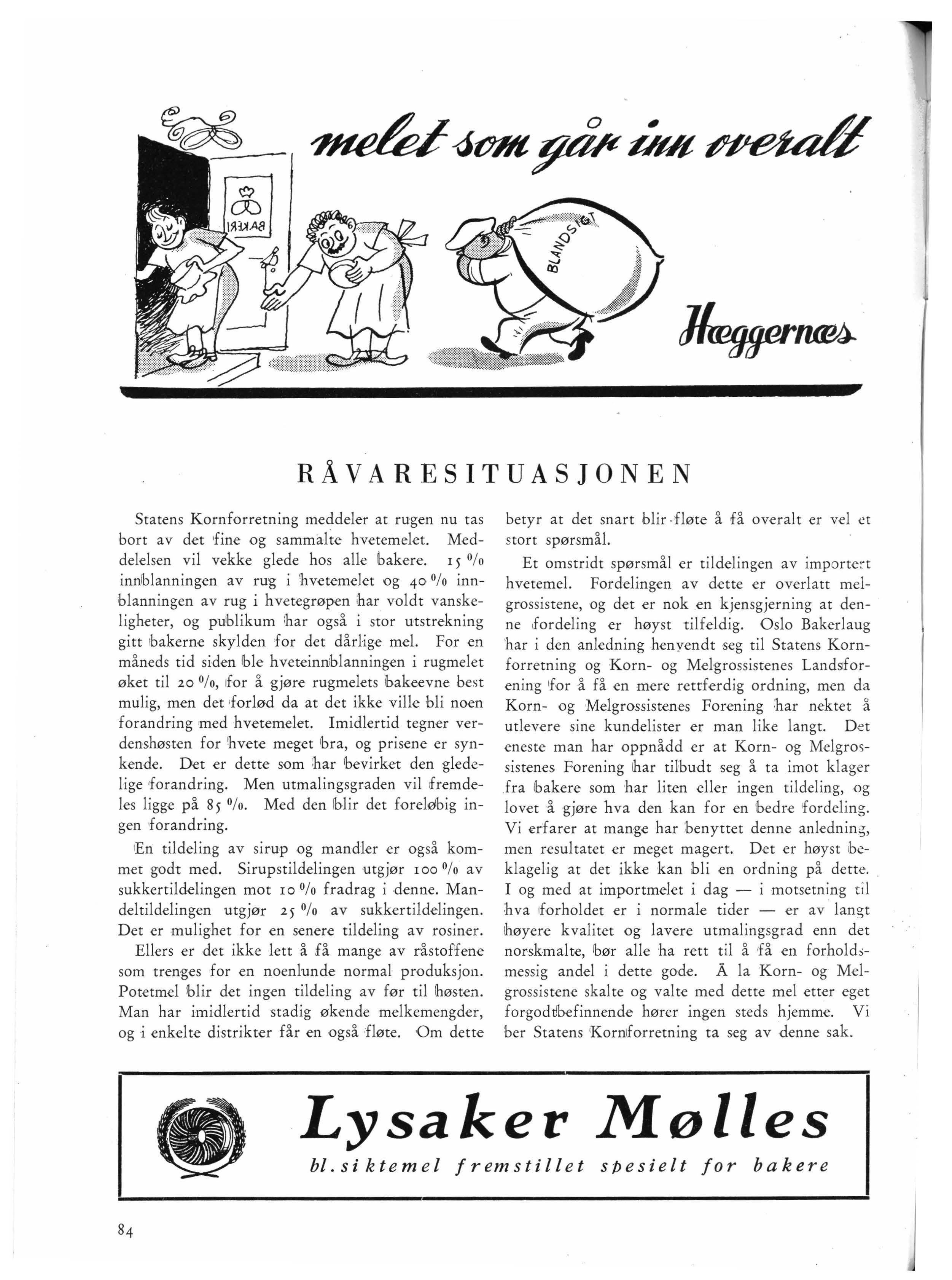 Et omstridt spørsmål er tildelingen av importe r t hvetemel. Fordelingen av dette er overlatt meigrossistene, og det er nok en kjensgjerning at denne fordeling er høyst tilfeldig. Oslo Bakerlaug 'har i den anledning henyendt seg til Statens Kornforretning og Korn- og Melgrossistenes Landsforening for å få en mere rettferdig ordning, men da Korn- og Melgrossistenes Forening har nektet å utlevere sine kundelister er man like langt . D e t eneste man har op pn ådd er at Korn- og Melgrmsistenes Forening ihar tilbudt seg å ta imot klager fra lbakere som har liten eller ingen tildeling, og lovet å gjøre hva den kan for en lbedre fordel i ng Vi erfarer at mange har :benyttet denne anledning, men resultatet er meget magert. Det er høyst beklagelig a t det ikke kan bli en ordning på dette I og med at impor tm elet i dag - i motsetning til hva forholdet er i normale tider - er av langt ihøyere kvalitet og lavere utmalingsgrad enn det norskmalte, bør alle ha rett til å få en forhold;mes,sig andel i dette gode. Å la Korn- og Melgrossistene skalte og valte med dette mel et ter eget forgodtlbefinnende hører ingen steds hjemme. Vi ber Statens Korniforre tnin g ta seg av denne sak.