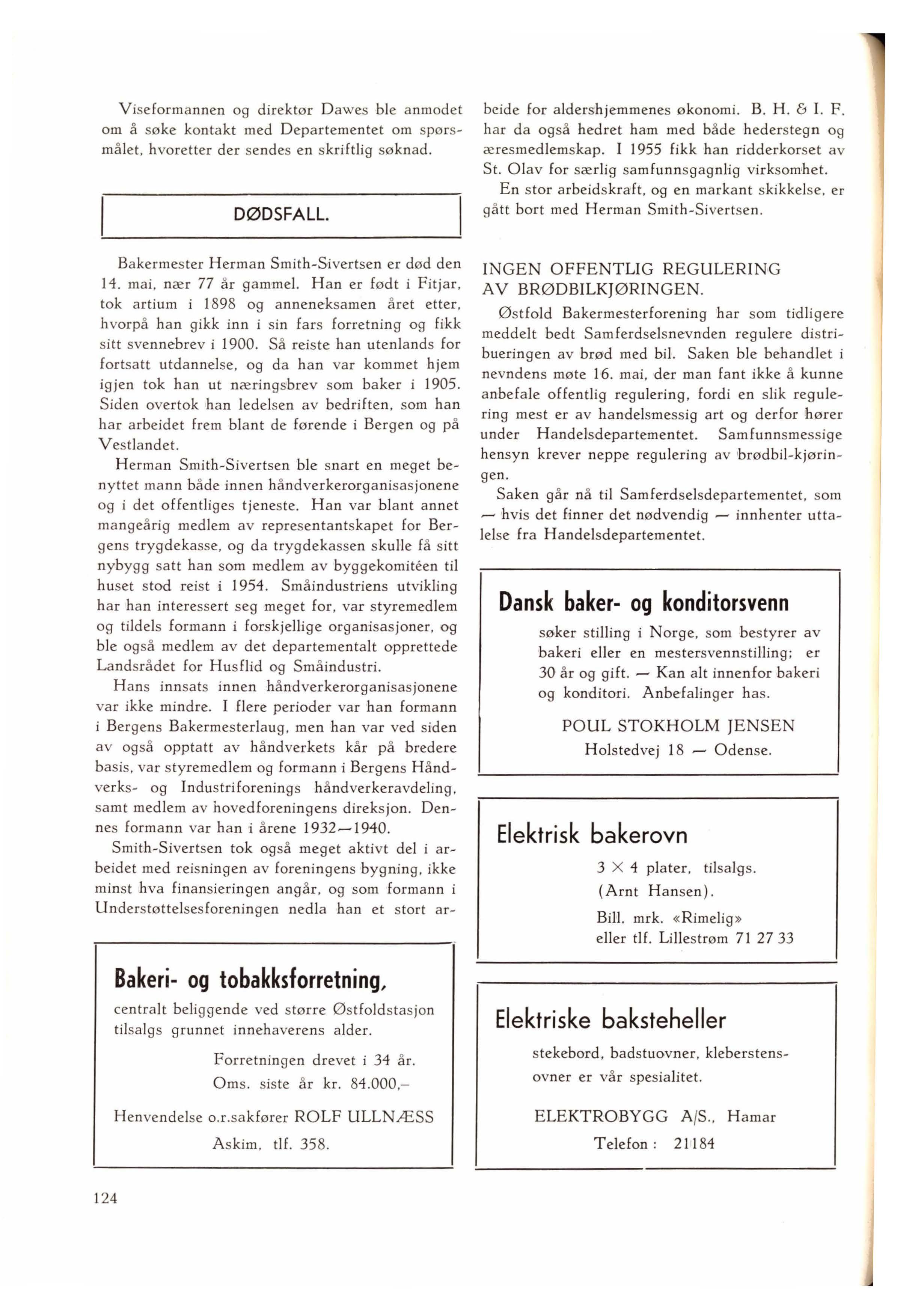 B a kerme s ter Herman Smith-Sivertsen er død den 14 mai , nær 77 år gammel. Han er født i Fitjar , tok artium i 189 8 og anneneksamen å ret etter , h v orp å han gikk inn i sin far s forretning og fiikk s itt s v ennebre v i 1900 S å reiste han utenland s for fort s att utdannelse , og da han var kommet hjem igjen tok han ut n æ ring s bre v som baker i 1905 Siden overtok han ledel s en av bedriften , som han h a r arbeidet frem blant de førende i Bergen og på Ve s tlandet.