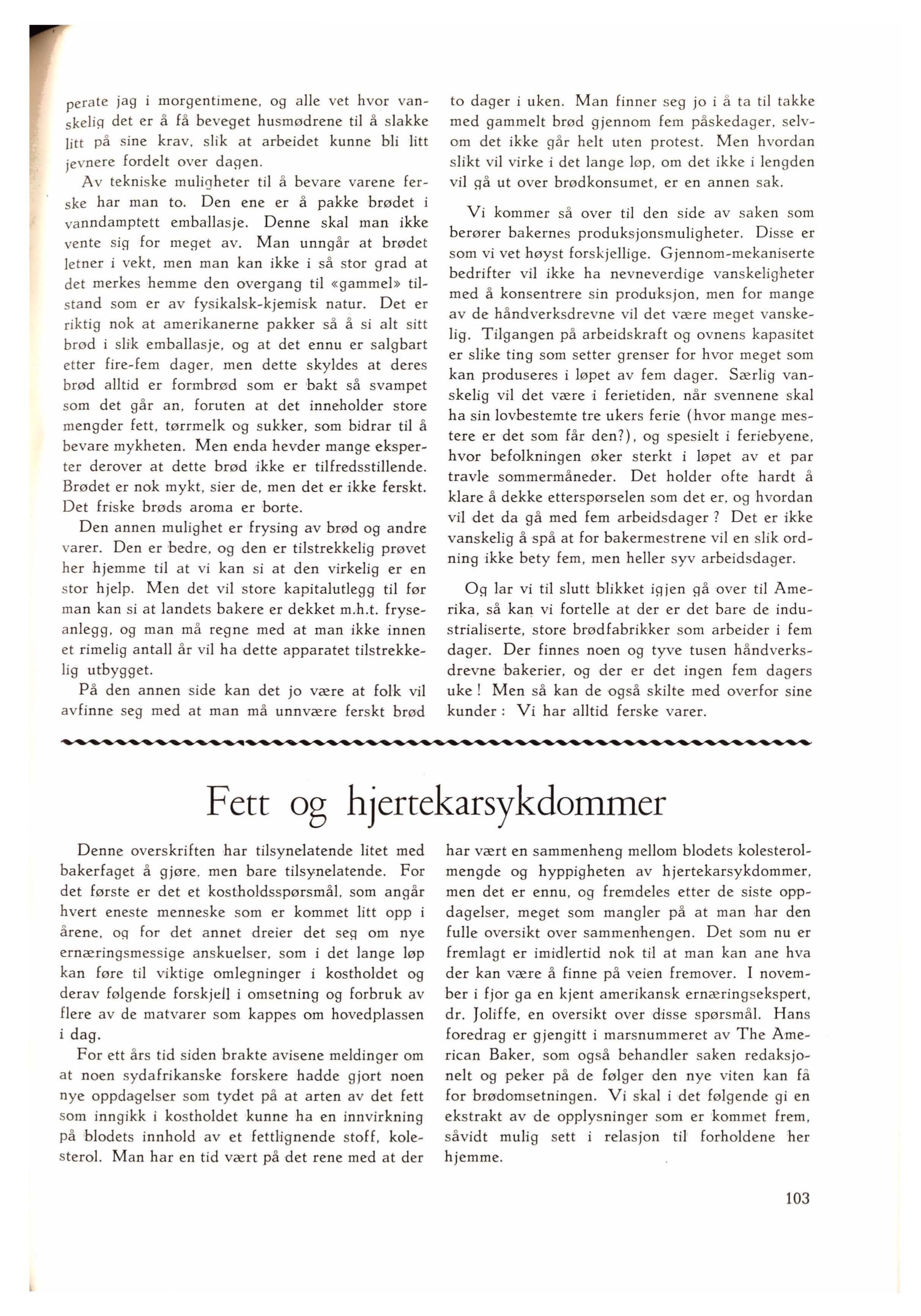 har vært en sammenheng mellom blodets kole s terolmengde og hypp igheten a v hjertekarsykdommer , men d et er ennu , og fremdeles etter de si s te oppdagel s er , meget som m a ngler p å at man ,har den fulle o v ers ikt o v er samm e n1hen g en Det s om nu er fremlagt er imidlertid nok til at man k a n a ne h va der kan være å finne p å veien frem ov er I november i fjor ga en kjent amerikans1k ernæring s ek s pert , dr JoHffe, en oversikt over disse s pør s m å l. Hans foredrag er gjengitt i m a r s nummeret av The American Baker , som og så behandler sa ken red a k s jonelt og peker p å de følger den n y e v iten k a n få for brø·dom s etningen. Vi sk a l i det følgende gi en ek s trakt av de opplysninger s om er kommet frem , s åvidt mulig s ett i rela s jon til forh o ld e ne her hjemme