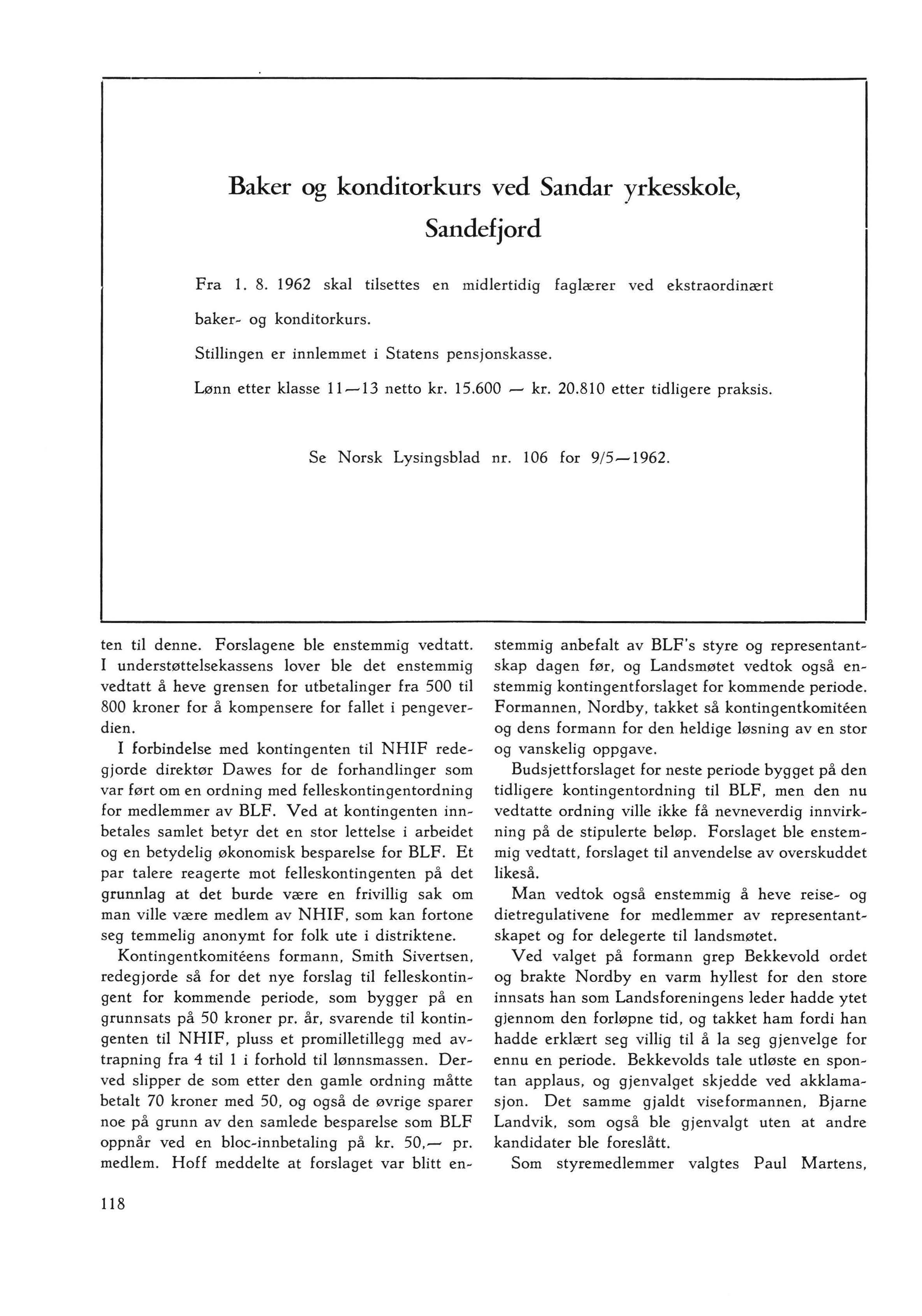 Fra 1. 8. 1962 skal tilsettes en midlertidig faglærer ved ekstraordinært baker- og konditorkurs.