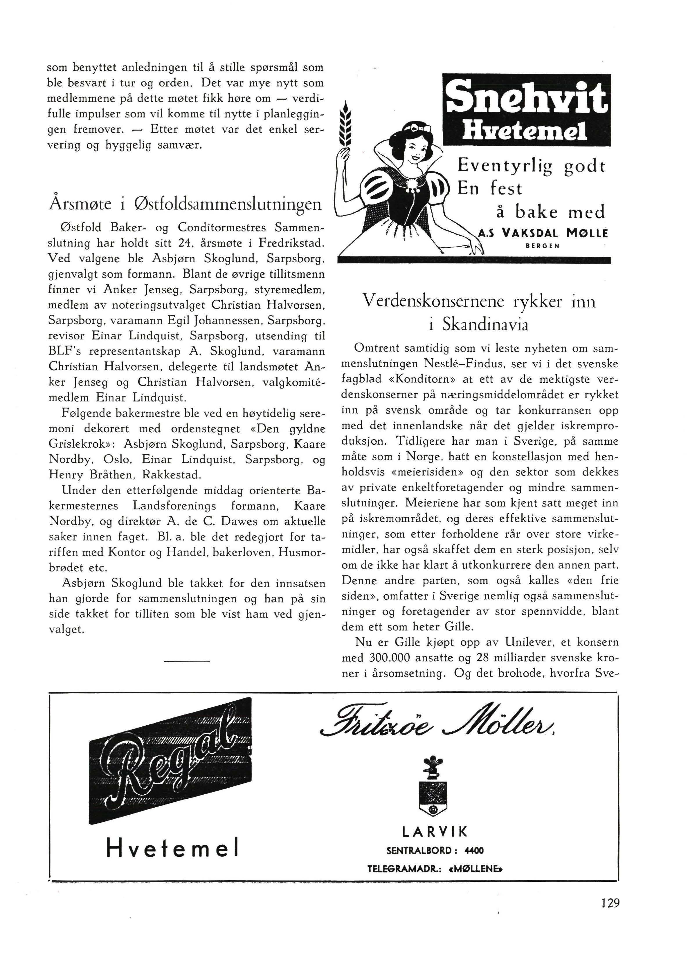 Under eventuelt kom Holte tilbake til saken om fellesreklame og brødinstitutt. Andre matvaregrupper har i mange år bygget på stadig reklame, mens bakervarene, som ikke har hatt noe tilsvarende, er gått tilbake. De midler som nu disponeres bør brukes på et solid grunnlag så man får mest mulig ut av dem. Taleren anså saklig opplysning om brødets fordeler, som de ernæringssakkyndige nu også er blitt oppmerksom på, som det beste middel, og han mente at erfaringene med det svenske brød-